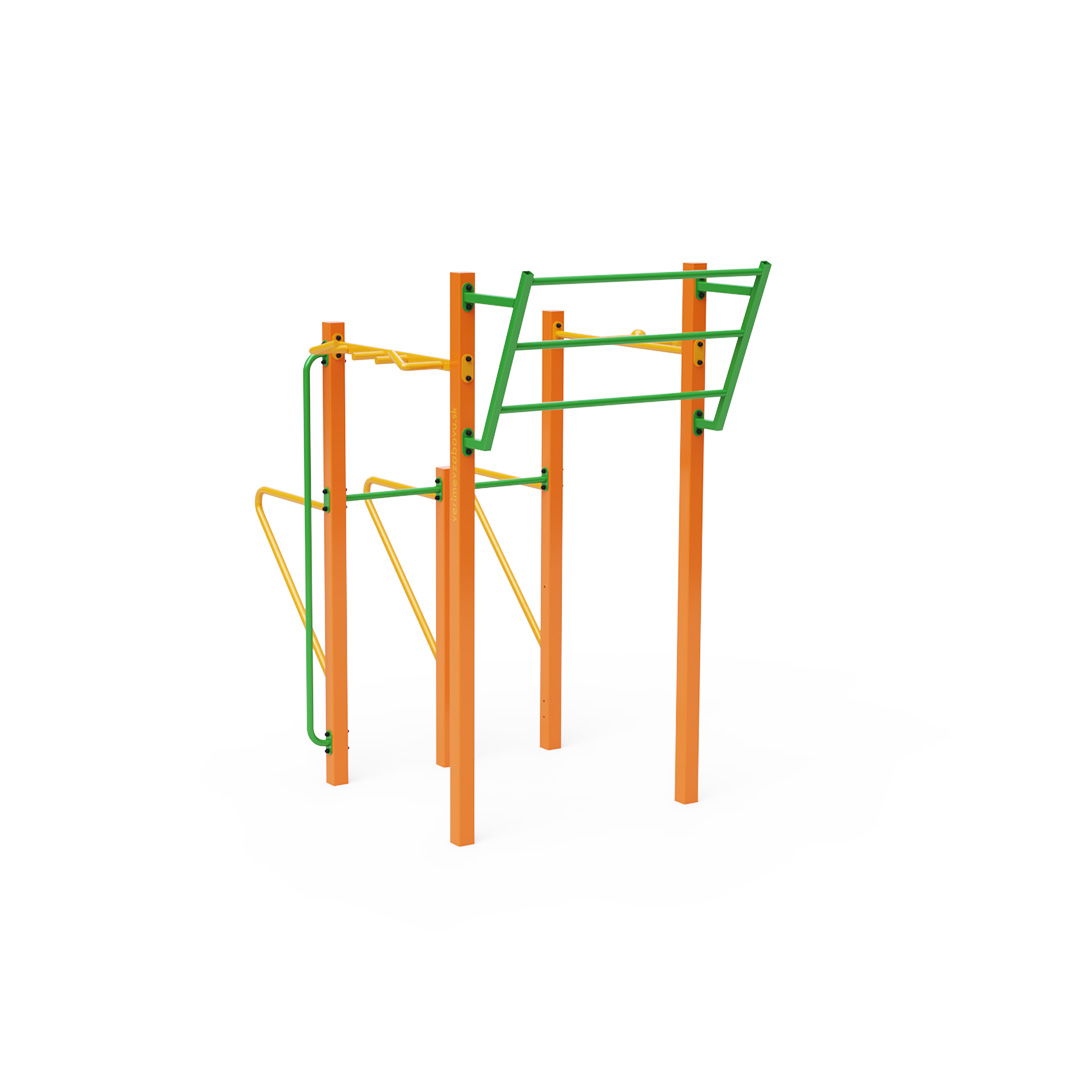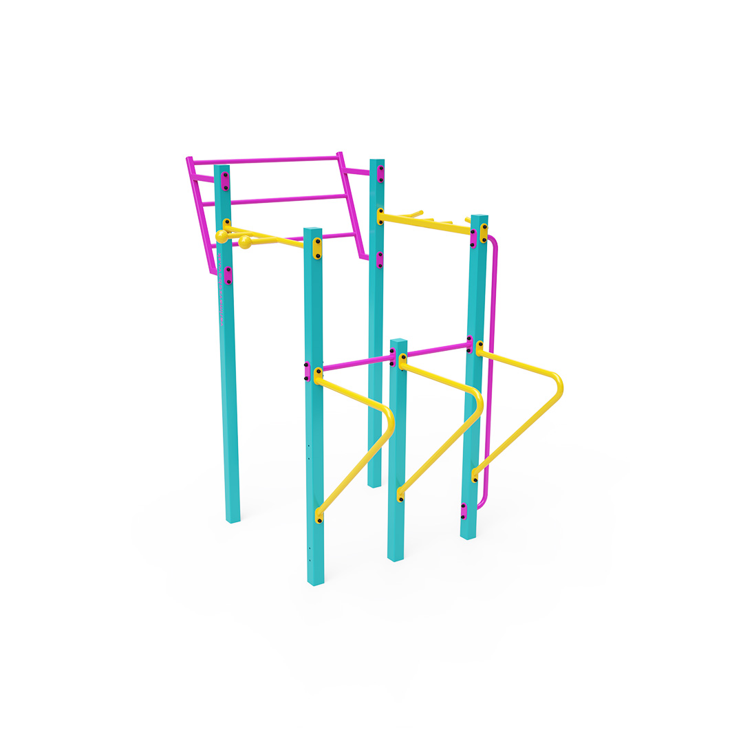 Workout is an increasingly popular form of outdoor exercise that primarily uses one's body weight. The diversity of exercises enabled by workout equipment and setups, combined with the fresh air environment, makes the activity varied and engaging. This not only benefits physical health but also contributes to mental well-being.This smaller set includes a vertical bar, horizontal bars, and an inclined wall bar, complemented by double parallel bars.