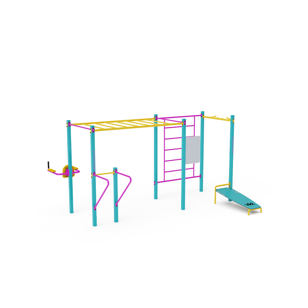 Workout is an increasingly popular form of outdoor exercise that primarily uses one's body weight. The diversity of exercises enabled by workout equipment and setups, combined with the fresh air environment, makes the activity varied and engaging. This not only benefits physical health but also contributes to mental well-being.This smaller set includes a bar, a horizontal ladder, a vertical ladder, parallel bars, a sit-up bench, and an abdominal exerciser.