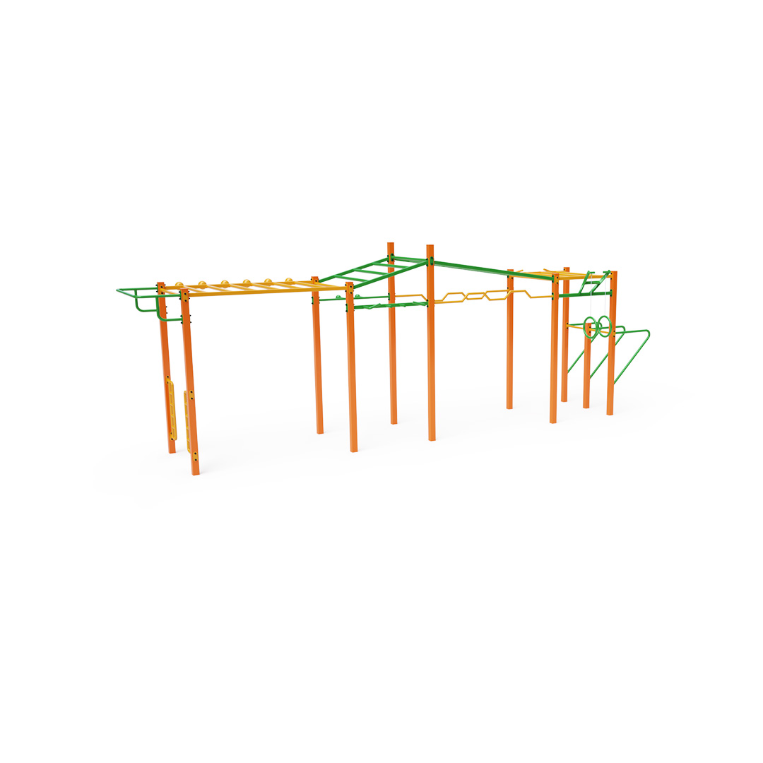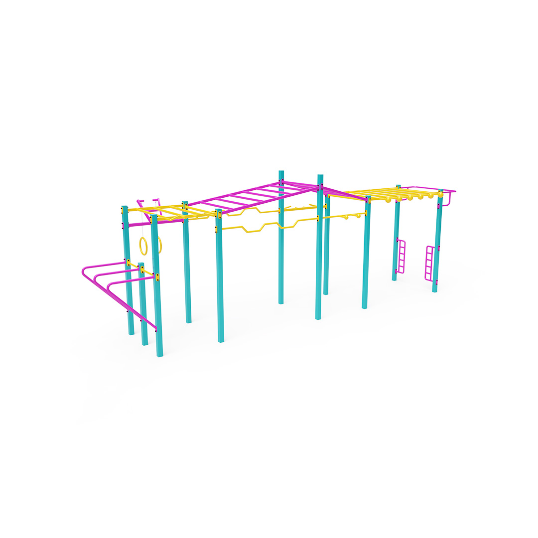 Workout is an increasingly popular form of outdoor exercise that primarily uses body weight. The exercise is diverse due to the fresh air environment and the wide range of exercises that the workout elements and setups allow. It benefits not only physical but also mental well-being.A large setup with various configurations of horizontal bars, parallel bars, and horizontal ladders, complemented by rings and a vertical ladder for push-ups.