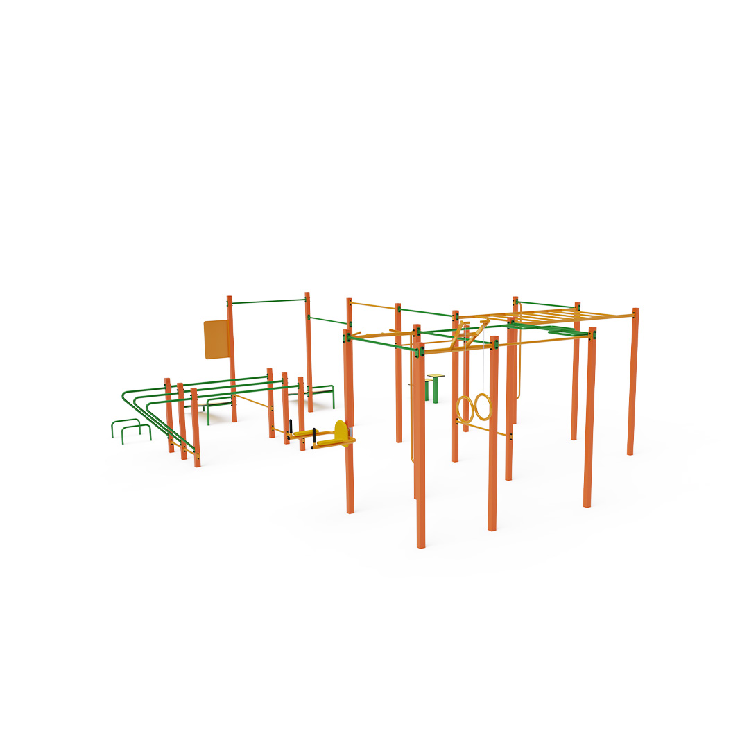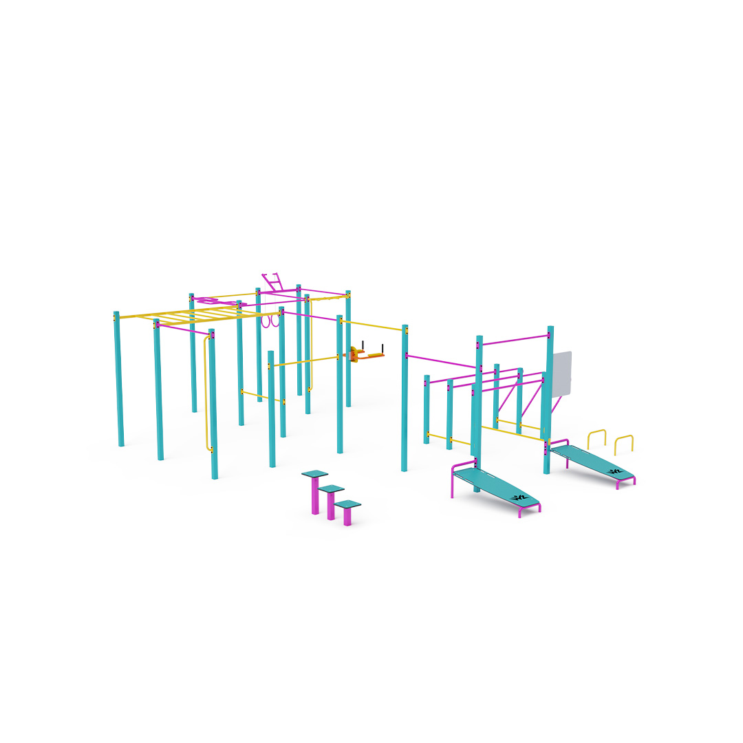 Workout is becoming an increasingly popular way to exercise outdoors, primarily utilizing body weight. Exercise is varied thanks to the fresh air environment and the wide range of exercises that workout elements and setups allow. It thus benefits both physical and mental well-being.A large setup with horizontal bars of various heights, a vertical bar, parallel bars, and a horizontal ladder is complemented by a multi-segment bar, a multi-grip bar, and a sit-up bench.