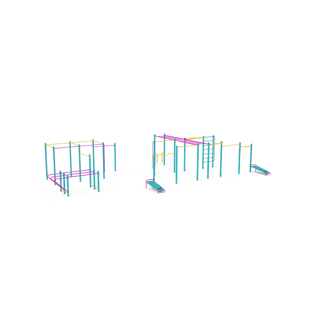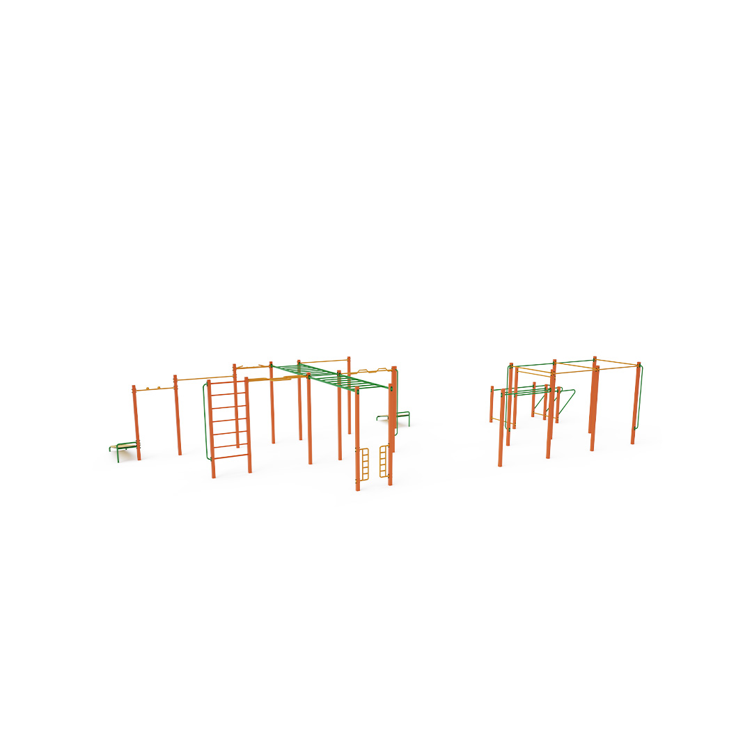 Street workout is becoming an increasingly popular way to exercise outdoors, primarily utilizing body weight. The exercise is diverse thanks to the fresh air environment and the wide range of exercises that workout elements and setups allow. It benefits not only physical but also mental well-being.The large setup includes horizontal bars at various heights, vertical bars, dip bars, and both horizontal and vertical ladders. It is complemented by a bar with semi-circles and two sit-up benches.