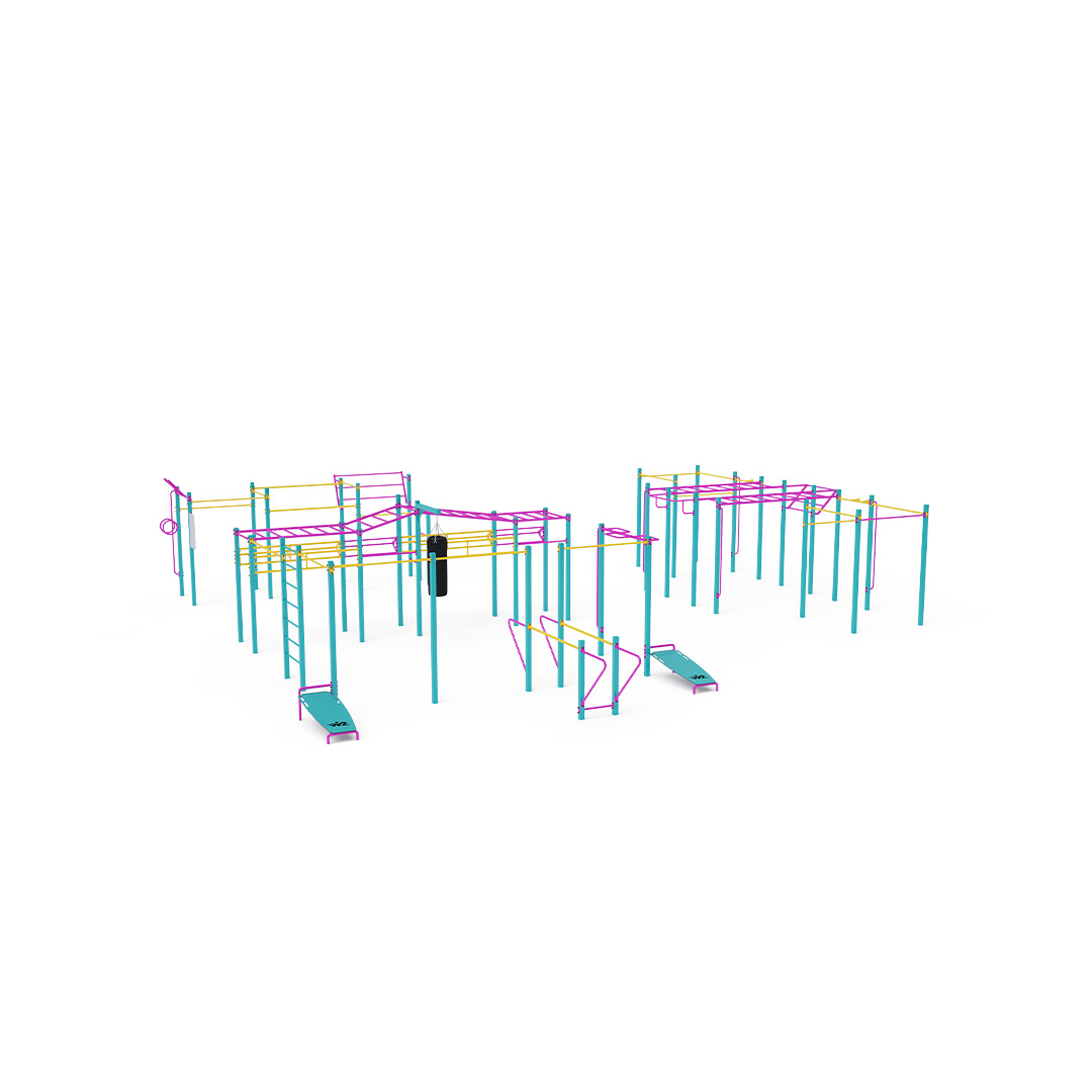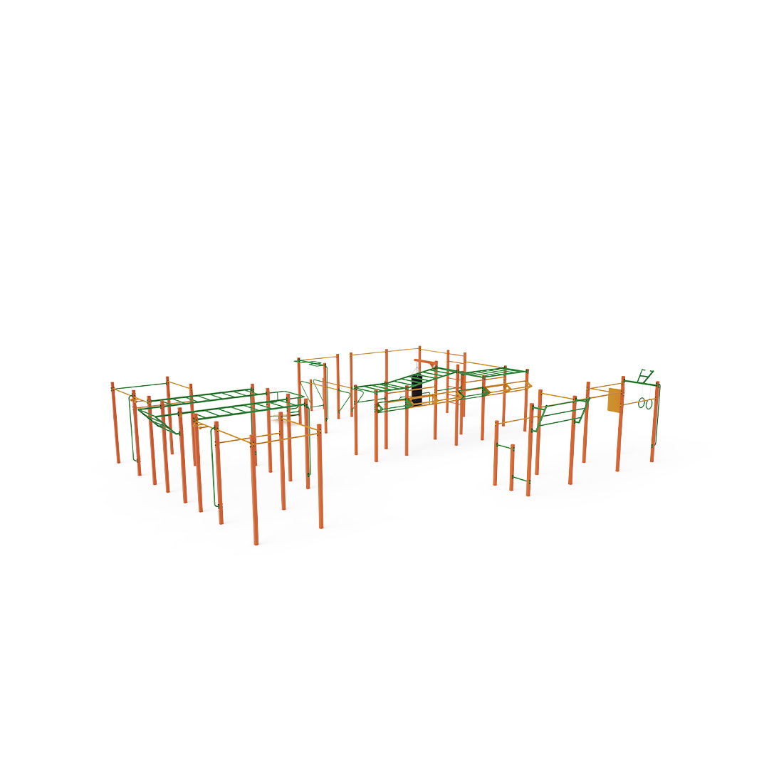 Workout is increasingly becoming a popular way to exercise outdoors, primarily using body weight. The exercise is varied due to the fresh air environment and the wide range of exercises that workout elements and setups allow. It benefits not only physical but also mental well-being.This large setup includes horizontal bars of various heights, vertical bars, dip bars, double and triple bars, horizontal ladders, and a vertical ladder. It is complemented by a multi-segment bar, bars with balls, an angled bar, an extended bar, angled ladders, gymnastic rings, a punching bag, and sit-up benches.