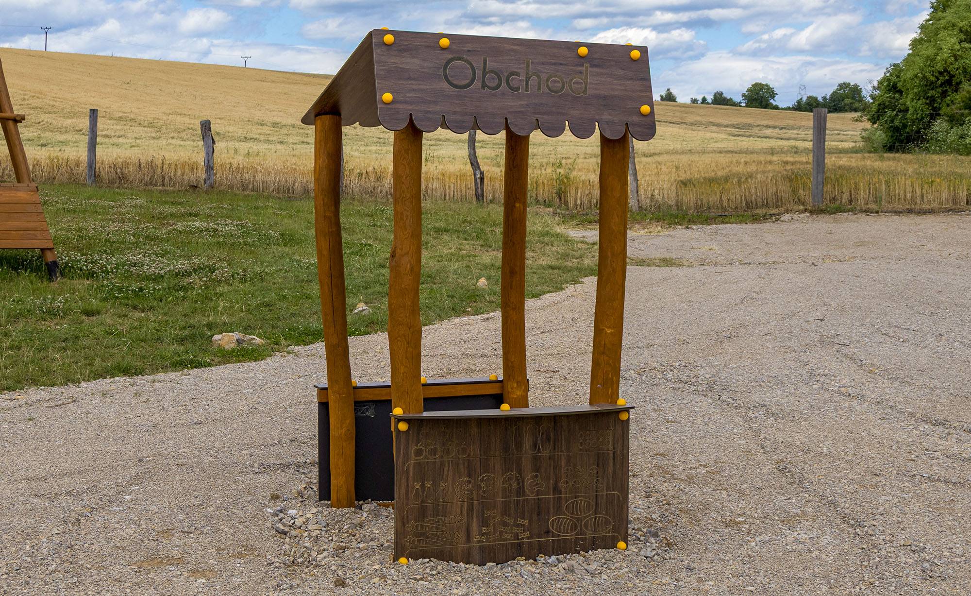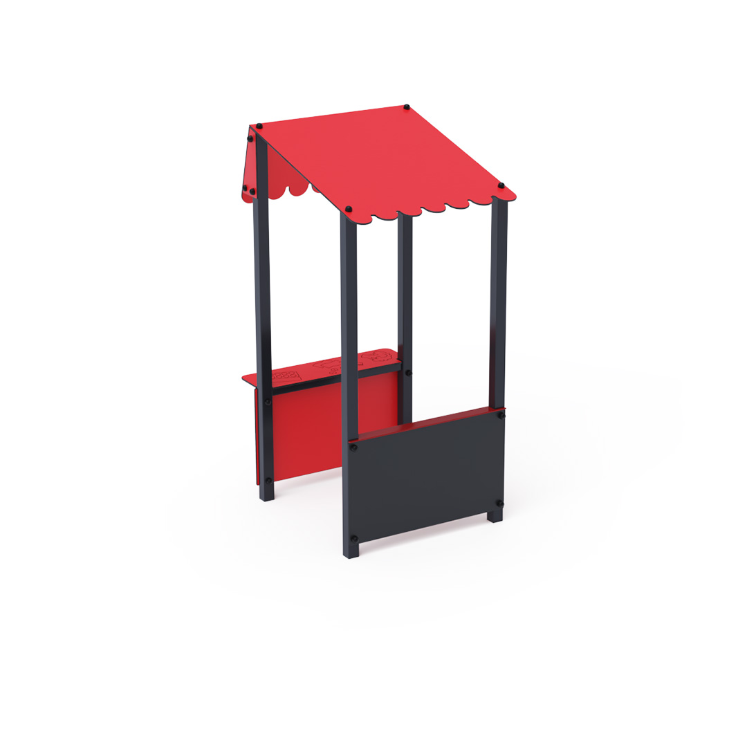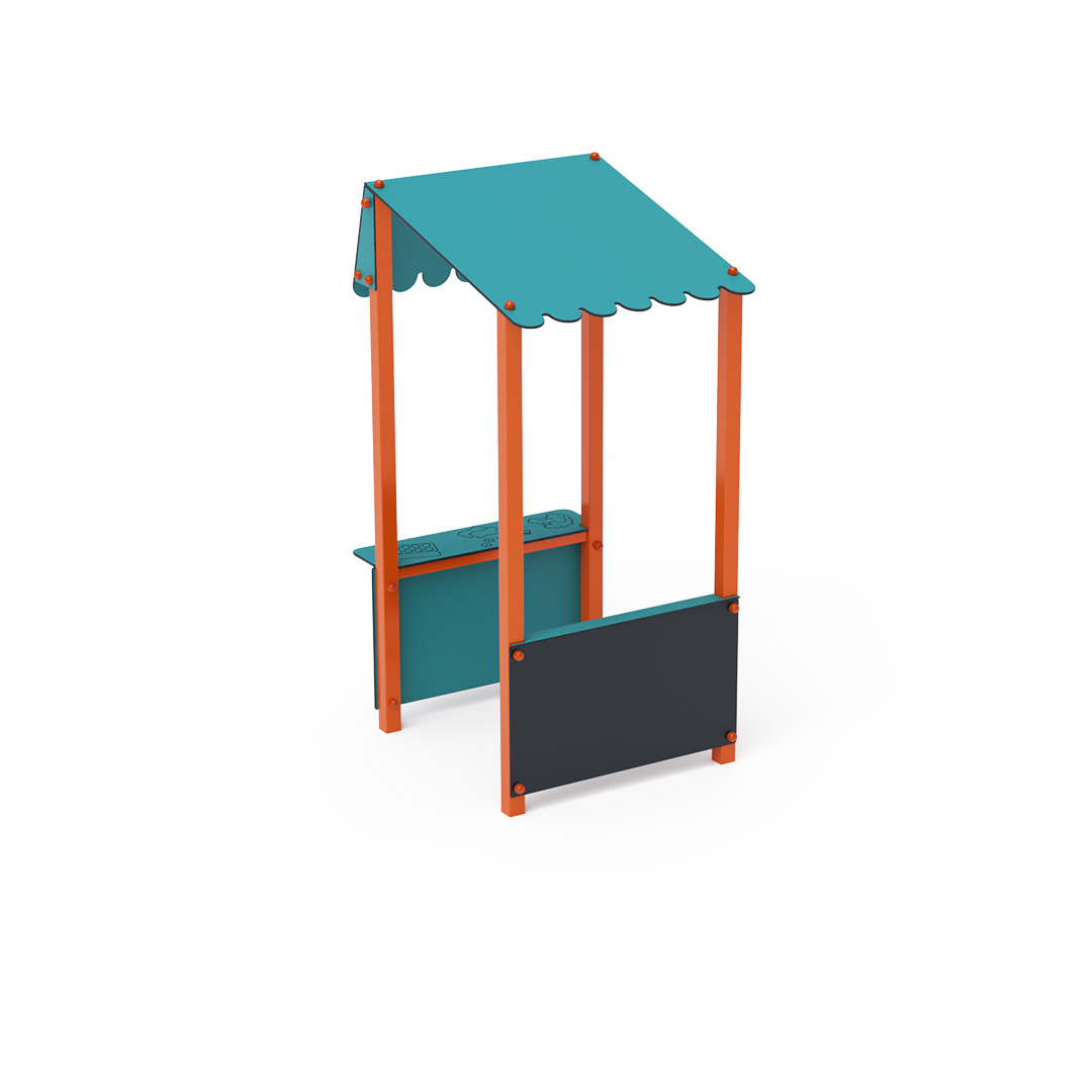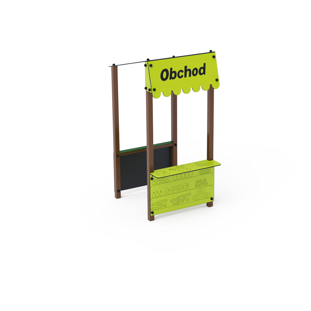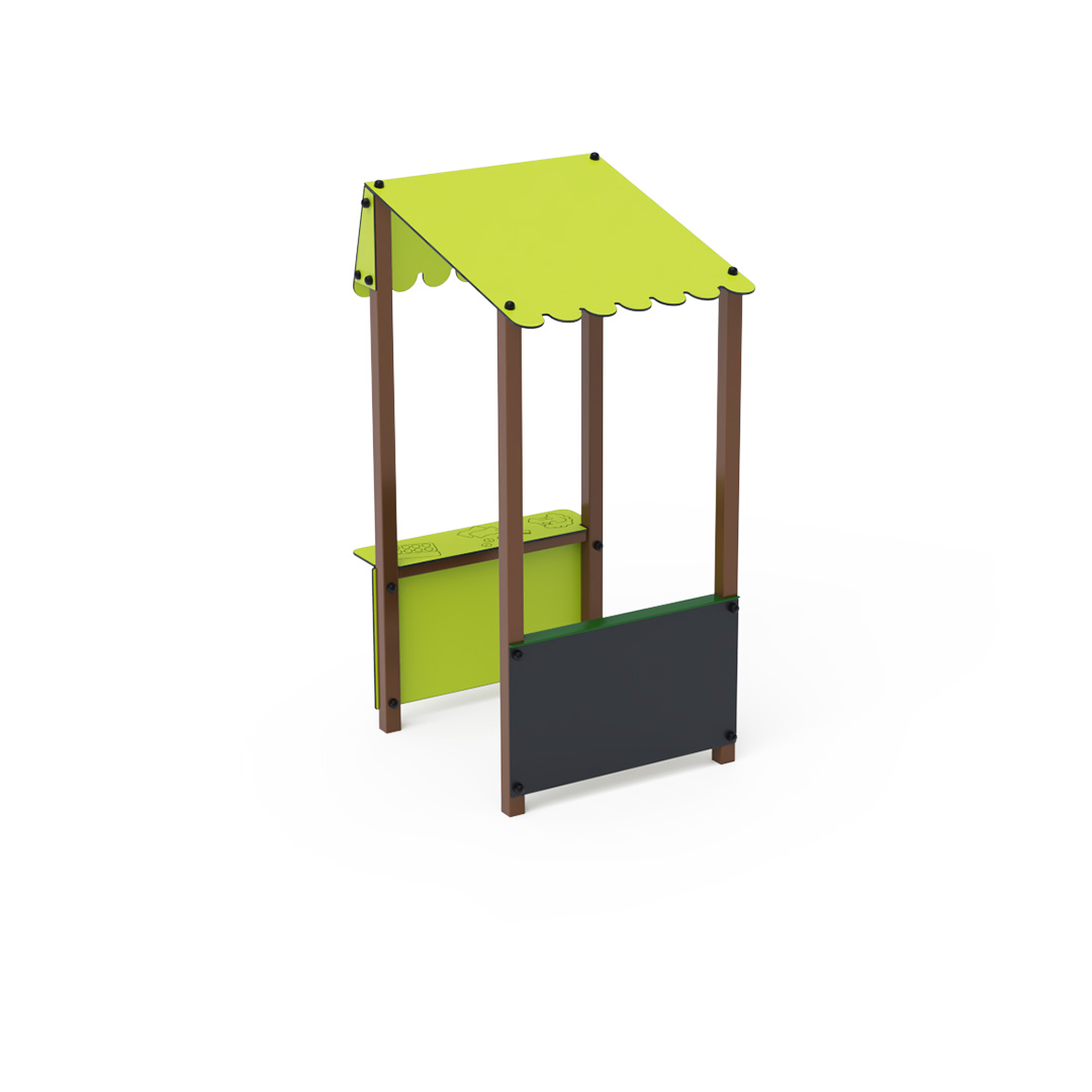 Thematic playhouse in the form of a small shop is an ideal play element for fostering children's imagination and math skills. The house, featuring a sloping roof, a signboard, and a counter, is complemented by a drawing board and a display board depicting common products. The construction of the play set is made from galvanized and powder-coated steel. All boards are made from HPL (High Pressure Laminate) material, which is UV-resistant, color-fast, non-toxic, and shatterproof. All joints are stainless steel and covered with plastic caps.