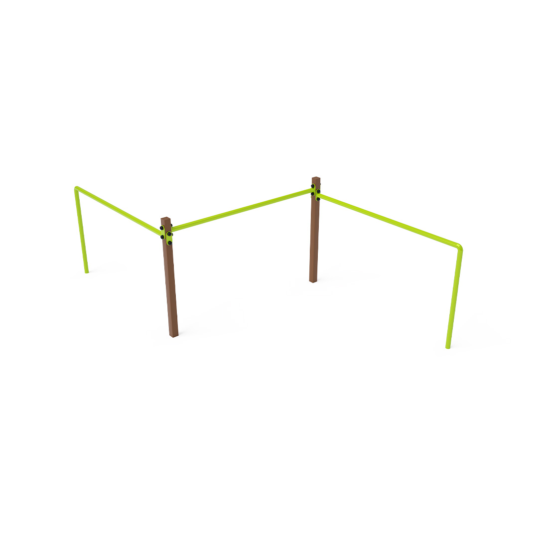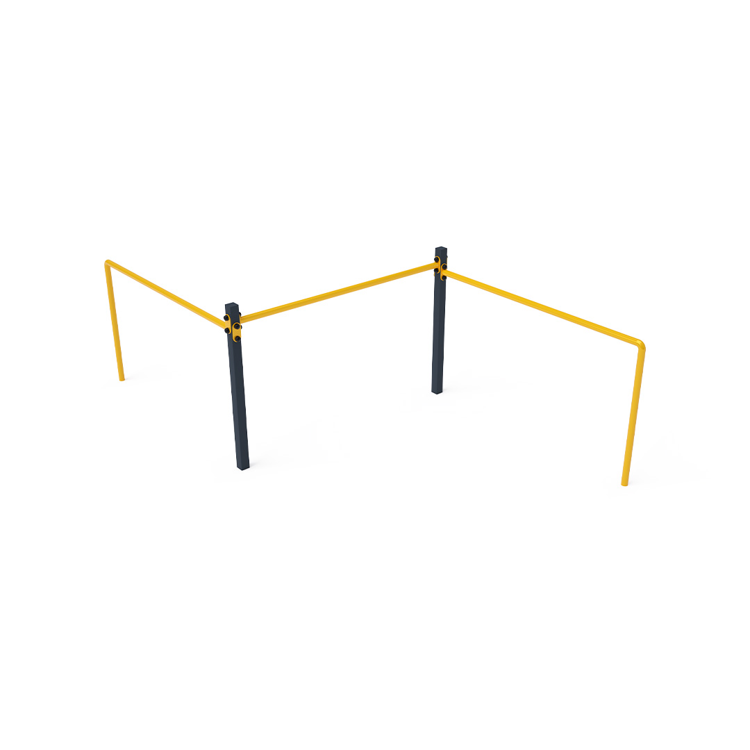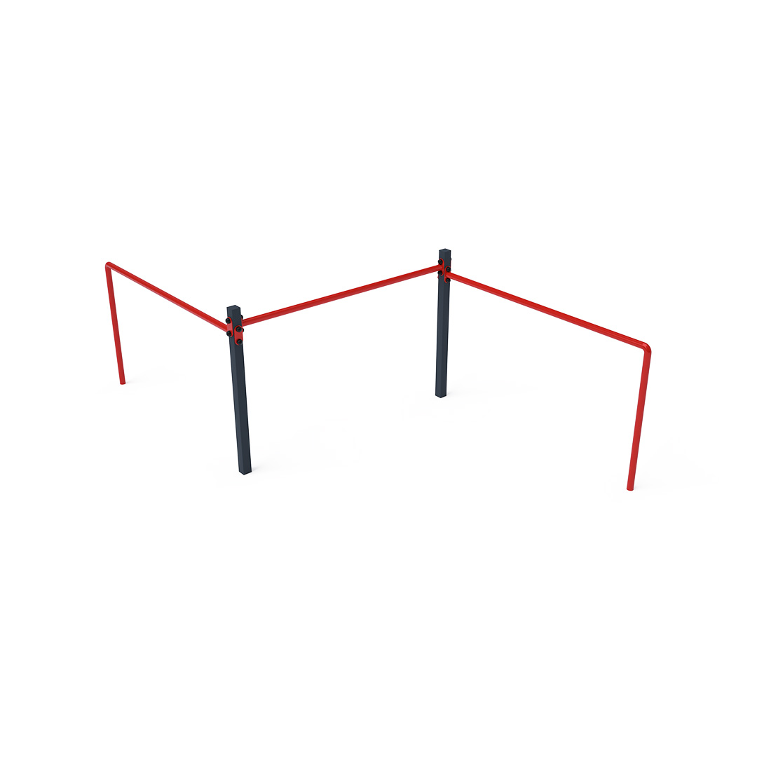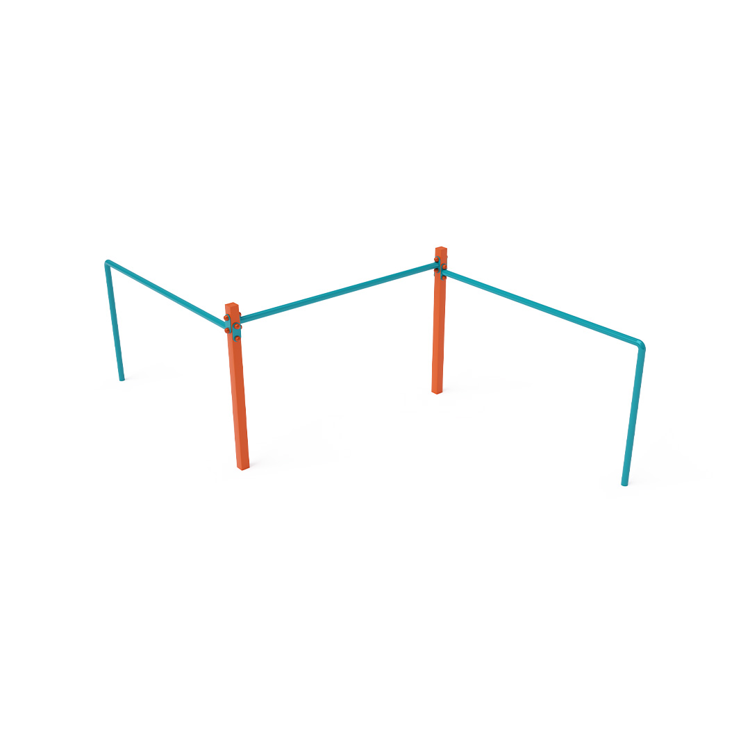 Maintenance-free triple balance bar is a playground feature that helps children develop their strength, fitness, and agility. Each bar has a different height to accommodate both larger and smaller children. It is made of hot-dip galvanized steel, coated with powder-baked paint. Stainless steel fasteners are used and are protected with covers to enhance their lifespan and safety. A grassy surface can be used as an impact-absorbing area, although we recommend using a grass reinforcement grid for safety.