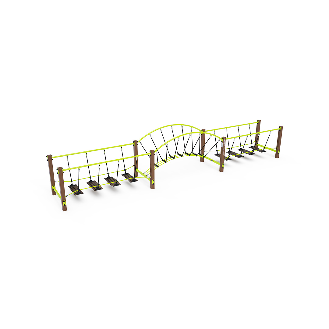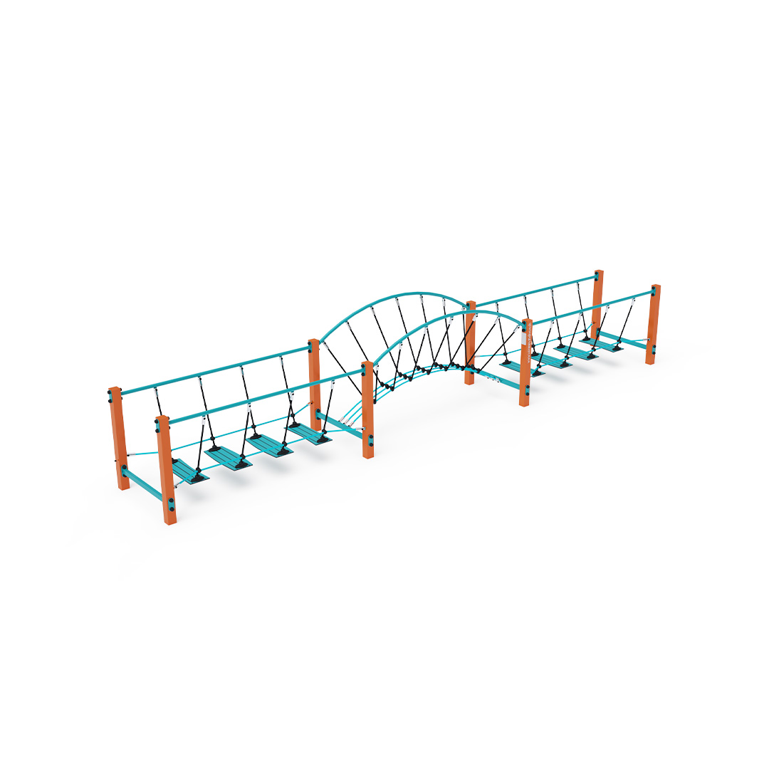 The maintenance-free combined triple HPL balance bridge with anti-slip treads suspended on polyester ropes is a playground feature designed for children to develop their coordination, stability, and balance. It is made of hot-dip galvanized steel, coated with powder-baked paint for durability. The ropes are crafted from polyester fibers wound around a core, enhancing their strength and resistance to mechanical stress. Polyester itself offers many positive qualities: it is resistant to microorganisms, weather conditions, quick-drying after rain, color-fast, and known for its high strength. Stainless steel connectors are used for assembly. While a grassy surface can serve as an impact area, we recommend using a turf reinforcement mat.