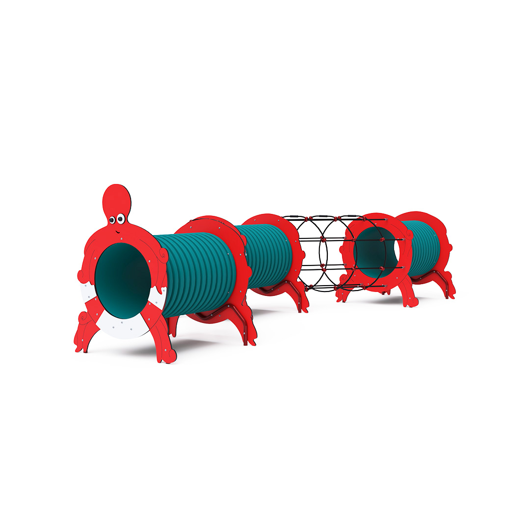 The play element featuring an octopus design with a plastic tunnel is our large-sized version in this series of play structures. The play set consists of three tunnels connected by two rope tunnels. Its thematic design fosters children's imagination.The front and back graphic panels are made of HPL (High Pressure Laminate) material, ensuring long lifespan, color stability, and safety. HPL material is eco-friendly, chemically resistant, UV-resistant, non-toxic, recyclable, and non-breakable. This eliminates the risk of children getting injured by sharp edges or fragments.The ropes are made from polyester fibers wound around a central core. This rope construction enhances its strength and resistance to mechanical stress. Polyester itself has many positive properties: it is resistant to microorganisms and weather conditions, dries quickly after rain, maintains color stability, and is very strong.Connectors are made of stainless steel.