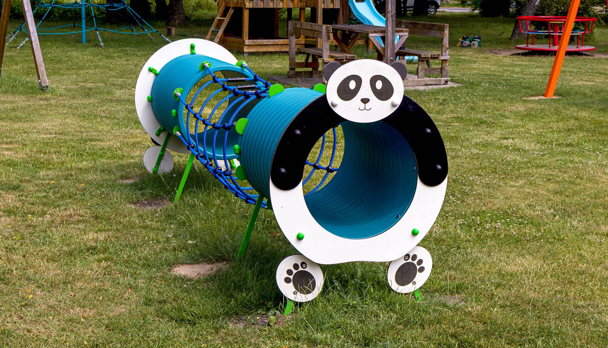 The play element featuring a panda design with a plastic tunnel is our medium-sized version in this series of play structures. The play set consists of two tunnels connected by a rope tunnel. Its thematic design fosters children's imagination.The front and back graphic panels are made of HPL (High Pressure Laminate) material, ensuring long lifespan, color stability, and safety. HPL material is eco-friendly, chemically resistant, UV-resistant, non-toxic, recyclable, and non-breakable. This eliminates the risk of children getting injured by sharp edges or fragments.The ropes are made from polyester fibers wound around a central core. This rope construction enhances its strength and resistance to mechanical stress. Polyester itself has many positive properties: it is resistant to microorganisms and weather conditions, dries quickly after rain, maintains color stability, and is very strong.Connectors are made of stainless steel.