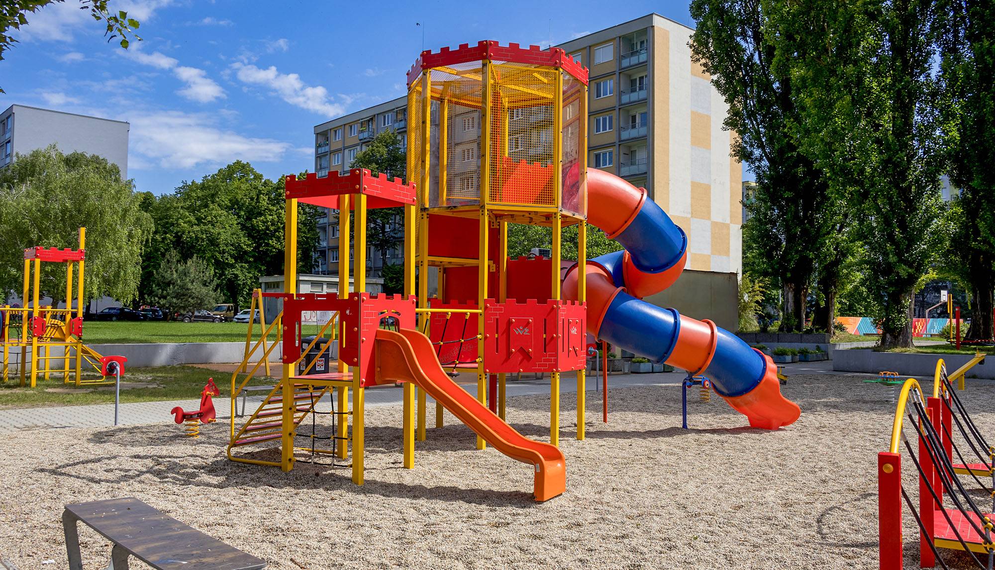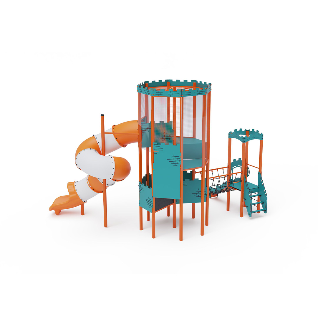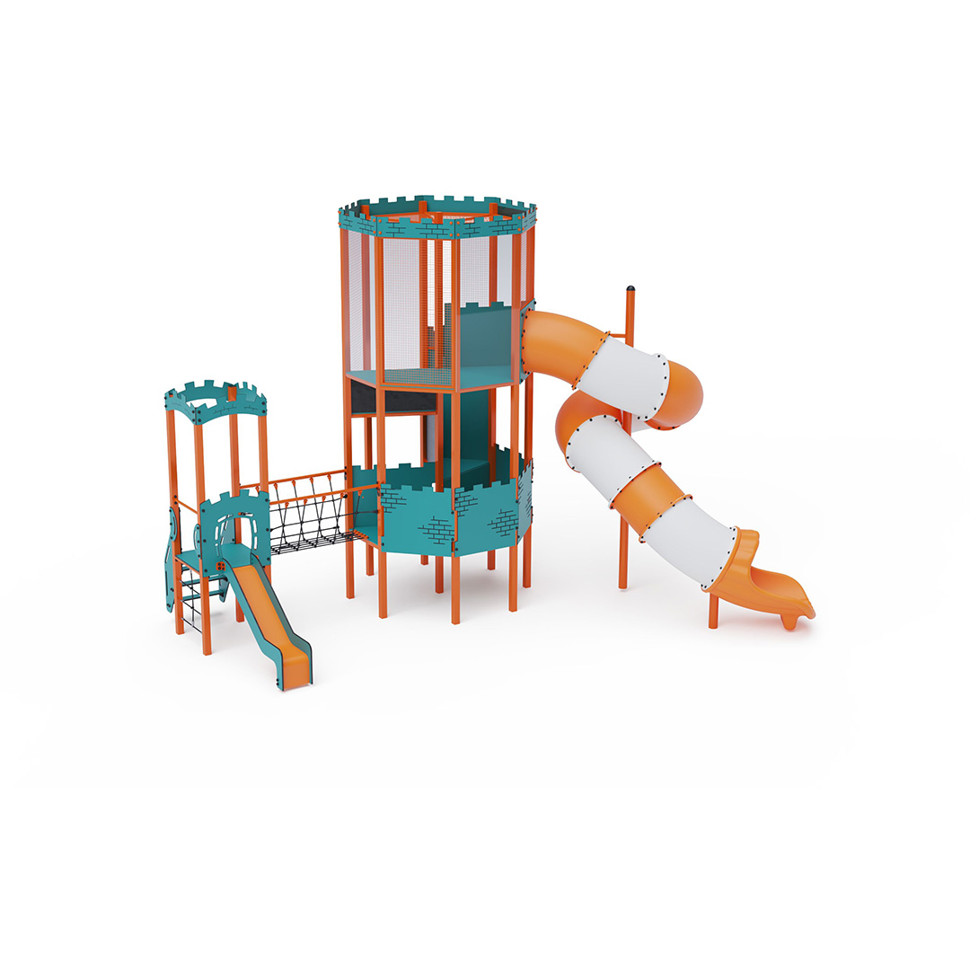 A double-tower combined set - a tower where children can climb via stairs or a rope climb and slide down a slide or a toboggan. The turquoise-orange design attracts children to play from afar. The steel construction is weather-resistant due to hot-dip galvanization and a durable powder coating. The HPL material used is chemically resistant, UV-resistant (colorfast), non-toxic, recyclable, and break-resistant.