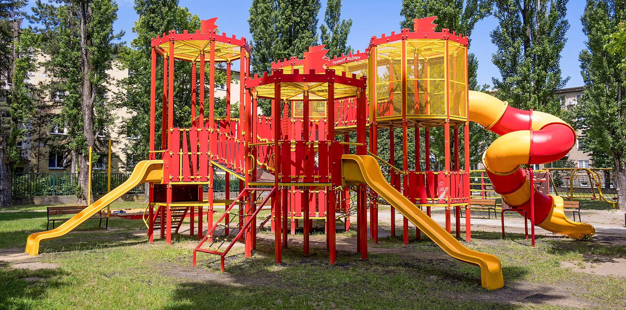 A large combined set - the towers with ramparts in the shape of an octagon are connected by a solid bridge with railings, an inclined rope bridge, a rope bridge, and a solid bridge closure. The set includes steps, vertical climbing walls, rope nets, inclined rope climbs, ladders, two slides, and two toboggans. The red-yellow design already invites children to play from a distance. The steel construction is weather-resistant due to hot-dip galvanization and durable powder coating. The HDPE plastic used is chemically resistant, UV-resistant (colorfast), non-toxic, recyclable, and break-resistant. This prevents injury from sharp edges or fragments. The ropes are made from polyester fibers wound around a central reinforcement. This construction increases the strength and durability of the rope against mechanical stress. Polyester itself is resistant to microorganisms, weather conditions, dries quickly after rain, is colorfast, and has high strength. All joints are stainless steel and covered with plastic caps to increase the durability and safety of the connections.