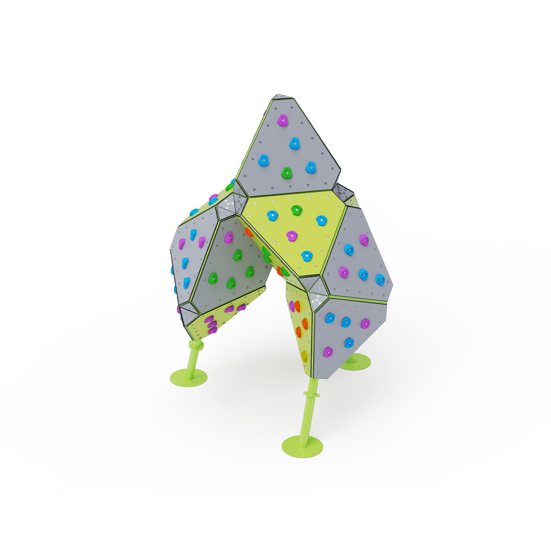 The structure is designed for climbing and training climbing techniques. The setup is suitable for children aged 3 and up. The frame is made of galvanized and powder-coated steel, while the panels are made from durable and eco-friendly HPL material. The climbing holds, made of polyester resin, are arranged in various routes based on the color of the holds, with each color representing a different level of difficulty.