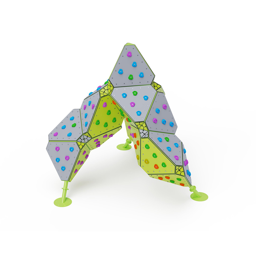 The structure is designed for climbing and training climbing techniques. The setup is suitable for children aged 3 and up. The frame is made of galvanized and powder-coated steel, while the panels are made from durable and eco-friendly HPL material. The climbing holds, made of polyester resin, are arranged in various routes based on the color of the holds, with each color representing a different level of difficulty.