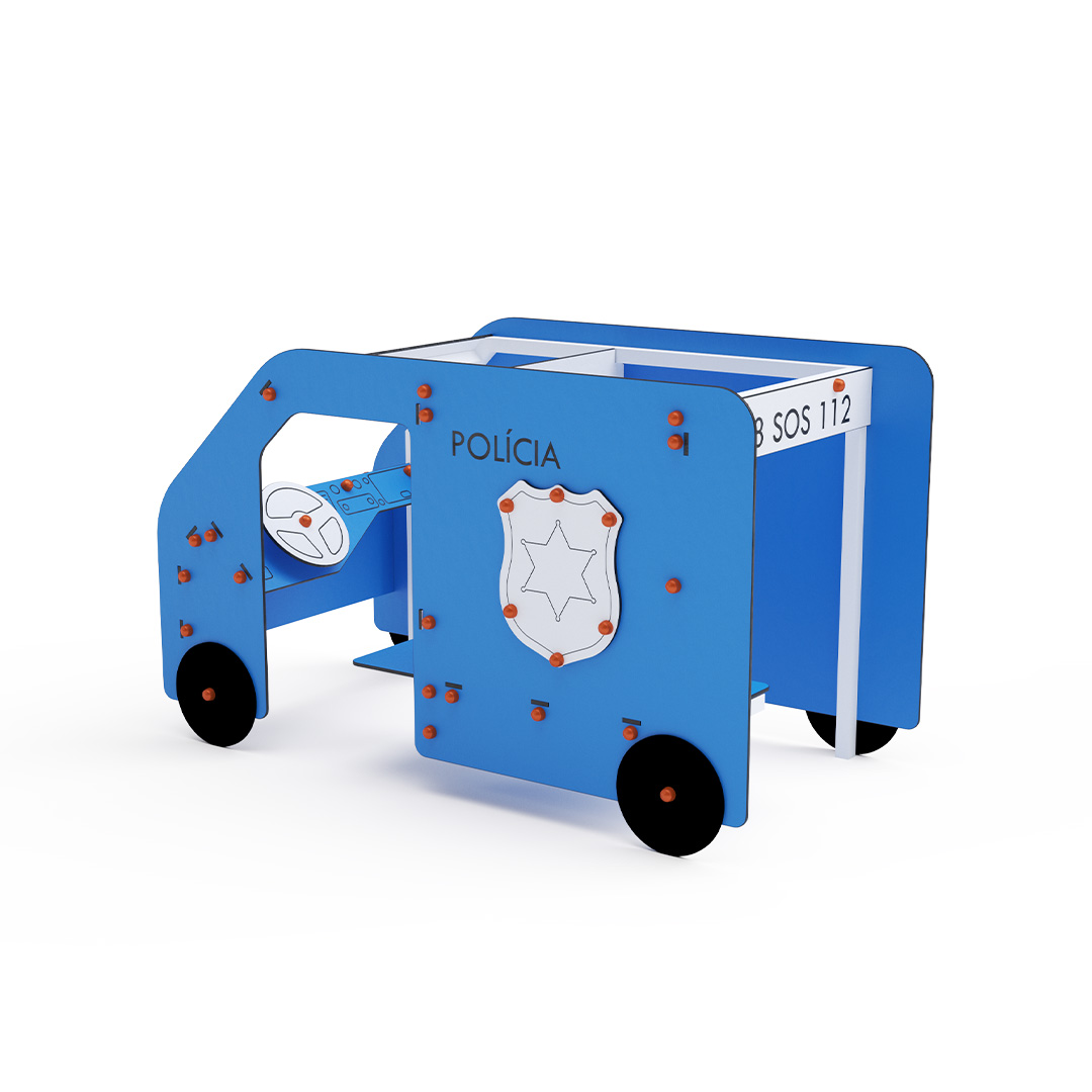 Play vehicle - police is an ideal themed element for nurturing children's imagination and encouraging teamwork, making it suitable even for the youngest children. A rotating steering wheel and themed details enhance the immersive play experience. The steel structure is weather-resistant thanks to hot-dip galvanization and a durable powder coating. The HPL material is chemically resistant, UV-stable – colorfast, non-toxic, recyclable, and unbreakable, preventing injuries from sharp edges or splinters. All joints are stainless steel and covered with plastic caps to ensure durability and safety.