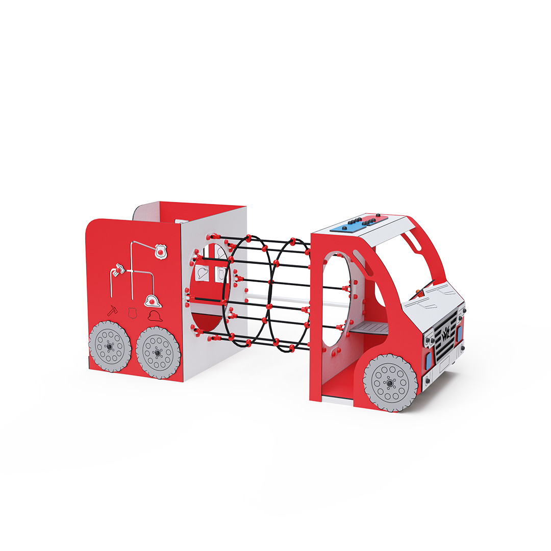 Play vehicle - fire truck is an ideal themed element for nurturing children's imagination and encouraging teamwork, making it suitable even for the youngest children. A rotating steering wheel and themed details enhance the immersive play experience. The steel structure is weather-resistant thanks to hot-dip galvanization and a durable powder coating. The HPL material is chemically resistant, UV-stable – colorfast, non-toxic, recyclable, and unbreakable, preventing injuries from sharp edges or splinters. All joints are stainless steel and covered with plastic caps to ensure durability and safety.