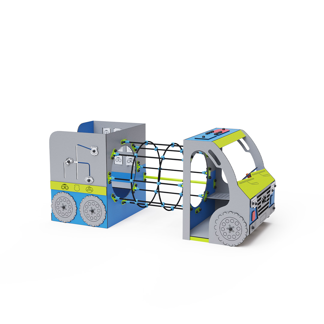 Play vehicle - policie is an ideal themed element for nurturing children's imagination and encouraging teamwork, making it suitable even for the youngest children. A rotating steering wheel and themed details enhance the immersive play experience. The steel structure is weather-resistant thanks to hot-dip galvanization and a durable powder coating. The HPL material is chemically resistant, UV-stable – colorfast, non-toxic, recyclable, and unbreakable, preventing injuries from sharp edges or splinters. All joints are stainless steel and covered with plastic caps to ensure durability and safety.