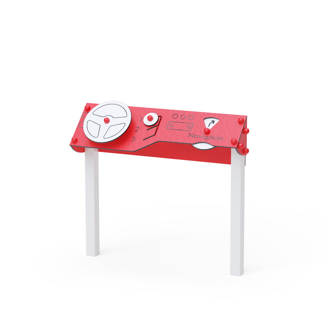 The Dashboard is a perfect themed element for developing children's imagination, making it ideal even for the youngest ones. A rotating steering wheel and navigation features enhance the imaginative play experience. The steel frame is weather-resistant thanks to hot-dip galvanization and a durable powder-coated finish. The HPL panels are chemically resistant, UV-stable – colorfast, non-toxic, recyclable, and unbreakable, eliminating the risk of injury from sharp edges or splinters. All joints are made of stainless steel and covered with plastic caps to enhance safety and longevity.