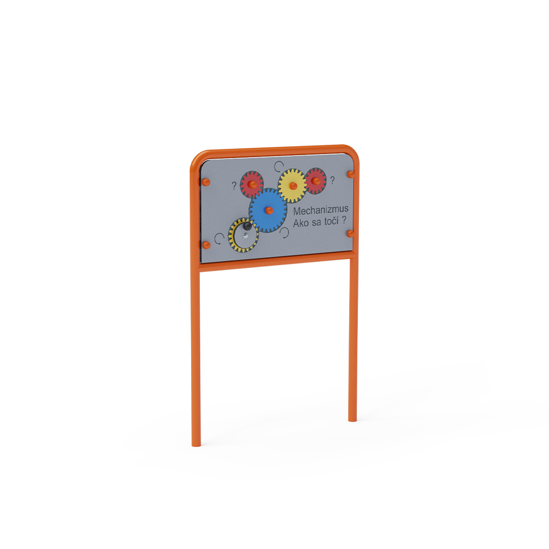 How does the mechanism work? Playful learning of how mechanisms function in the fresh air. The construction of the educational panel is made of galvanized steel treated with powder coating. The joints are made of stainless steel and covered with plastic caps to increase the safety and durability of the connections. The panel itself is made of HPL material, which is chemically resistant, UV-resistant, non-toxic, recyclable, and unbreakable. This prevents the risk of injury from sharp edges or fragments.