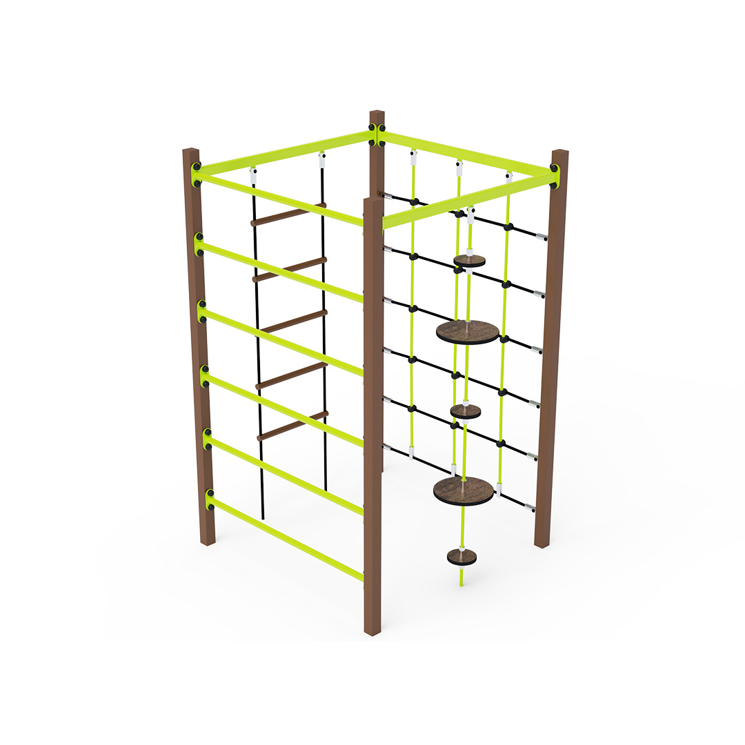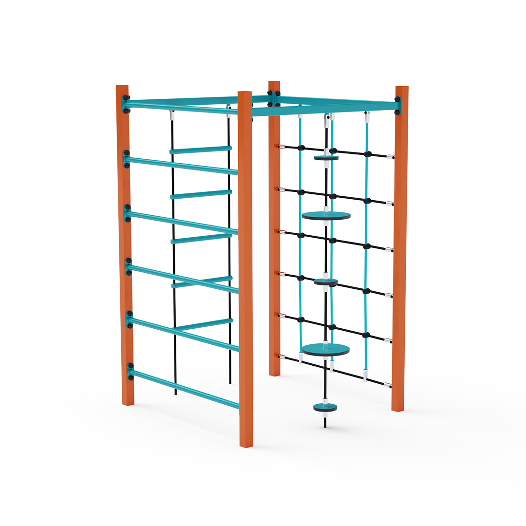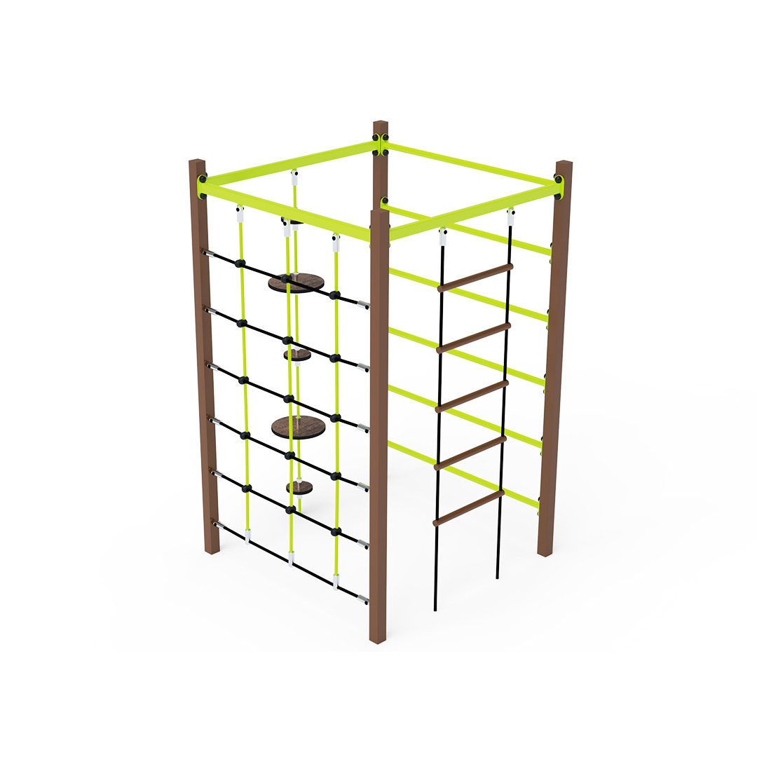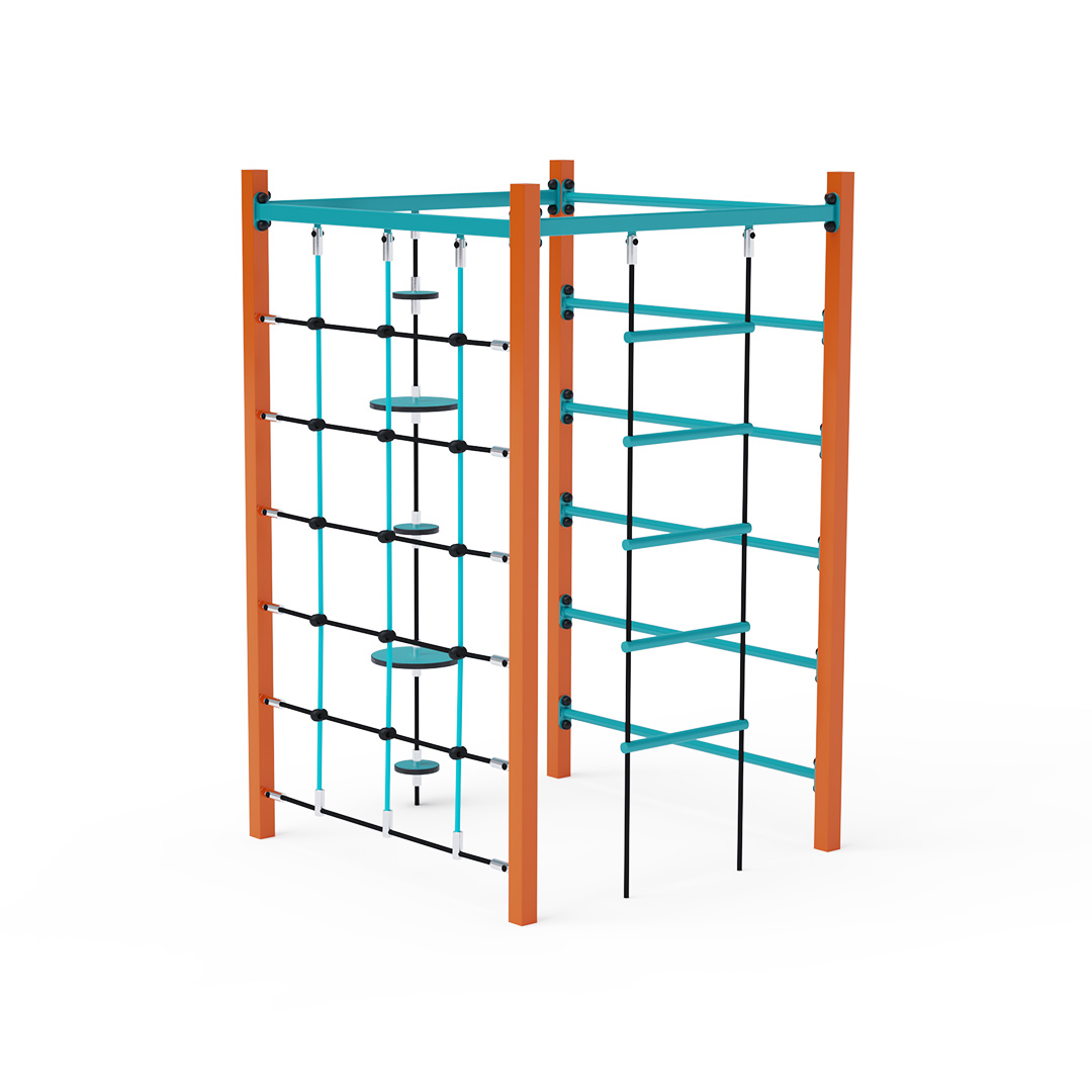 The rope gymcenter is a cube structure featuring a rope net, ladder, long monkey bars, and ropes with balancing discs. The play element is made of hot-dip galvanized steel with a high-quality surface finish. All joints are stainless steel and covered with plastic caps to enhance safety and prolong the lifespan of the connections. The ropes are made of polyester fibers wound around a central core. This construction increases their strength and resistance to mechanical wear. Polyester itself has many advantages – it is resistant to microorganisms and weather conditions, dries quickly after rain, retains its color, and is highly durable.