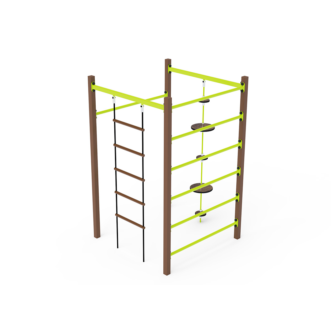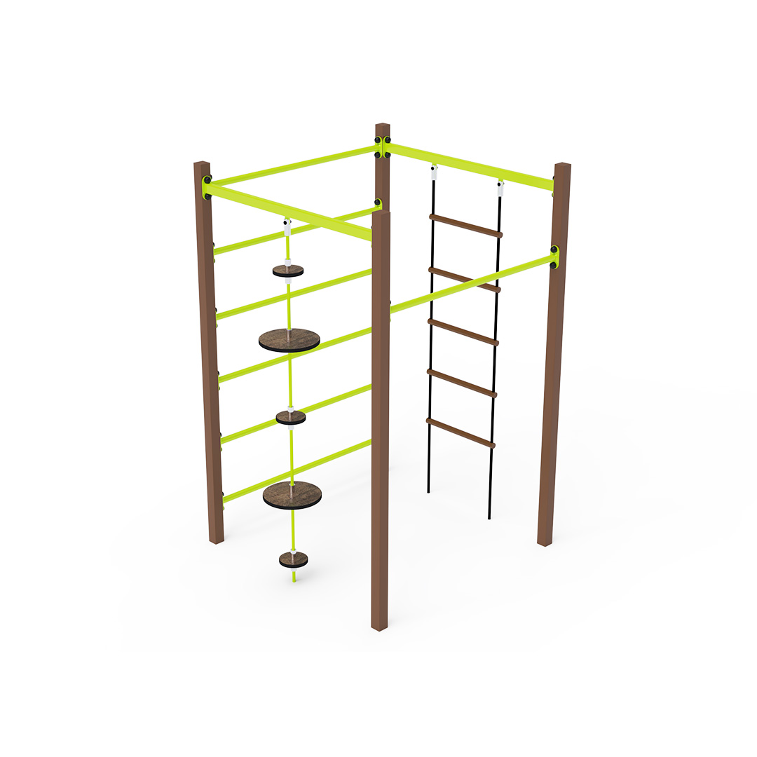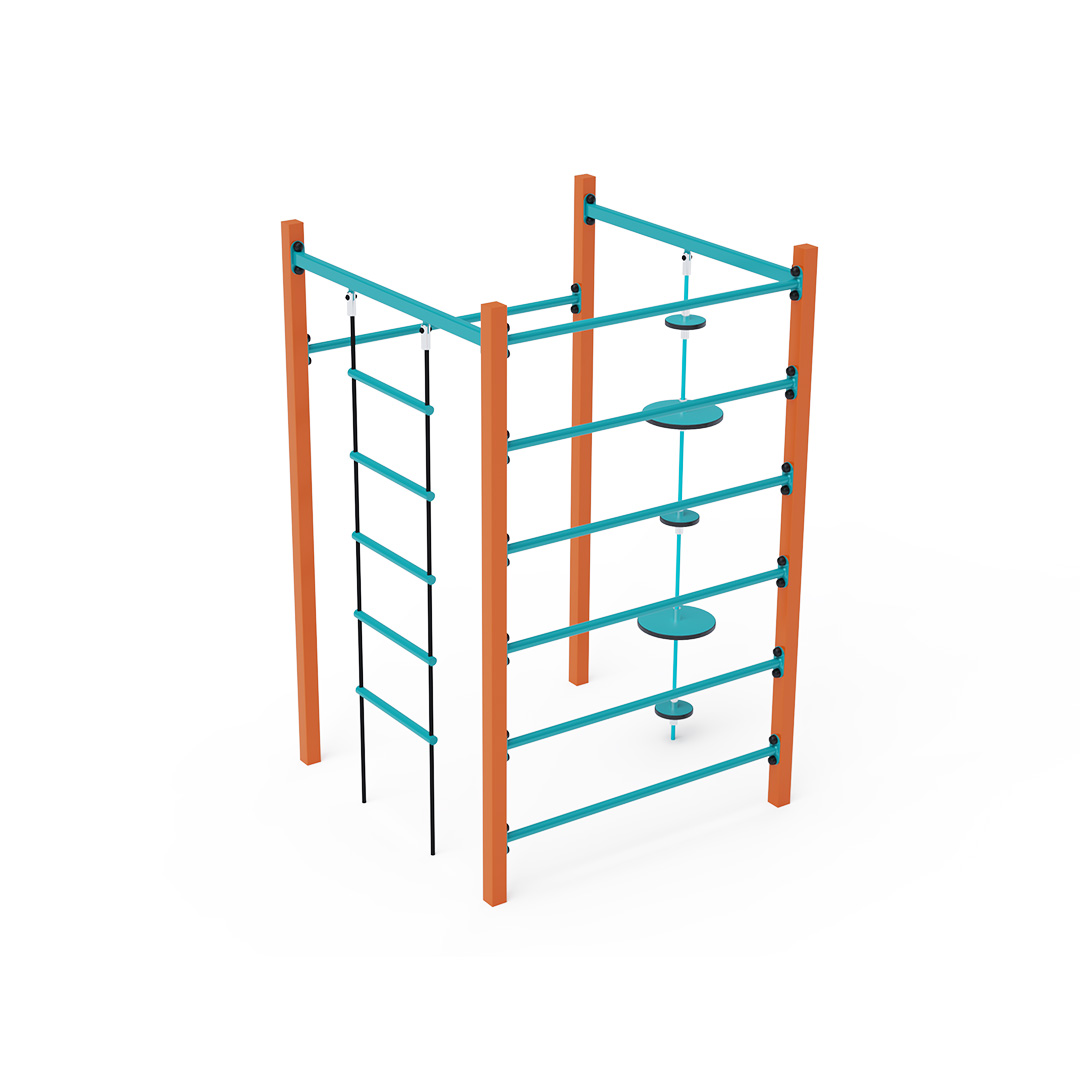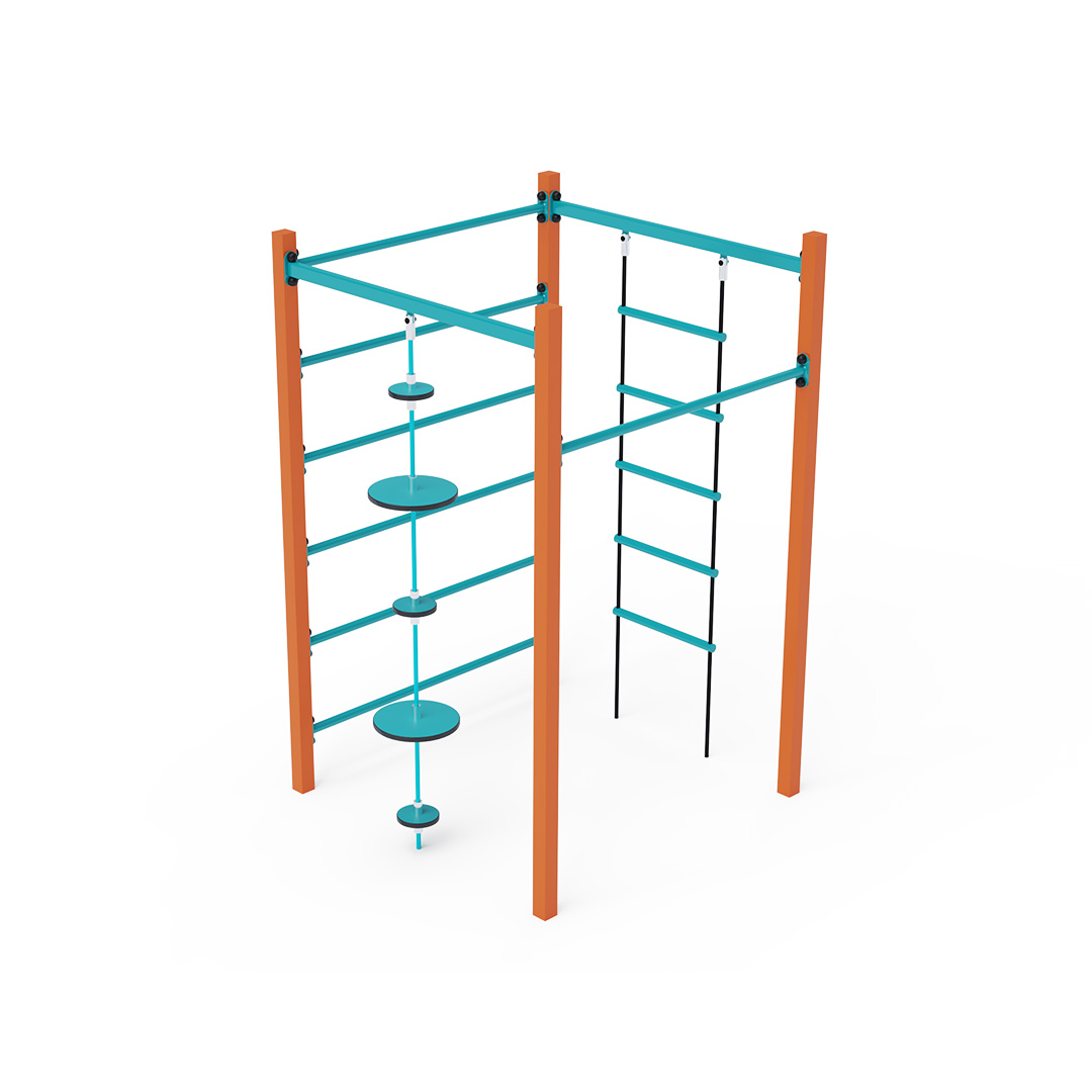 The rope gymcenter is a cube structure featuring a horizontal bar, ladder, long monkey bars, and ropes with balancing discs. The play element is made of hot-dip galvanized steel with a high-quality surface finish. All joints are stainless steel and covered with plastic caps to increase safety and extend the durability of the connections. The ropes are made of polyester fibers wound around a central core. This construction increases their strength and resistance to mechanical wear. Polyester itself offers many advantages – it is resistant to microorganisms and weather conditions, dries quickly after rain, retains its color, and is highly durable.
