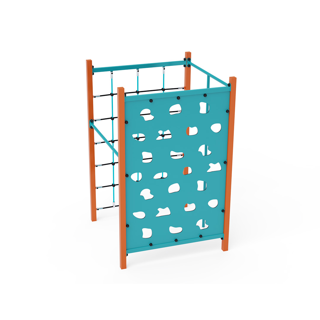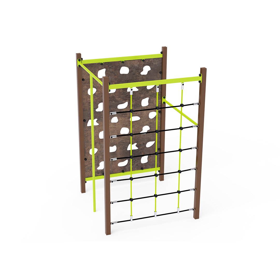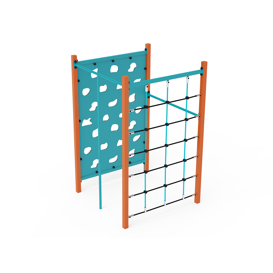 The steel gymcenter is a cube structure featuring a horizontal bar, climbing pole, rope net, and climbing wall. The play element is made of hot-dip galvanized steel with a high-quality surface finish. All joints are stainless steel and covered with plastic caps to increase safety and extend the durability of the connections. The ropes are made of polyester fibers wound around a central core. This construction increases their strength and resistance to mechanical wear. Polyester itself offers many advantages – it is resistant to microorganisms and weather conditions, dries quickly after rain, retains its color, and is highly durable.