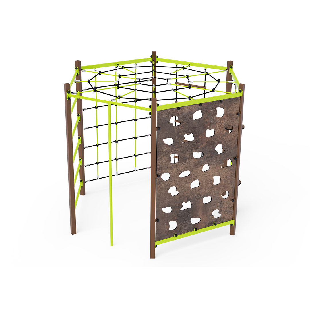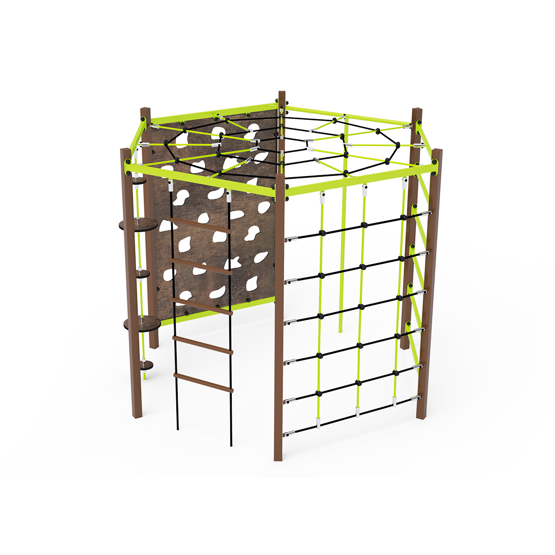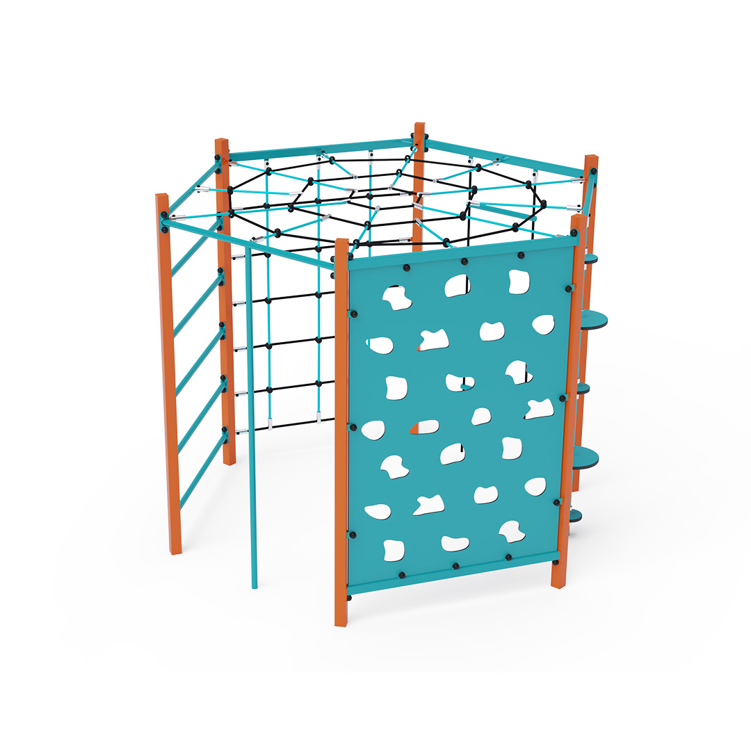 The rope gymcenter is a hexagonal structure composed of a long bar ladder, climbing pole, rope with balancing discs, climbing wall with holds, ladder, and climbing net. The play element is made of hot-dip galvanized steel with a high-quality surface finish. All joints are made of stainless steel and covered with plastic caps to enhance safety and increase the durability of the connections. The ropes are made of polyester fibers wound around a central core. This design increases the rope’s strength and resistance to mechanical stress. Polyester itself offers many advantages – it is resistant to microorganisms and weather conditions, dries quickly after rain, retains its color, and is highly durable.