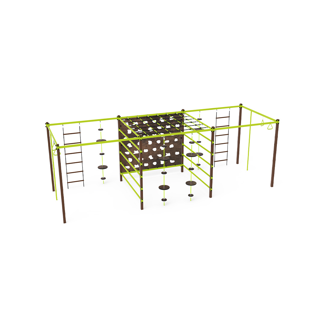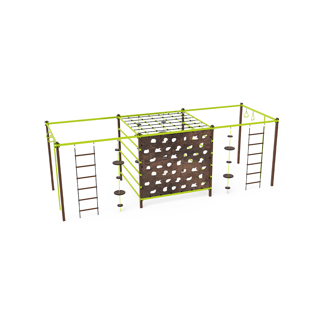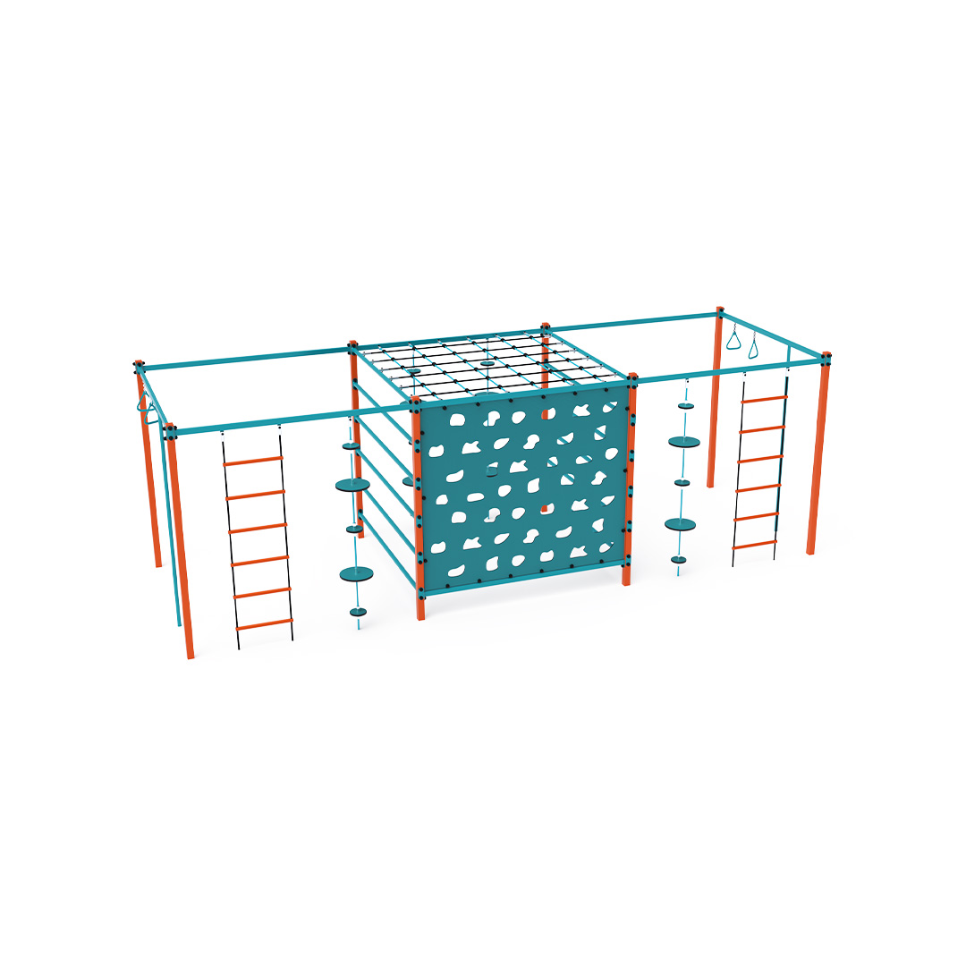 The steel gymcenter is a set made up of various segments: climbing rings, a climbing bar, a ladder, a long ladder, an aviation wall, and a rope with balancing disks. The play element is made of hot-dip galvanized steel with a high-quality surface finish. All joints are made of stainless steel and covered with plastic caps to enhance safety and extend the lifespan of the connections. The ropes are made from polyester fibers, which are wound around the center. This rope construction increases its strength and resistance to mechanical stress. Polyester itself has many positive properties: it is resistant to microorganisms, weather conditions, dries quickly after rain, is colorfast, and has high strength. The steel gymcenter VVZ-GYM007 is certified according to the STN EN 1176 standard. The play structure is anchored to the ground by concreting it into 50 × 50 × 50 cm concrete footings.