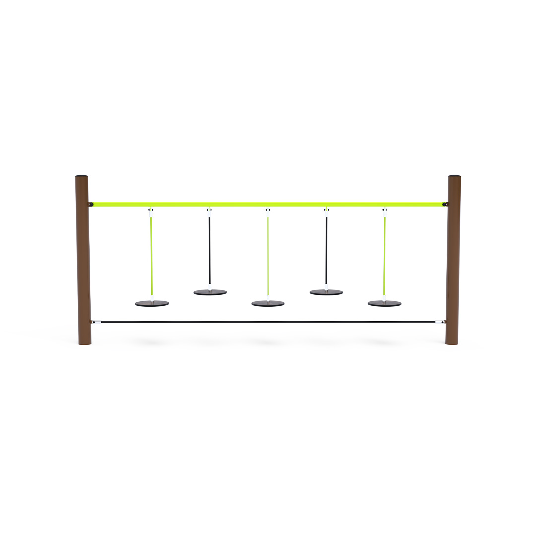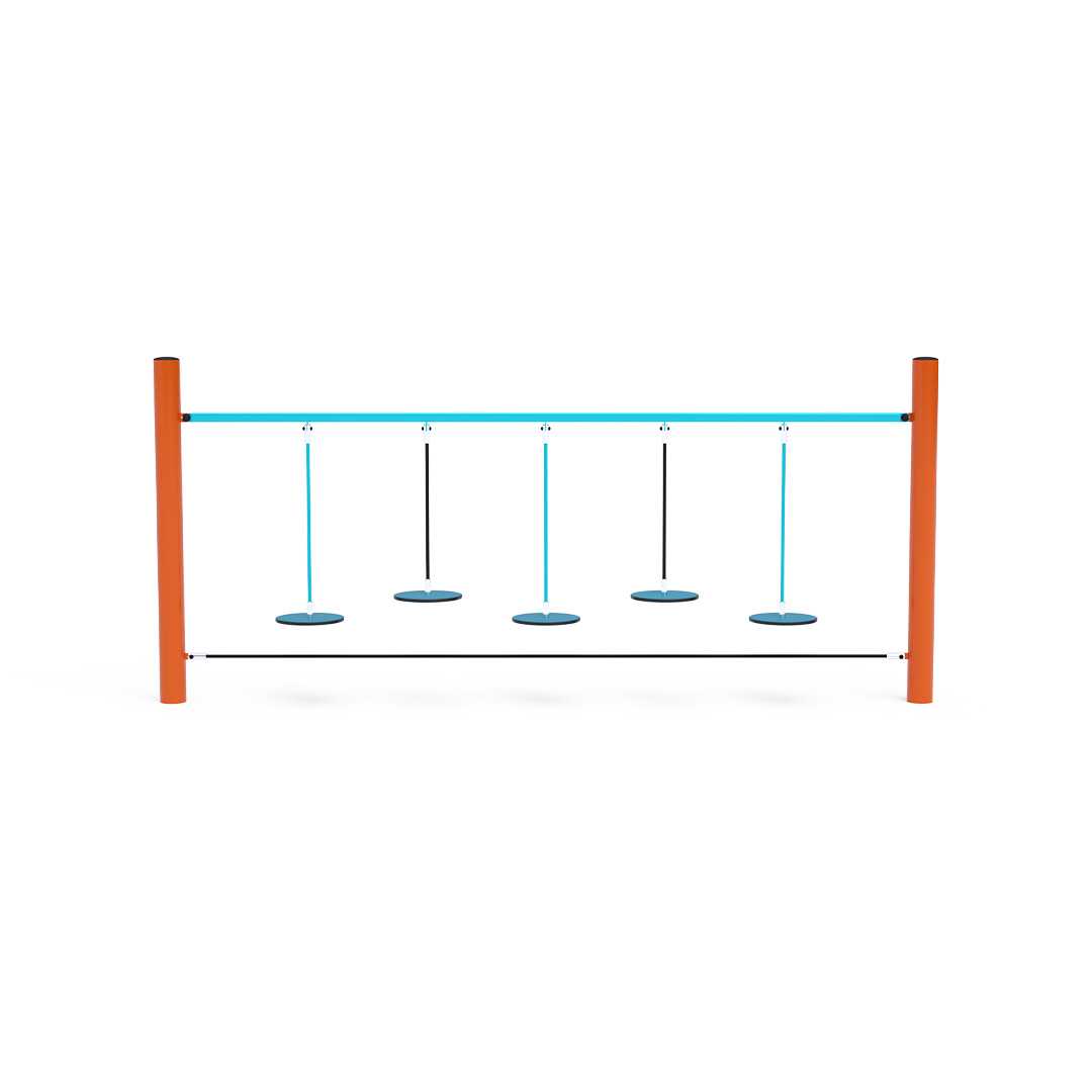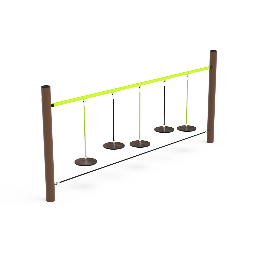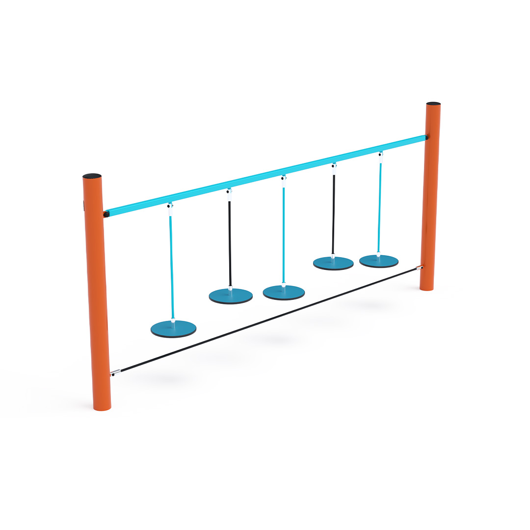 The monkey trail with hanging “stones” tests a child’s ability to focus and coordinate their entire body. Moving from one freely hanging stone to the next is not an easy task. The play element is made of hot-dip galvanized steel with a high-quality surface finish. All joints are stainless steel and covered with plastic caps to enhance safety and prolong the lifespan of the connections. The ropes are made of polyester fibers wound around a central core. This rope construction increases its strength and resistance to mechanical stress. Polyester itself has many positive properties. It is resistant to microorganisms and weather conditions, dries quickly after rain, retains its color, and is characterized by high durability.