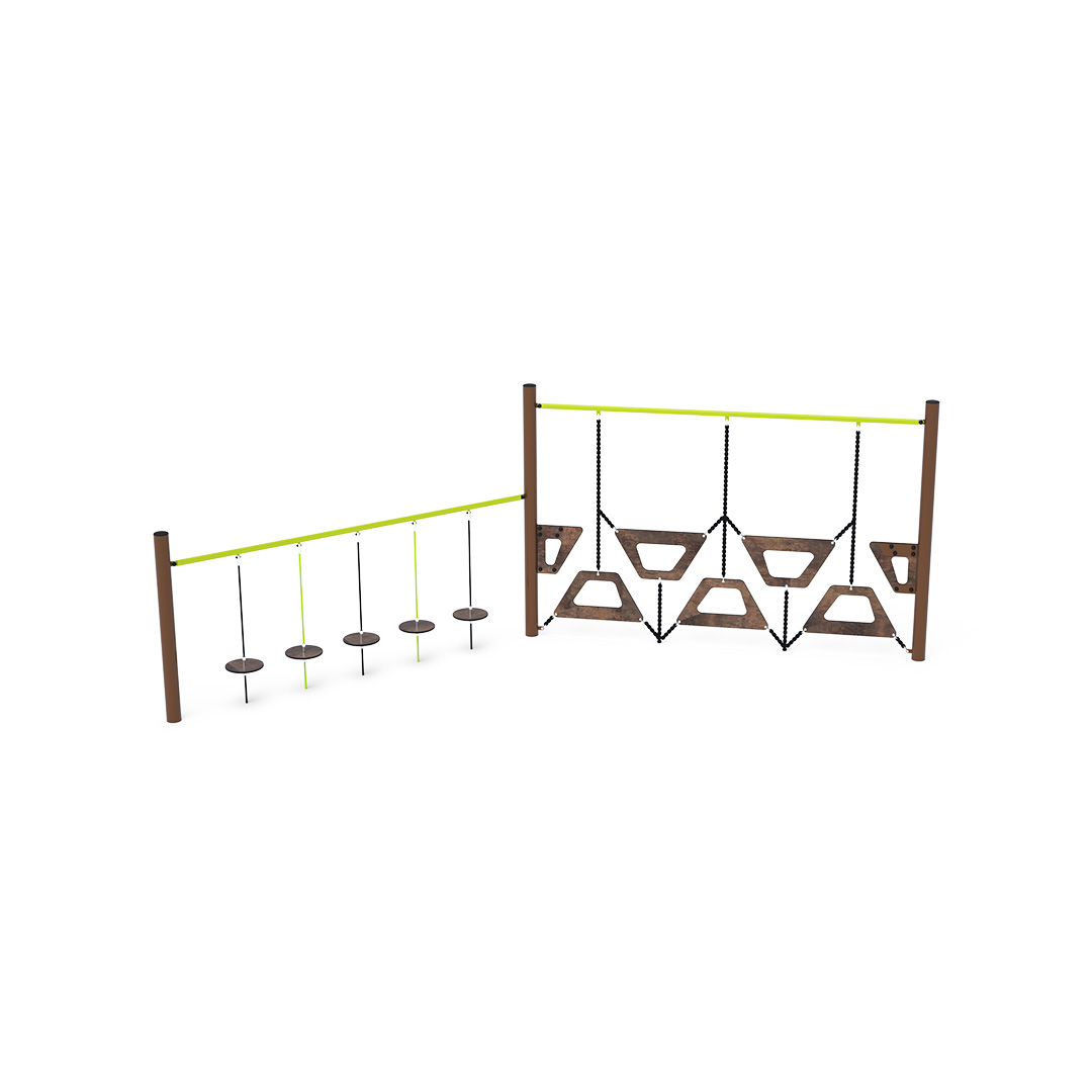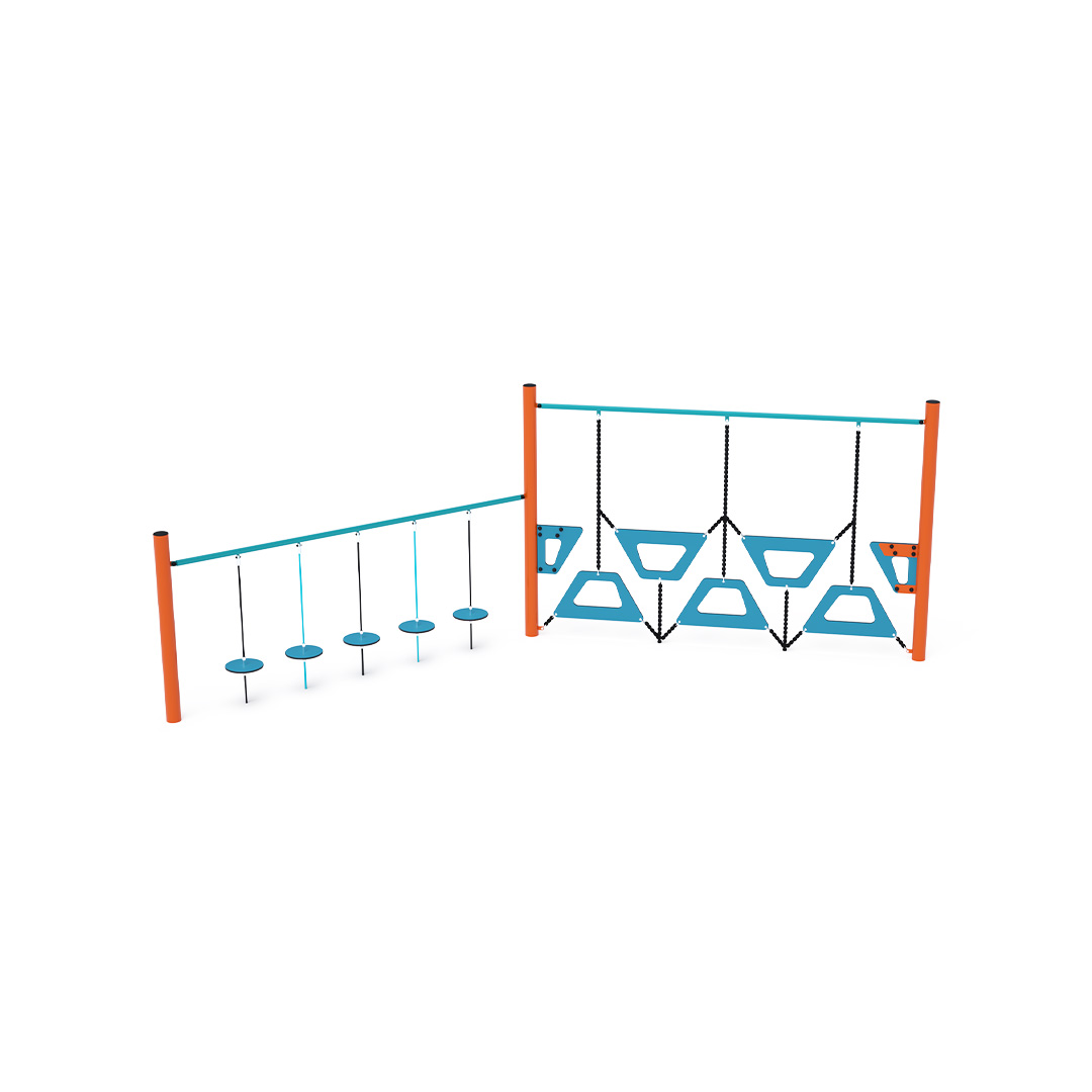 The monkey trail is created by combining two sections. The hanging discs test each child’s balance, while the trapezoidal wall shows how fun yet challenging it is when they are not standing on solid ground. The play element is made of galvanized steel with a high-quality surface finish – powder coating. All joints are stainless steel and covered with plastic caps to enhance safety and prolong the lifespan of the connections. The ropes are made of polyester fibers with a steel core, wound around a central core. This rope construction increases its strength and resistance to mechanical stress. Polyester itself has many positive properties. It is resistant to microorganisms and weather conditions, dries quickly after rain, retains its color, and is characterized by high durability.
