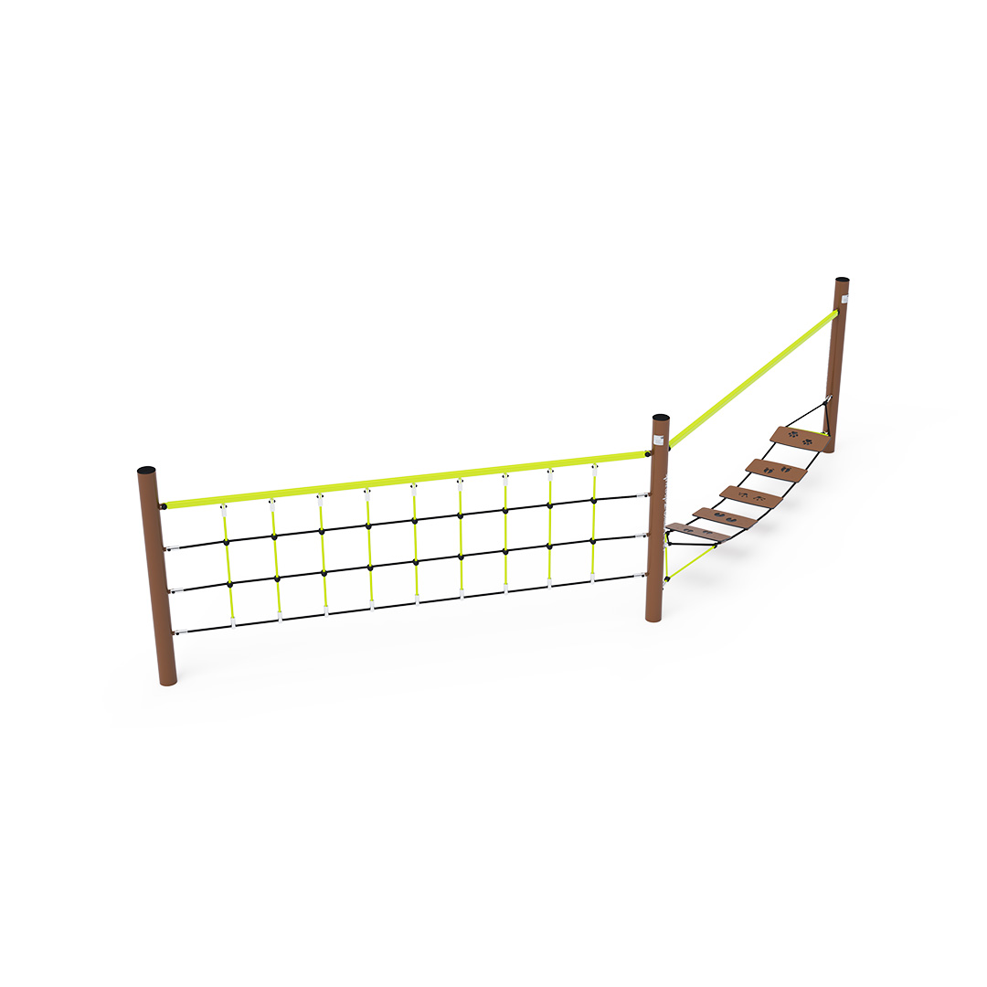 The play element is made of hot-dip galvanized steel with a high-quality surface finish. The joints are stainless steel and covered with plastic caps to enhance safety and the durability of the connections. The ropes are made of polyester fibers wound around a central core. This construction increases its strength and resistance to mechanical stress. Polyester itself has many positive qualities – it is resistant to microorganisms and weather conditions, dries quickly after rain, retains its color, and is highly durable.