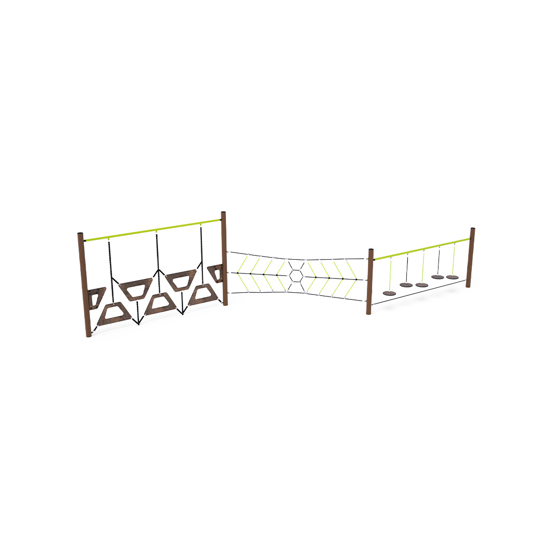 The monkey trail is created by combining three sections: a trapezoidal wall, a spider net, and freely hanging discs. Overcoming this play element is not only fun but also challenging. The play element is made of galvanized steel with a high-quality surface finish – powder coating, the joints are stainless steel and covered with plastic caps to enhance safety and prolong the lifespan of the connections. The ropes are made of polyester fibers with a steel core, which are wound around a center. This rope construction increases its strength and resistance to mechanical stress. Polyester itself has many positive properties. It is resistant to microorganisms and weather conditions, dries quickly after rain, is colorfast, and is characterized by high strength.