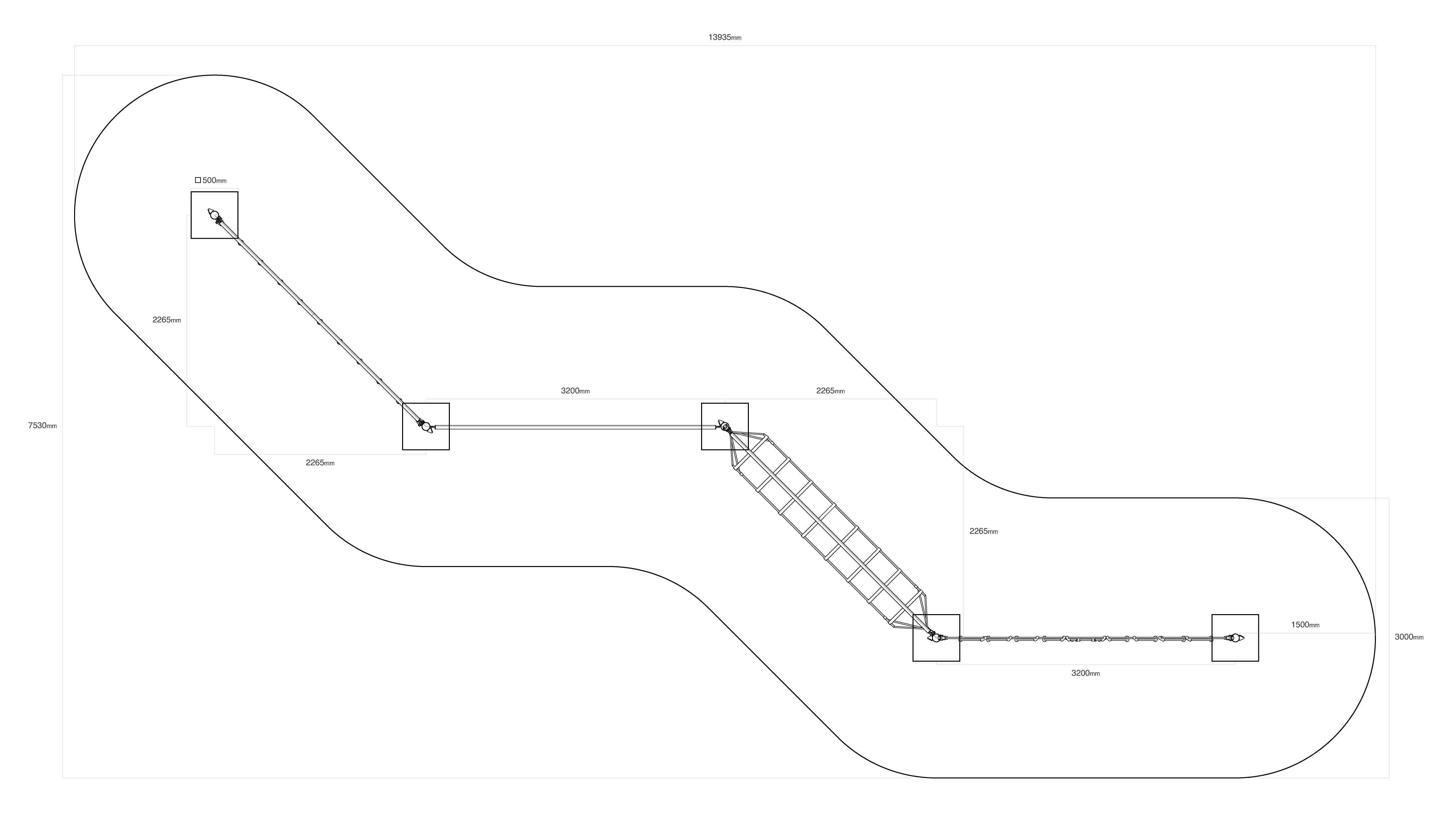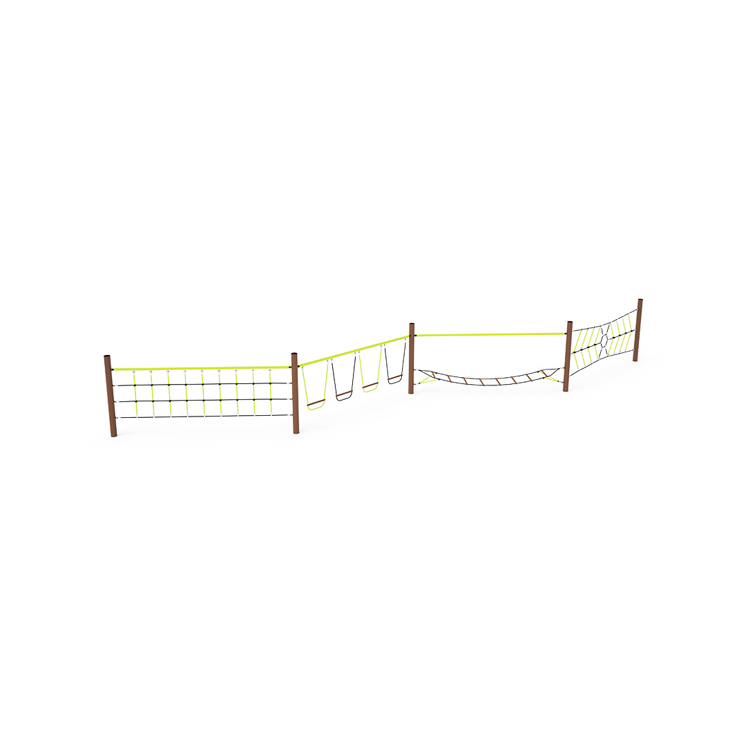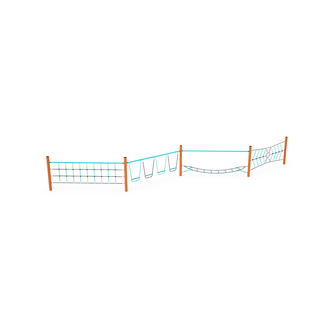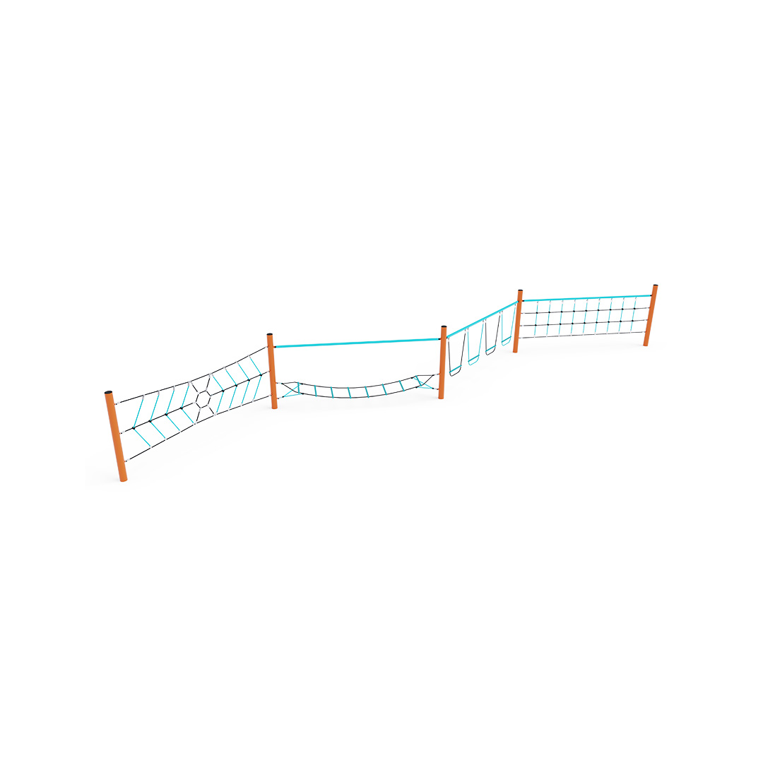 The monkey track is created by combining four different sections. One section made of a vertical rope spider web challenges the arm strength of every child who takes on this mission. Another section with a horizontal "hanging" net entertains children with its instability. The part with vertically hanging stepping pads offers a fun balance challenge, and an additional vertical rope net further tests upper body strength.