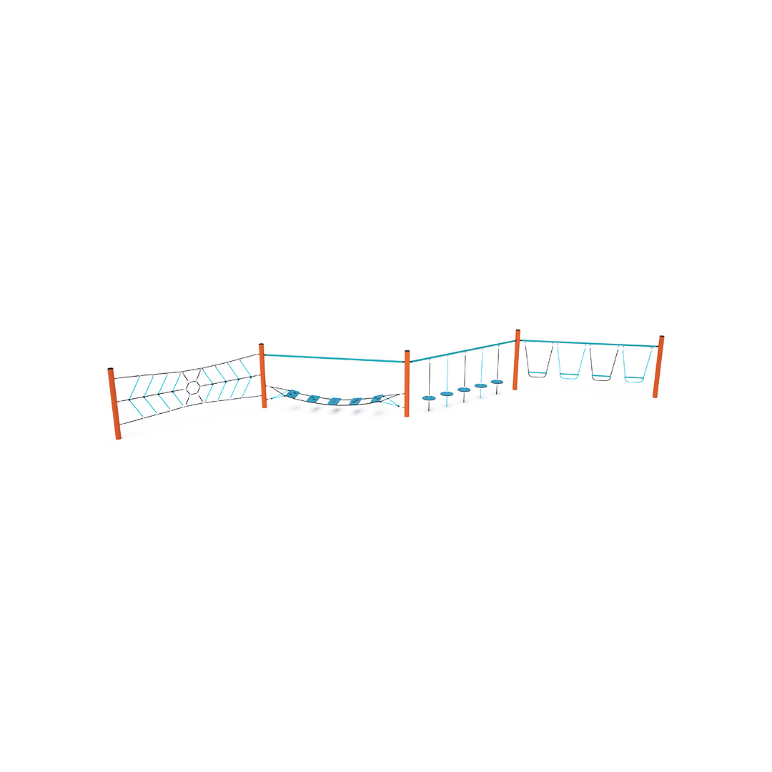 The monkey track is composed of four parts: a vertical rope spider web net, a horizontal “hanging” net that entertains kids with its wobbliness, vertically suspended stepping ropes, and a vertical rope net that tests the strength of every child's arms. The play element is made of hot-dip galvanized steel with a high-quality surface finish. The joints are stainless steel and covered with plastic caps to enhance safety and the durability of the connections.