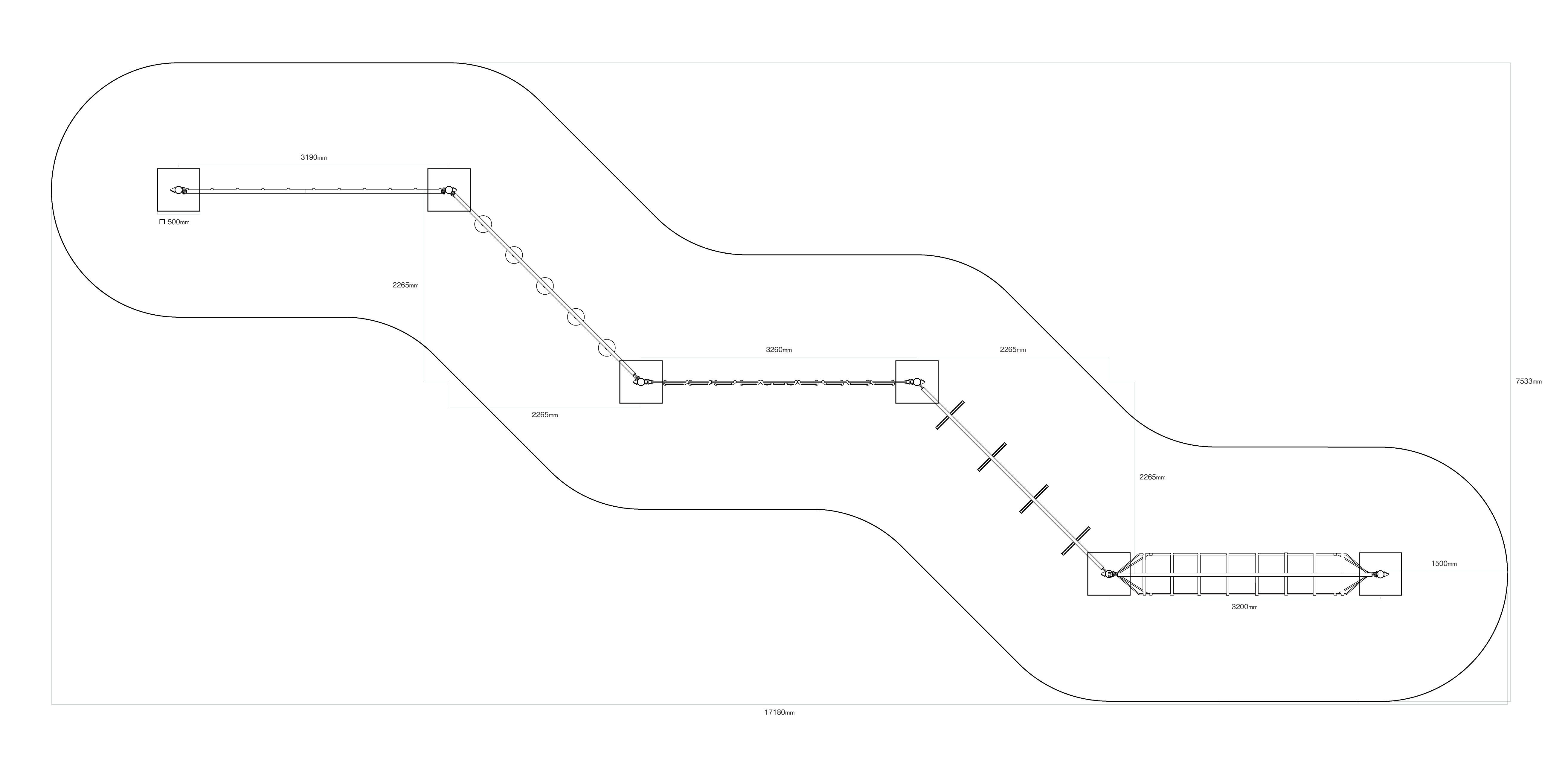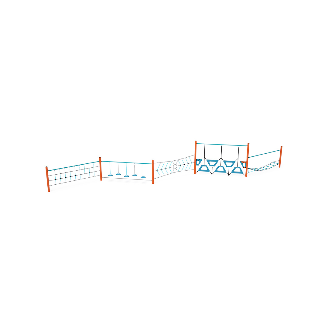 The monkey track is created by combining five different sections – a horizontal net with stepping pads, a trapezoidal climbing wall, a vertical spider net, hanging "stones," and a rope net.