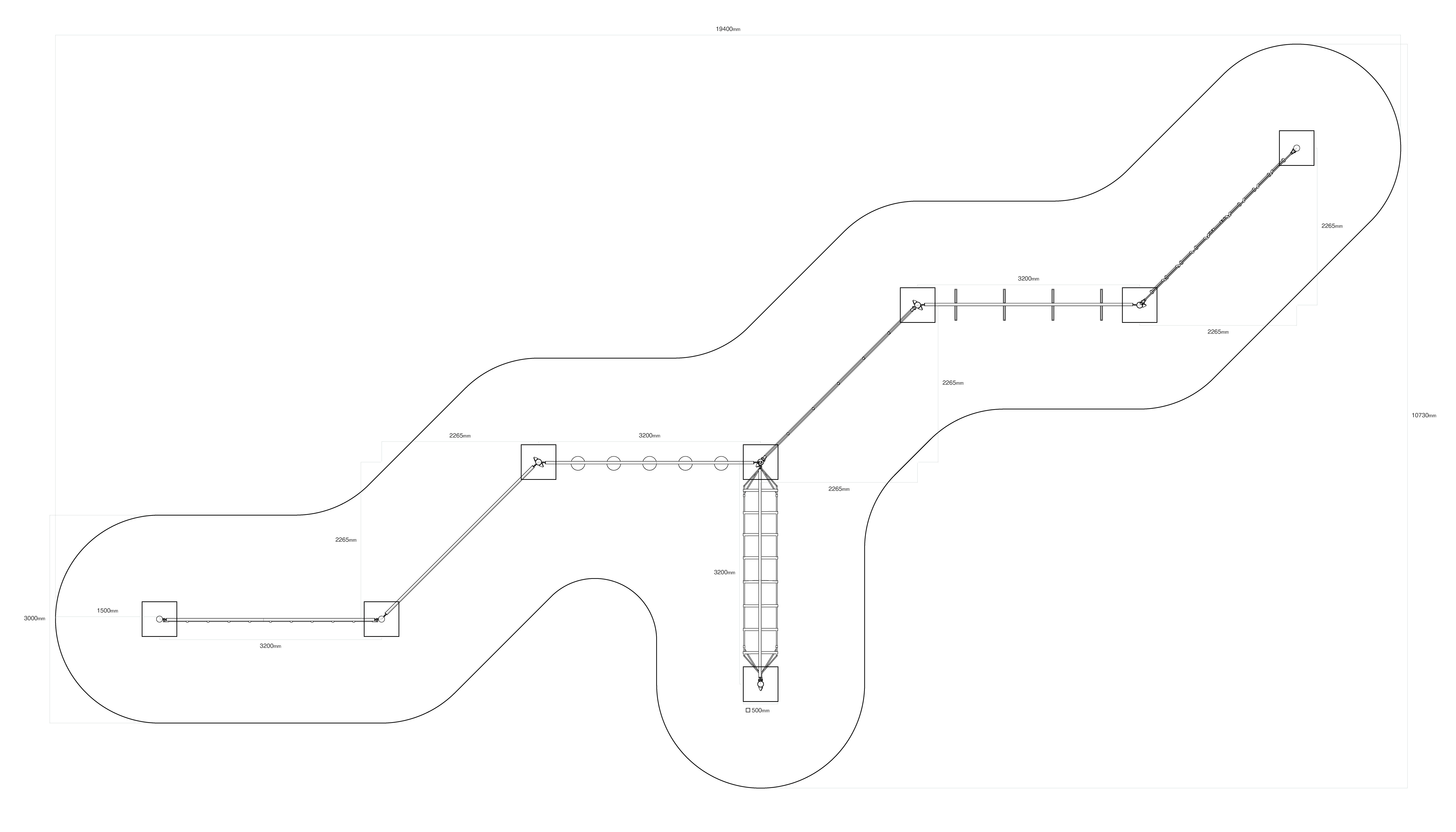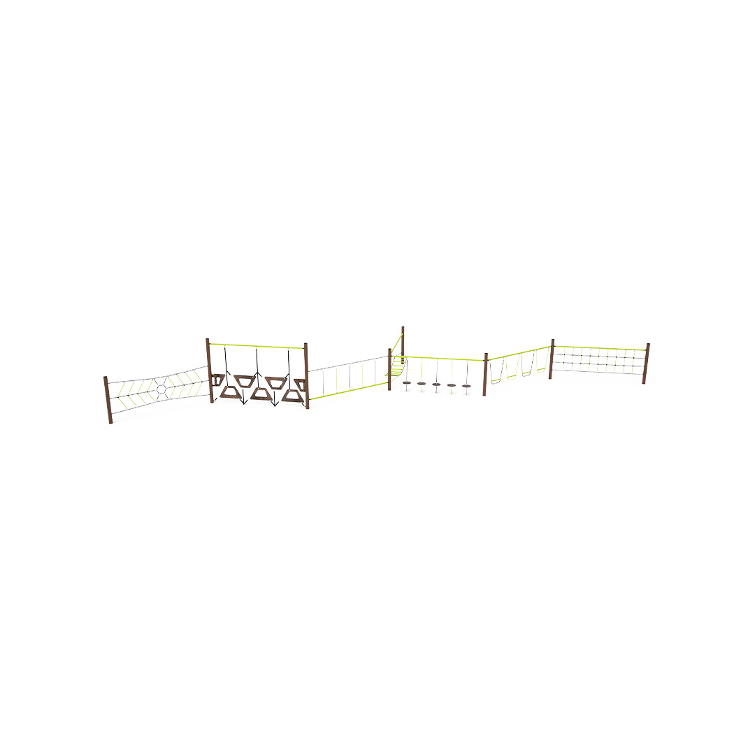 The monkey track is made by combining seven different segments: a rope net, vertically suspended stepping pads, hanging balance stones, a horizontal net with stepping pads, a monkey bar segment, a trapezoidal climbing wall, and a vertical spider net.