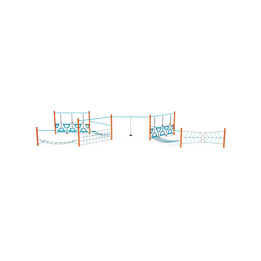 The play element is made of galvanized steel with a high-quality surface finish – powder coating. The joints are stainless steel and covered with plastic caps to enhance safety and durability. The ropes are made of polyester fibers with a steel core, which are wound around the center. This construction increases the rope's strength and resistance to mechanical stress. Polyester has many beneficial properties: it is resistant to microorganisms, weather conditions, dries quickly after rain, retains its color, and is highly durable.