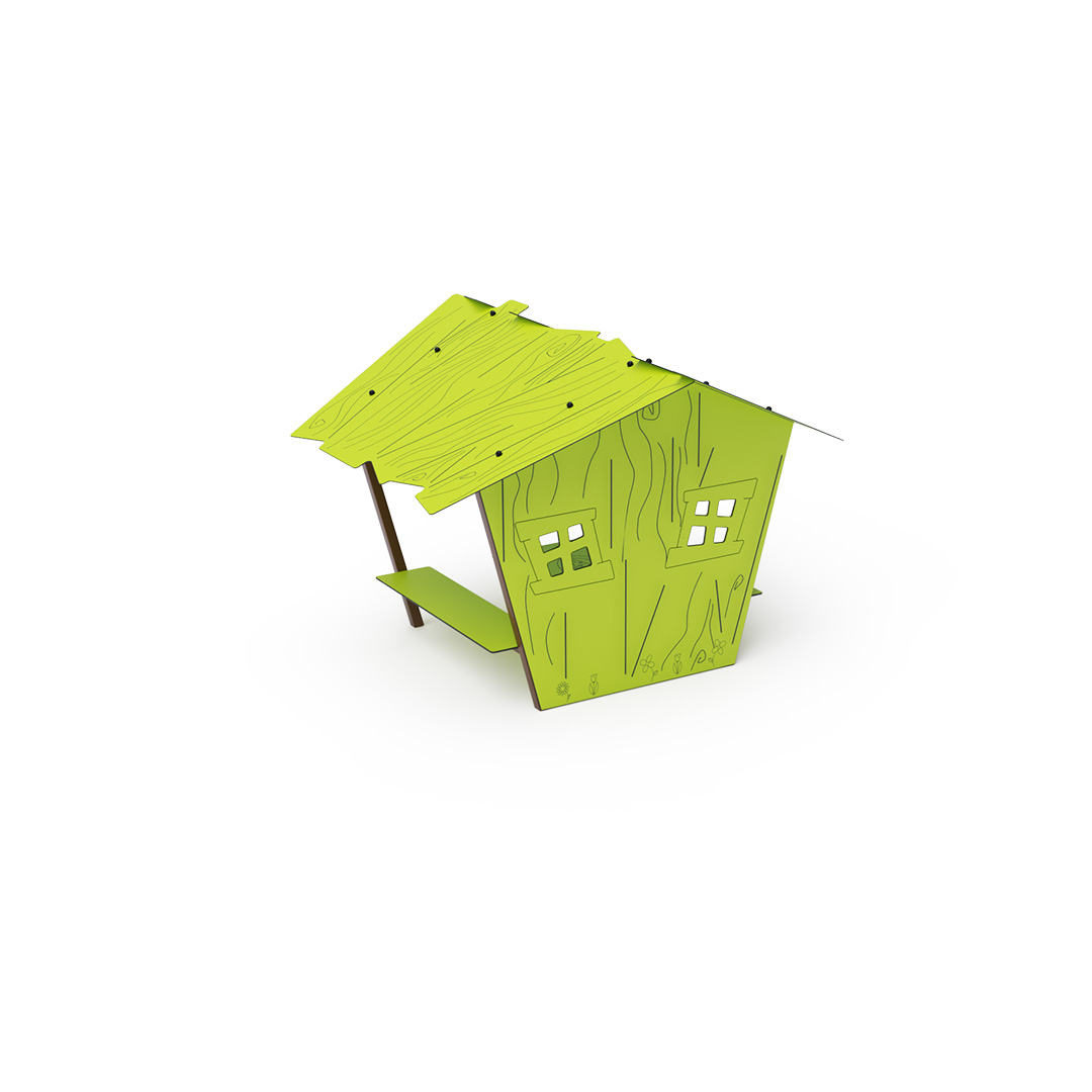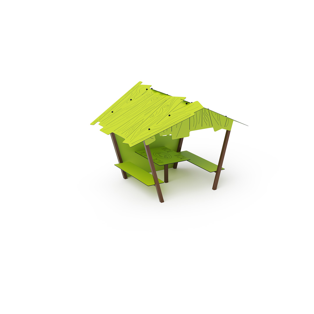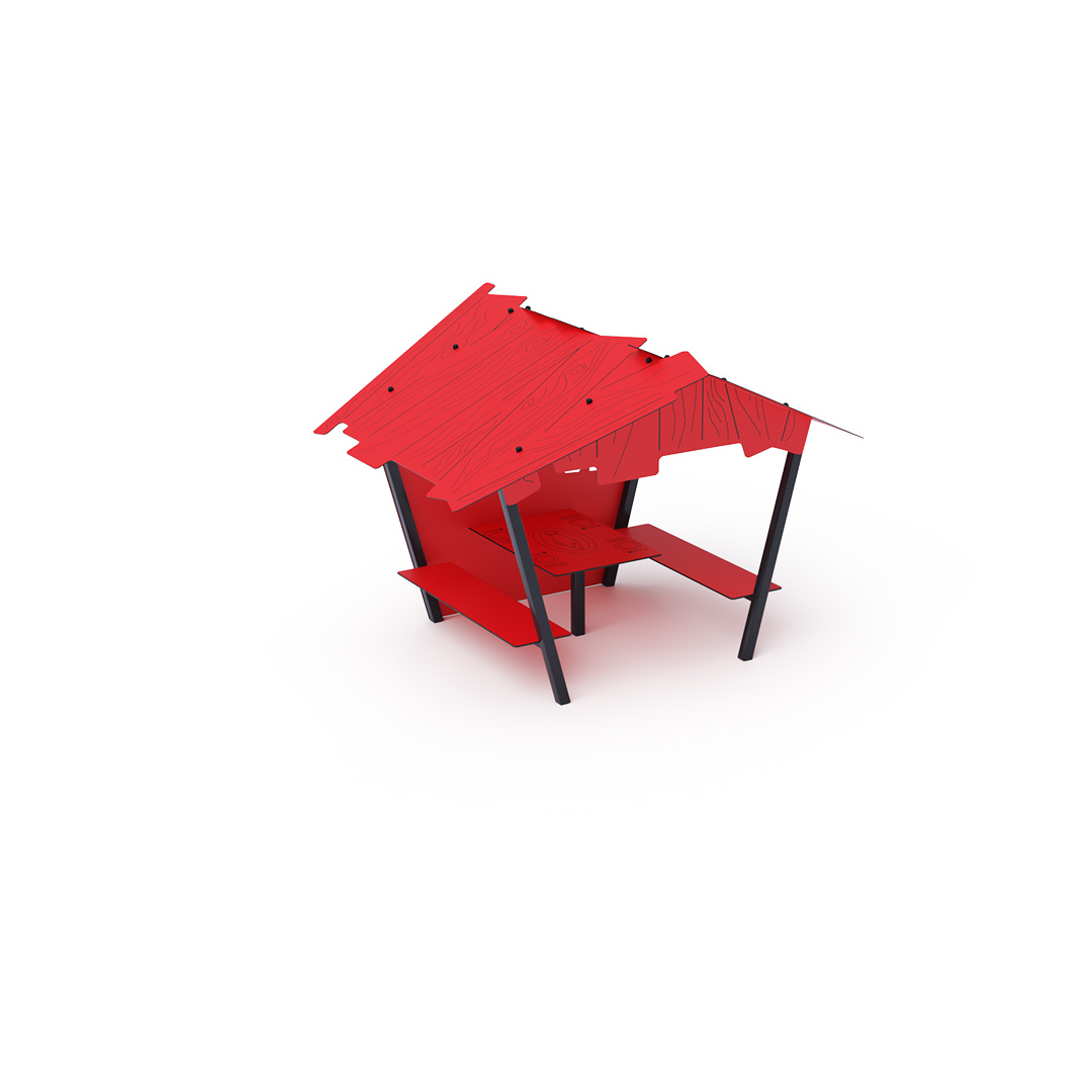 A large thematic playhouse, an ideal play set for fostering children's imagination. The house, with an A-shaped roof featuring a wood pattern, includes two benches for seating, a table with a lunch motif where children can learn basic table manners, and a rear wall with a log cabin motif. The construction of the playhouse is made from galvanized and powder-coated steel. All boards are made from HPL material with UV protection, which is color-fast, non-toxic, and shatterproof. All joints are stainless steel and covered with plastic caps.