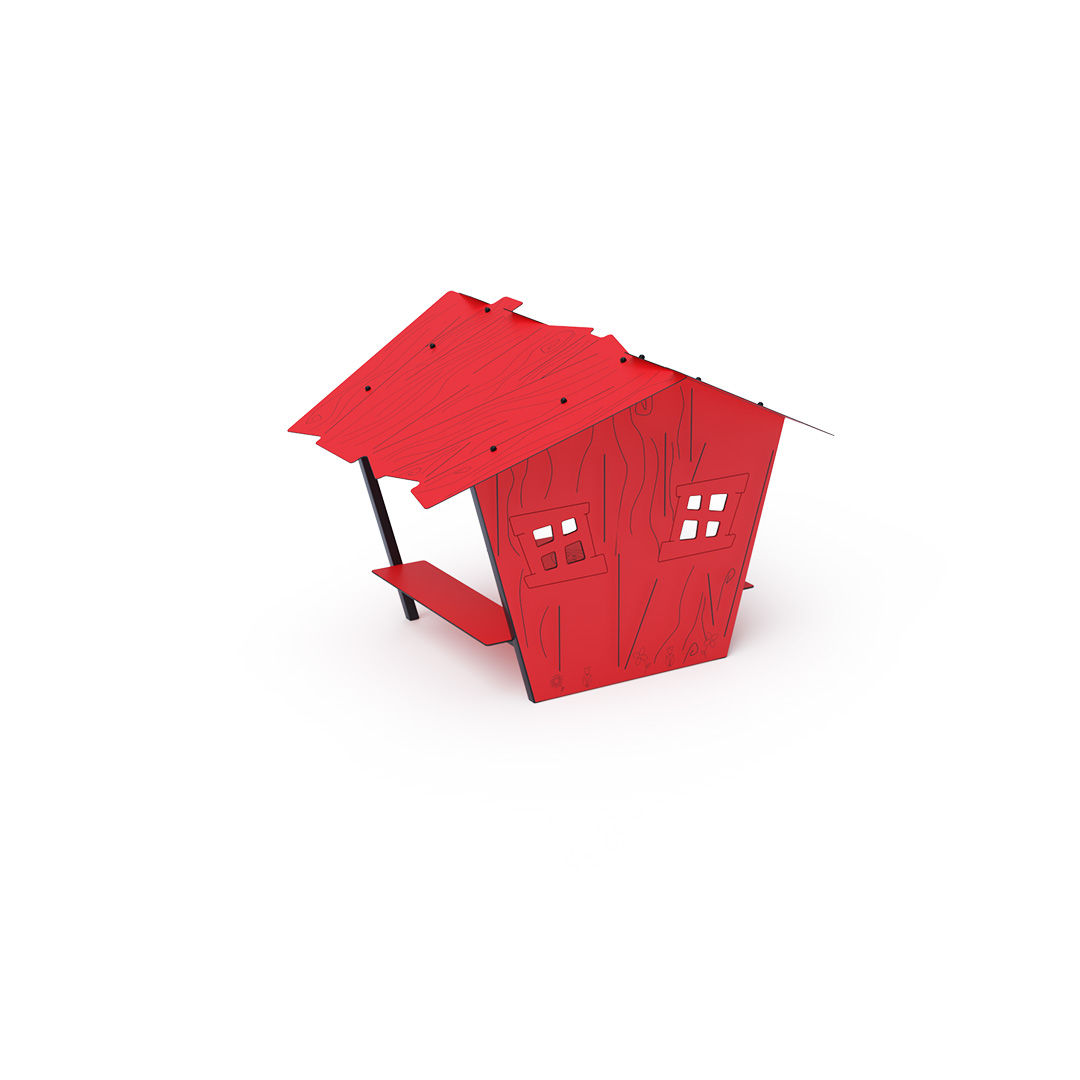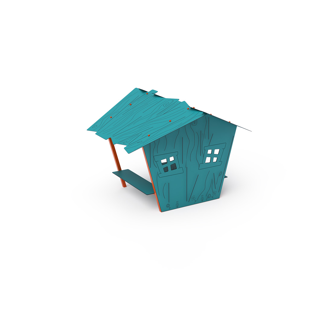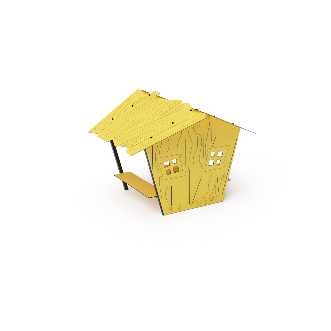 A large thematic playhouse, an ideal play set for fostering children's imagination. The house, with an A-shaped roof featuring a wood pattern, includes two benches for seating, a table with a lunch motif where children can learn basic table manners, and a rear wall with a log cabin motif. The construction of the playhouse is made from galvanized and powder-coated steel. All boards are made from HPL material with UV protection, which is color-fast, non-toxic, and shatterproof. All joints are stainless steel and covered with plastic caps.