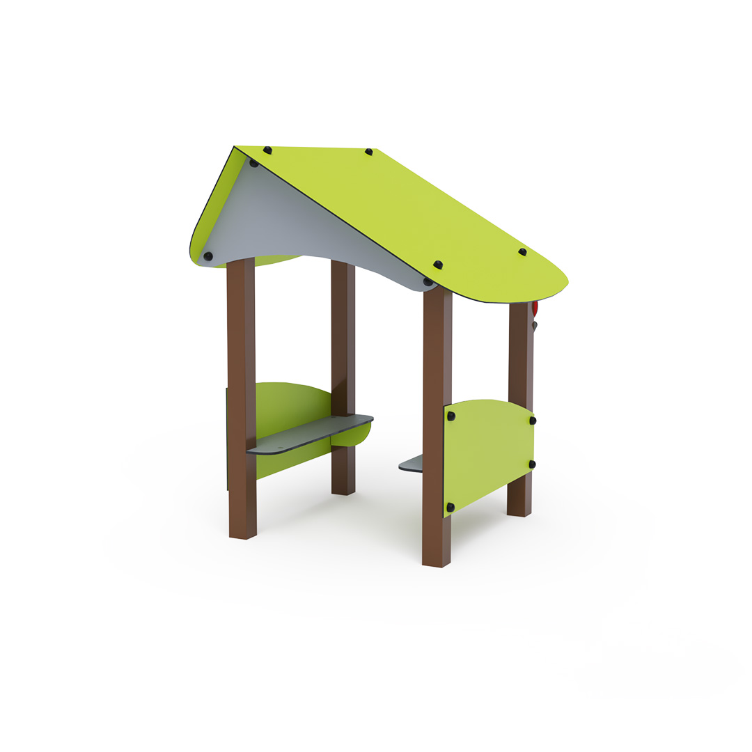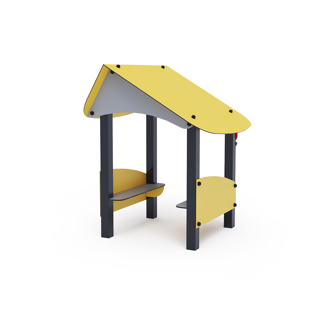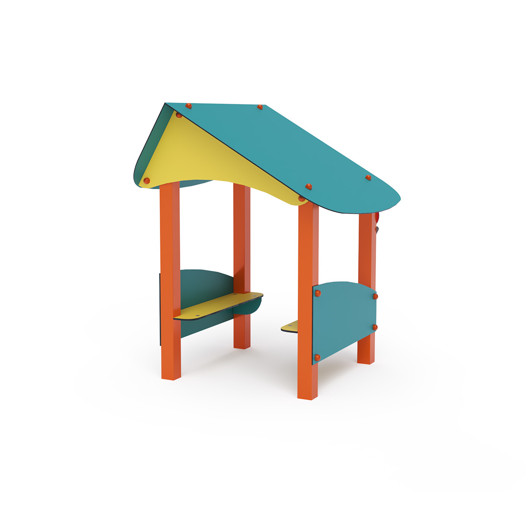 Small house, ideal playground equipment for kindergartens.The structure of the house is made of galvanized and powder-coated steel. All boards are made of HPL material with UV protection, which is color-stable, non-toxic, and non-breakable. All joints are stainless steel and covered with plastic caps.