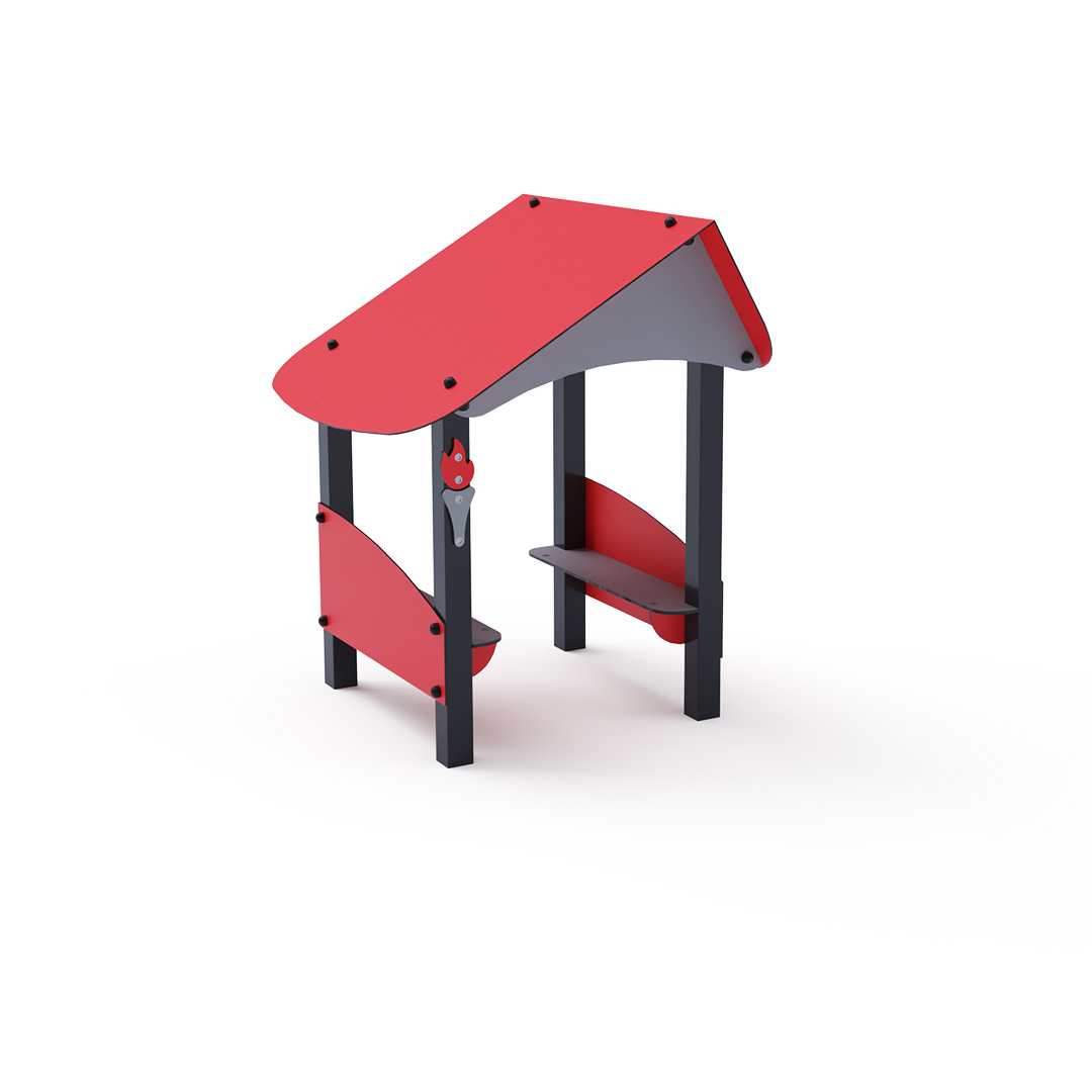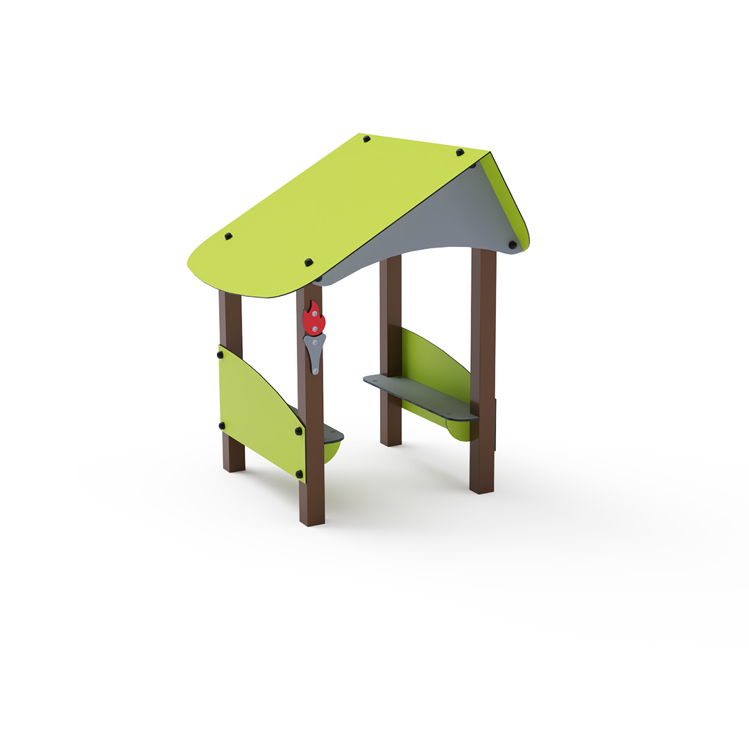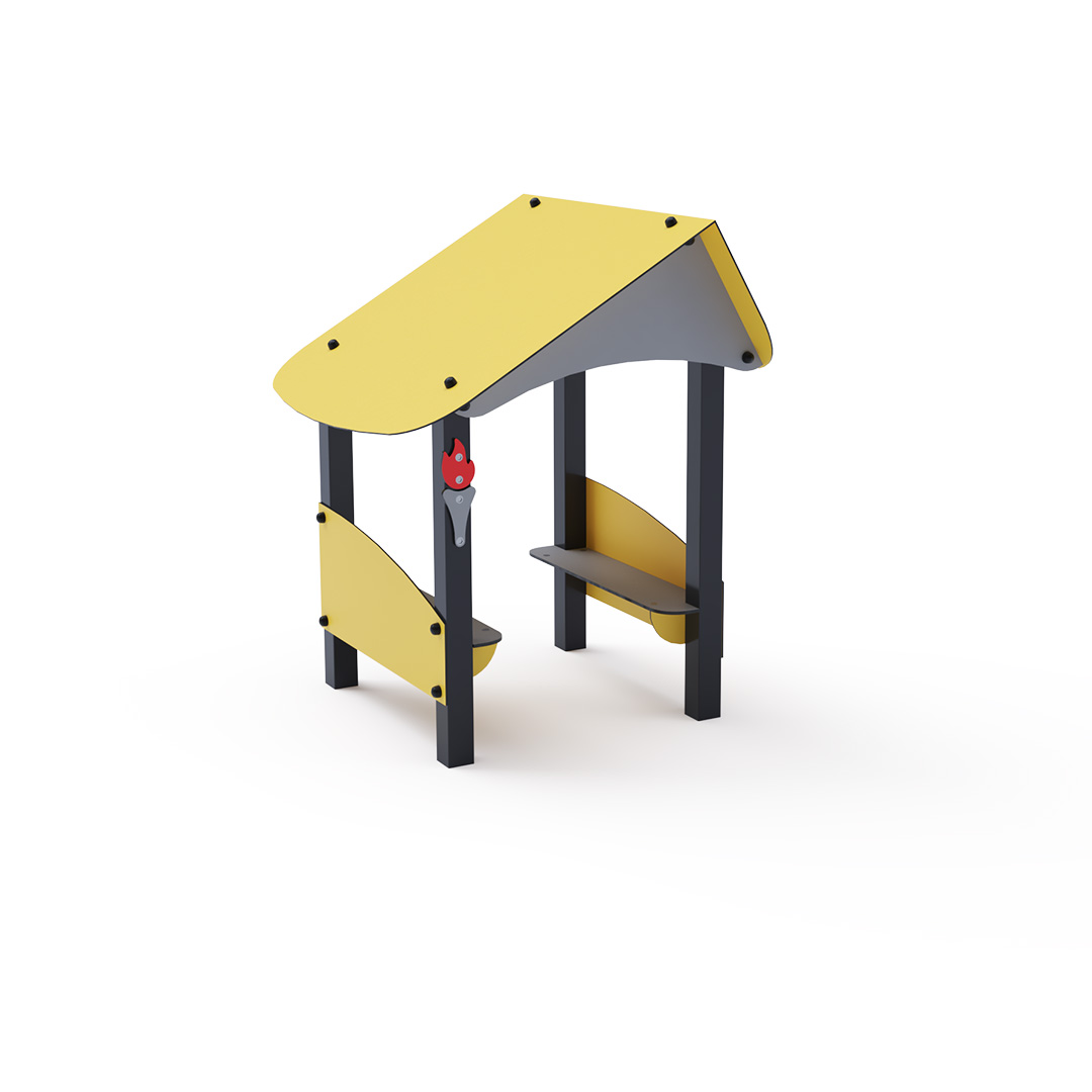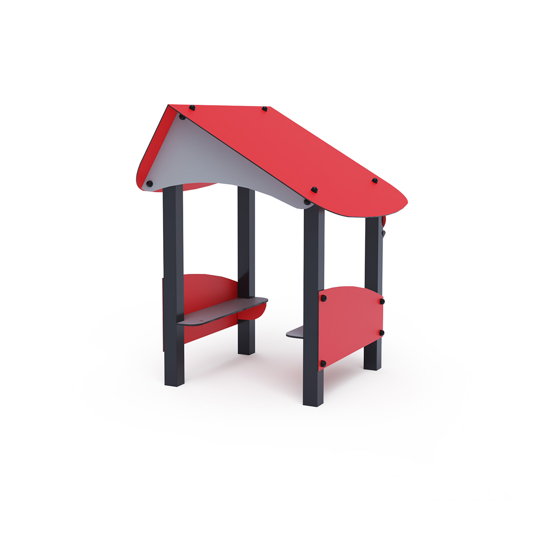 Small house, ideal playground equipment for kindergartens.The structure of the house is made of galvanized and powder-coated steel. All boards are made of HPL material with UV protection, which is color-stable, non-toxic, and non-breakable. All joints are stainless steel and covered with plastic caps.