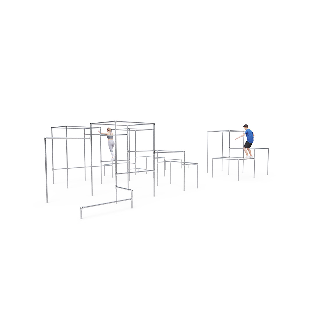 Parkour is a discipline based on the ability to overcome obstacles safely, smoothly, and effectively using one’s own body, with an emphasis on practical strength, endurance, and balance. Creativity, fluidity, and precision in overcoming obstacles are also crucial components. The VVZ-PP009 parkour playground is a large setup in terms of the number of obstacles. It includes forty-four bars of varying heights and provides a training space for both complete beginners and more experienced traceurs.The steel construction is weather-resistant thanks to hot-dip galvanization.