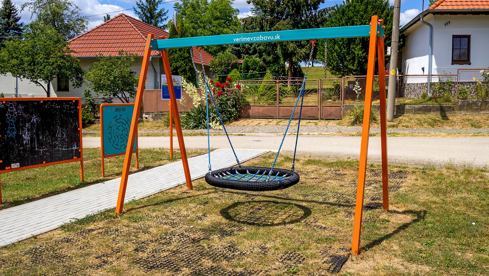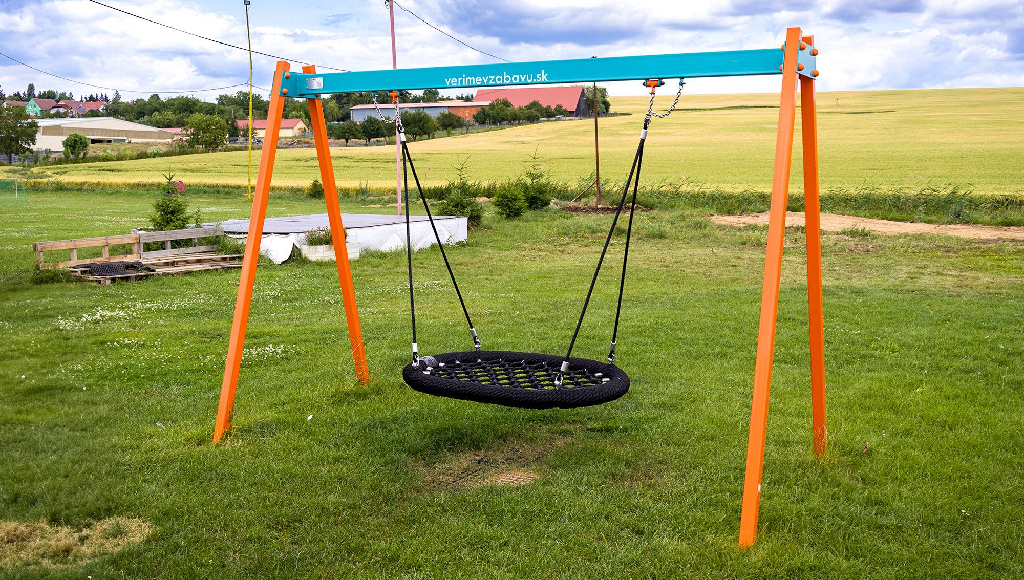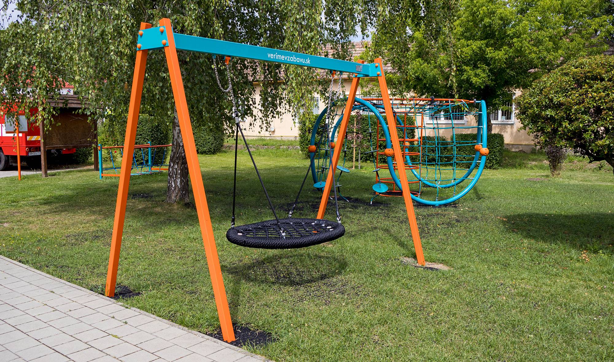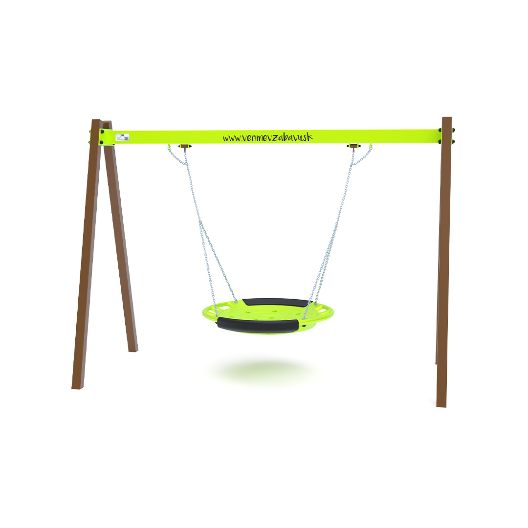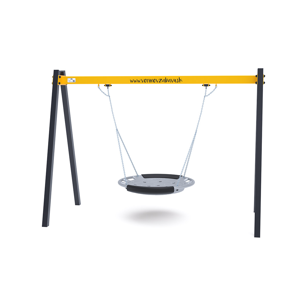 The hanging swing with a nest for 5 children is made from hot-dip galvanized steel, which is coated with powder-baked paint. The connecting materials are stainless steel and covered with plastic caps to increase durability and safety. The VVZ-VH005 swing is certified according to the STN EN 1176 standard. It is recommended to use a grass mat as the impact surface.
