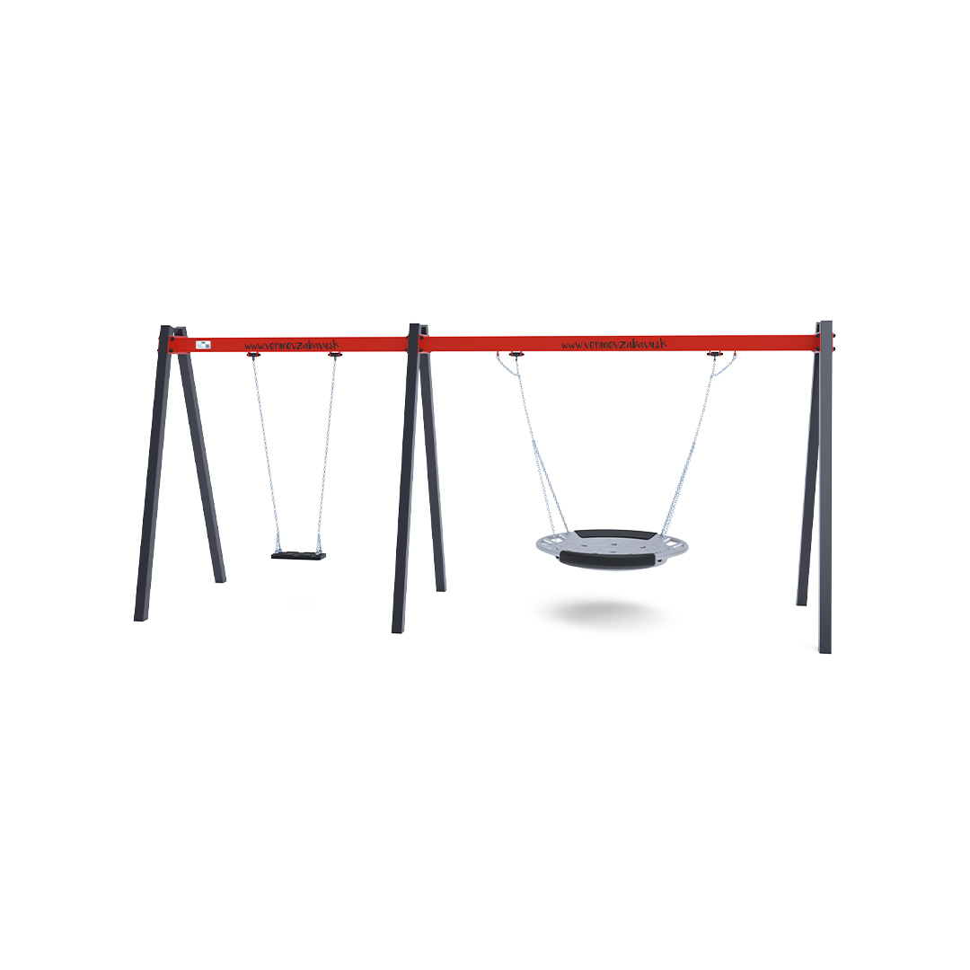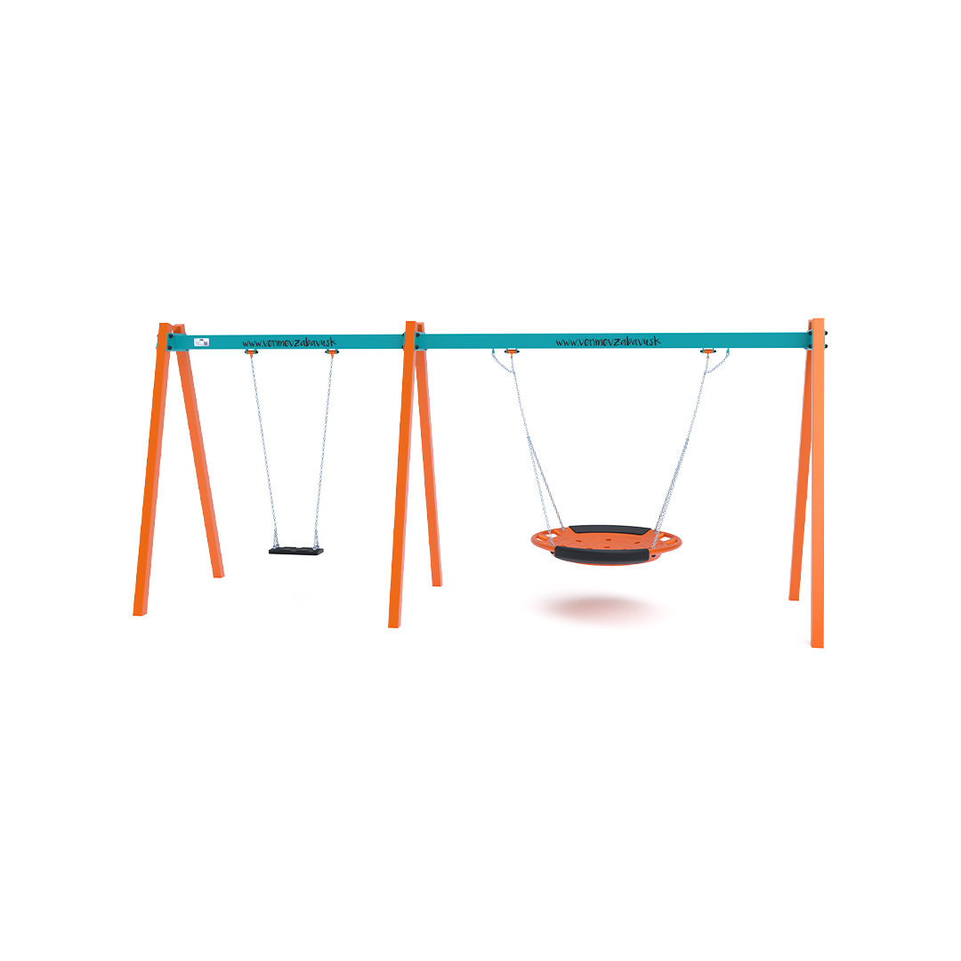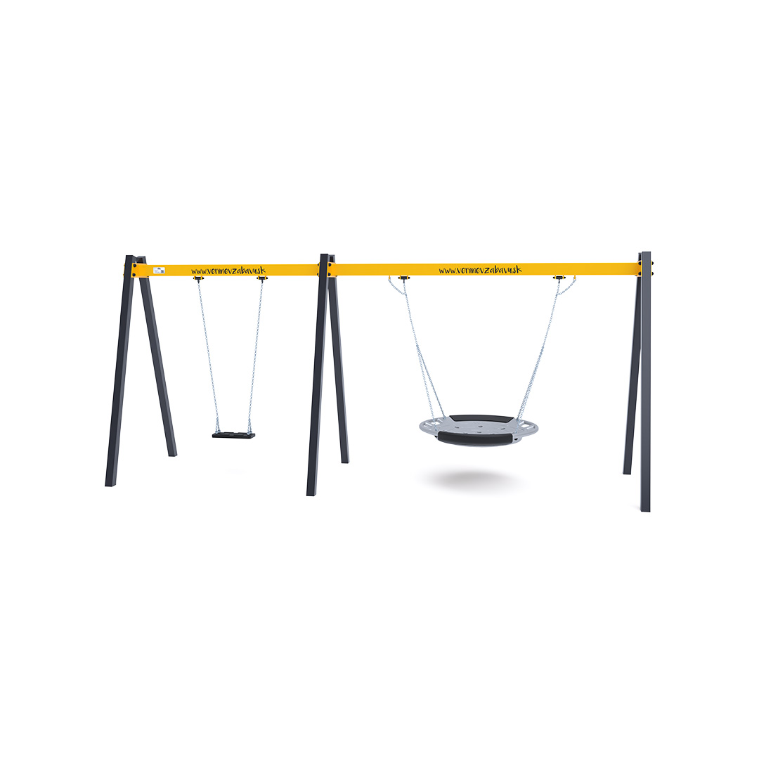 The hanging swing with a classic/baby seat and a nest seat. It is made of hot-dip galvanized steel, which is coated with powder-coated baked paint. The connecting materials are stainless steel and covered with plastic caps to increase durability and safety. The VVZ-VH009-1 swing is certified according to the STN EN 1176 standard. It is recommended to use a grass mat as the impact surface.