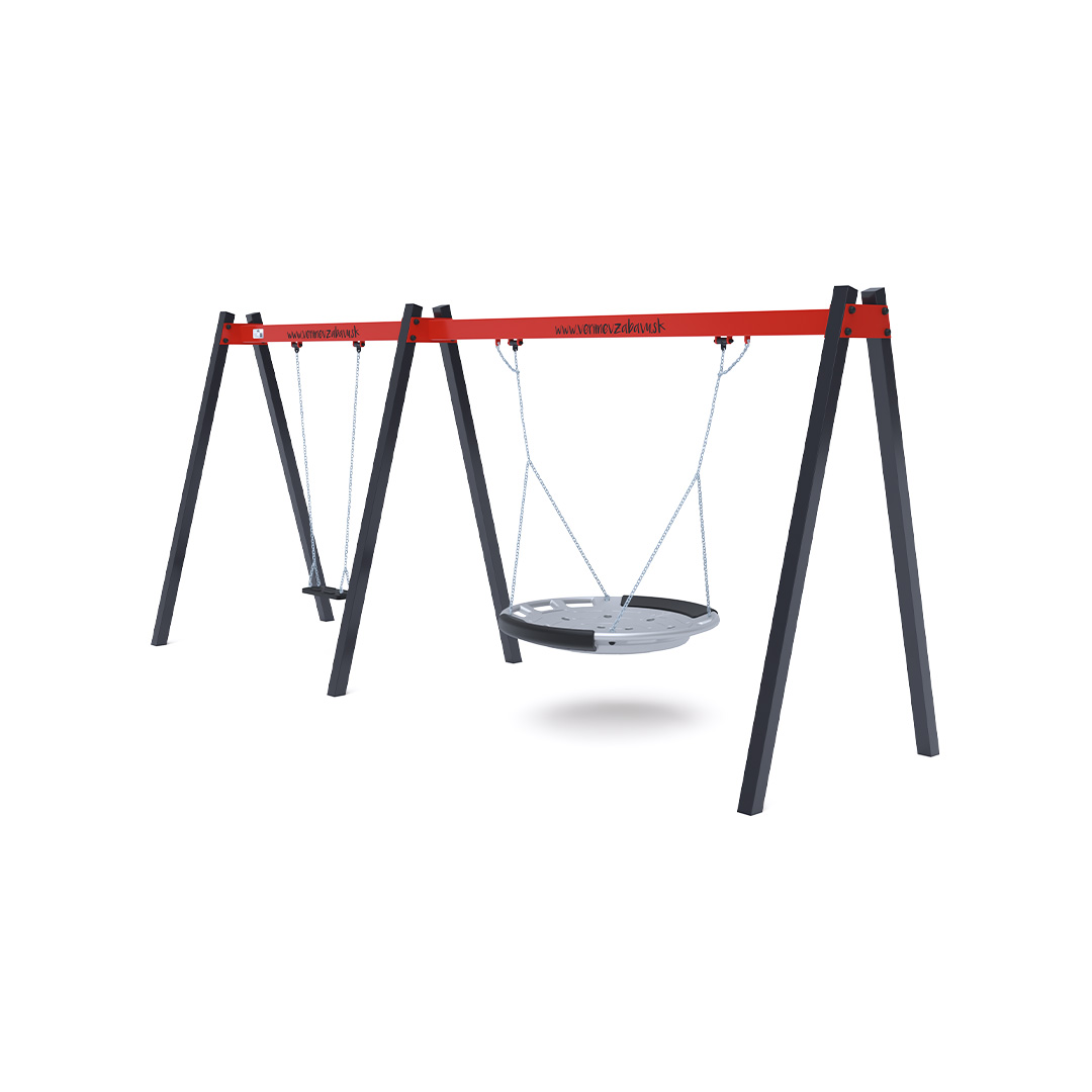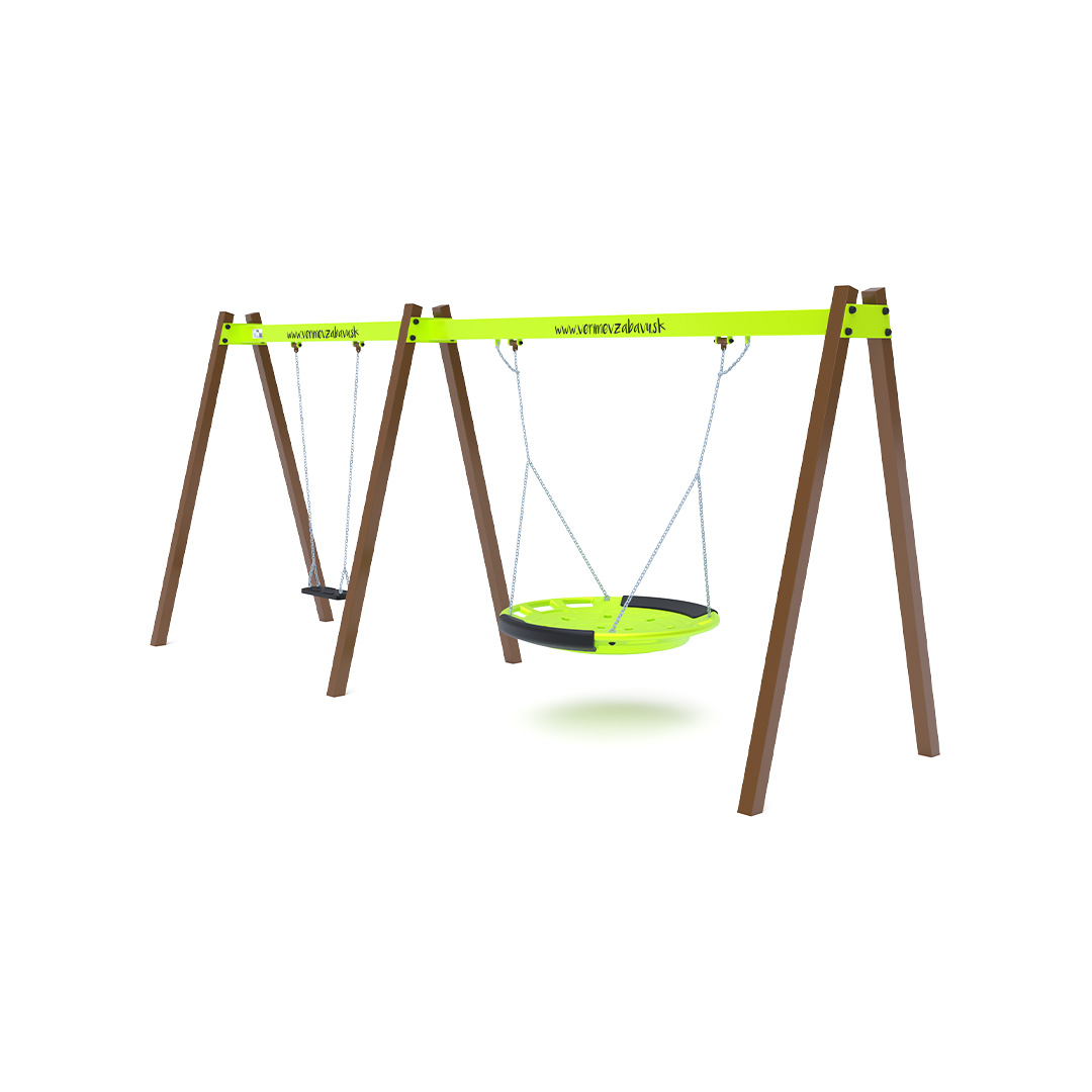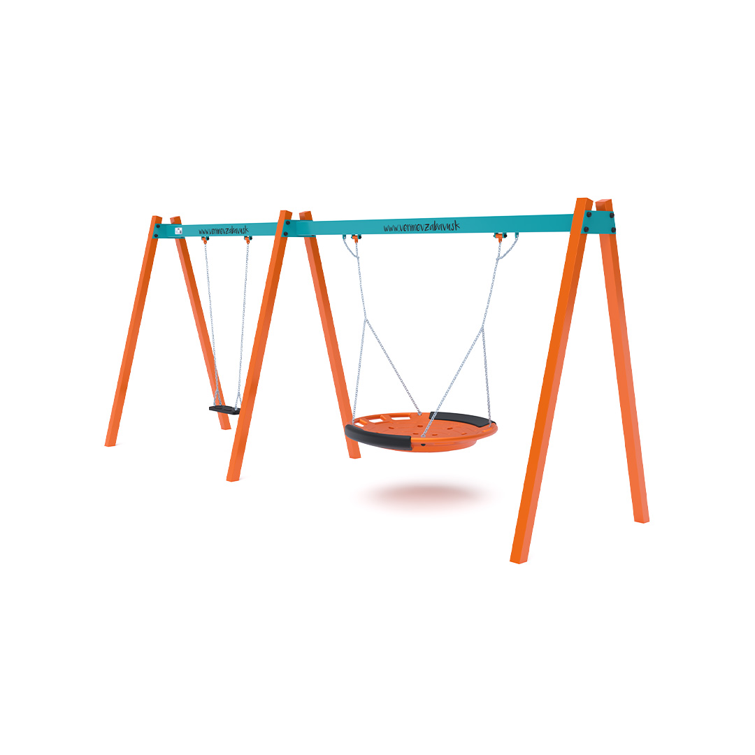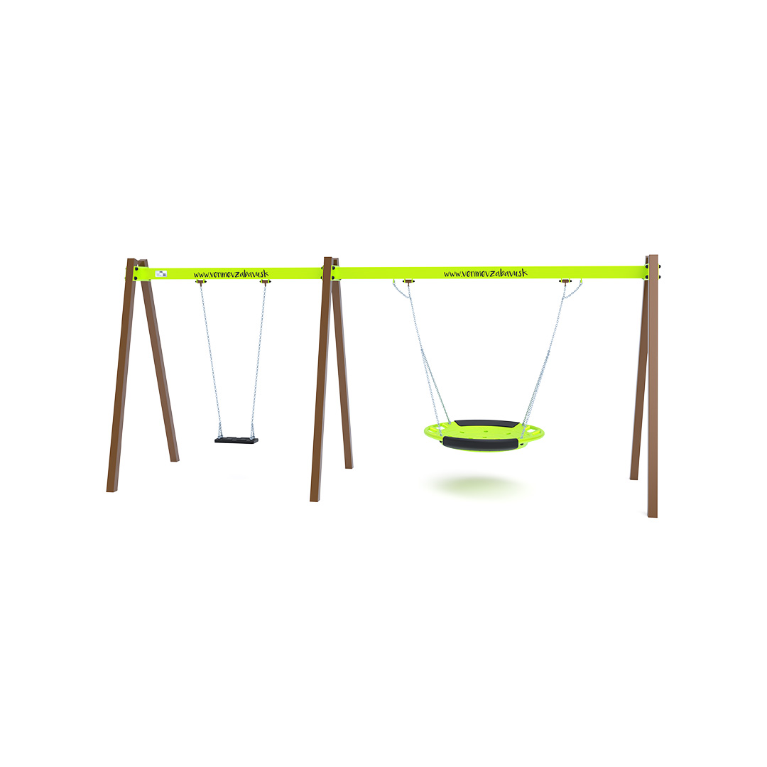 The hanging swing with a classic/baby seat and a nest seat. It is made of hot-dip galvanized steel, which is coated with powder-coated baked paint. The connecting materials are stainless steel and covered with plastic caps to increase durability and safety. The VVZ-VH009-1 swing is certified according to the STN EN 1176 standard. It is recommended to use a grass mat as the impact surface.