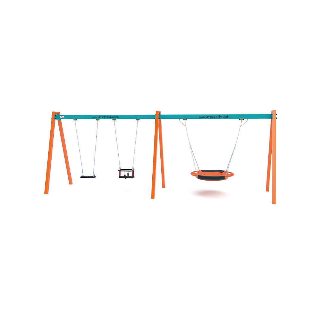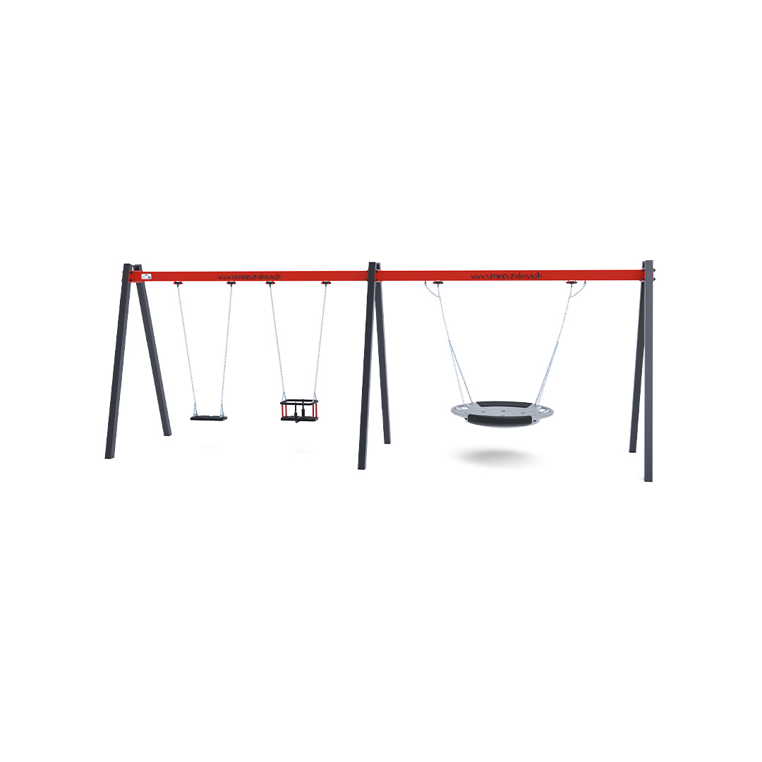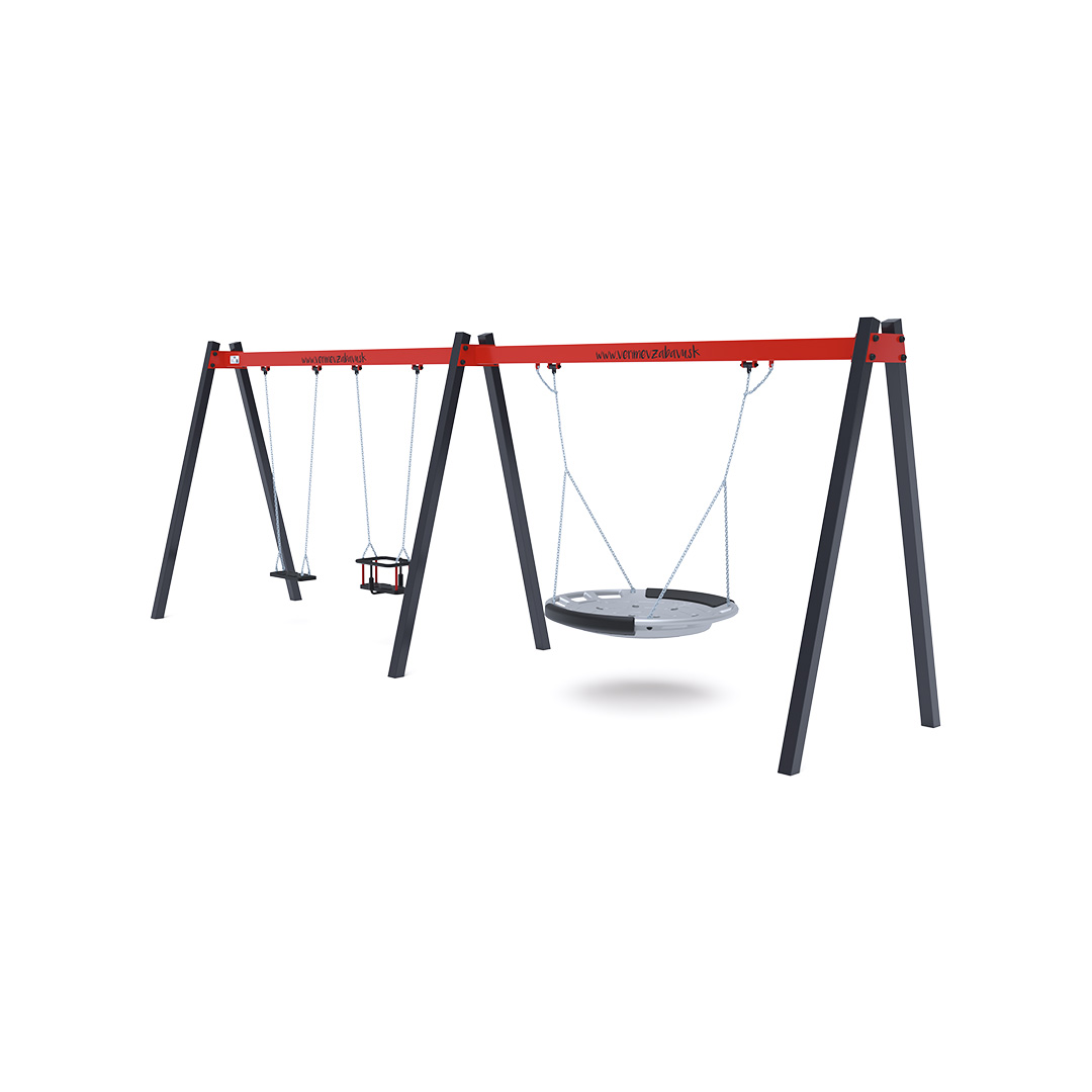 The hanging triple swing with two seats, one classic and one baby seat, is complemented by a nest seat. It is made of hot-dip galvanized steel, which is coated with powder-coated baked paint. The connecting materials are stainless steel and covered with plastic caps to increase durability and safety. The VVZ-VH009 swing is certified according to the STN EN 1176 standard. It is recommended to use a grass mat as the impact surface.