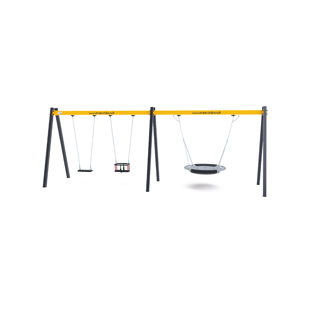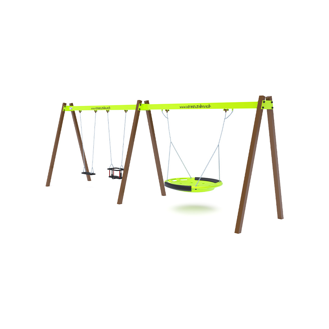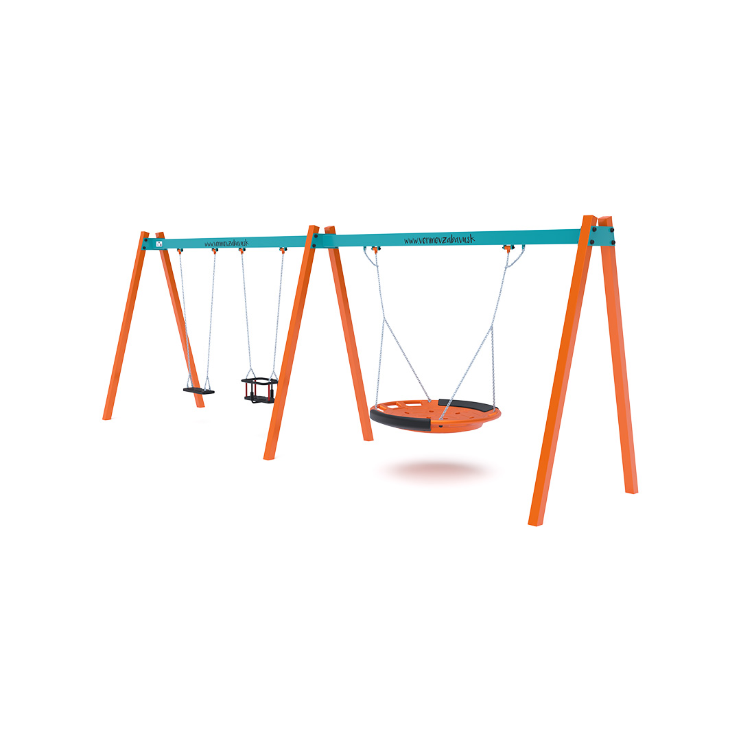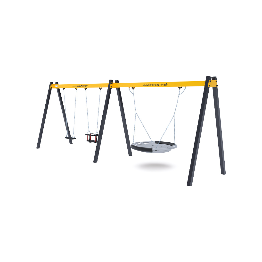 The hanging triple swing with two seats, one classic and one baby seat, is complemented by a nest seat. It is made of hot-dip galvanized steel, which is coated with powder-coated baked paint. The connecting materials are stainless steel and covered with plastic caps to increase durability and safety. The VVZ-VH009 swing is certified according to the STN EN 1176 standard. It is recommended to use a grass mat as the impact surface.