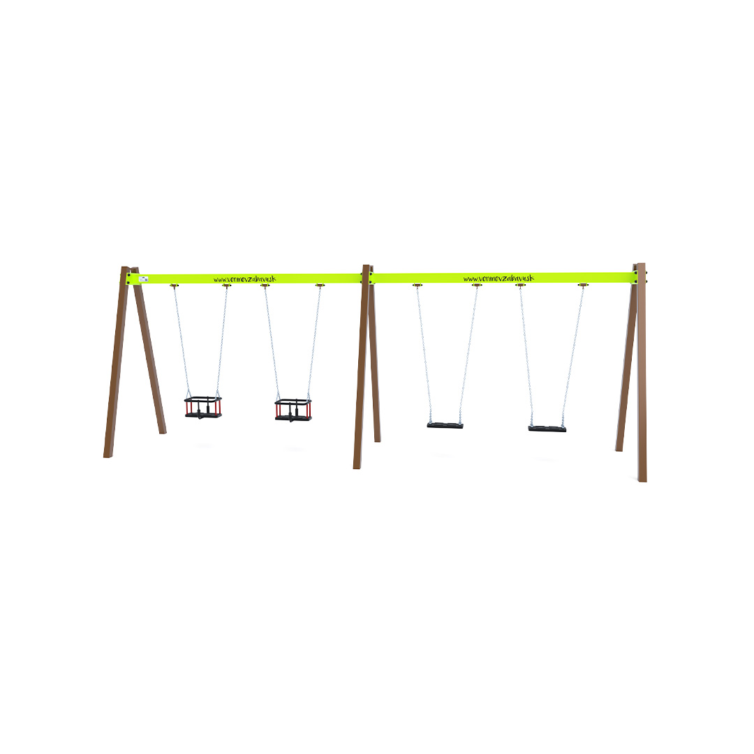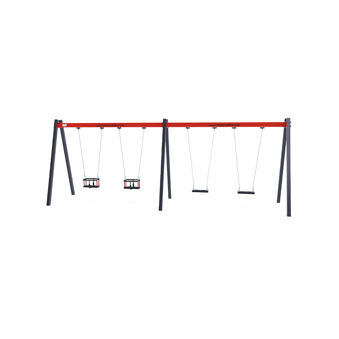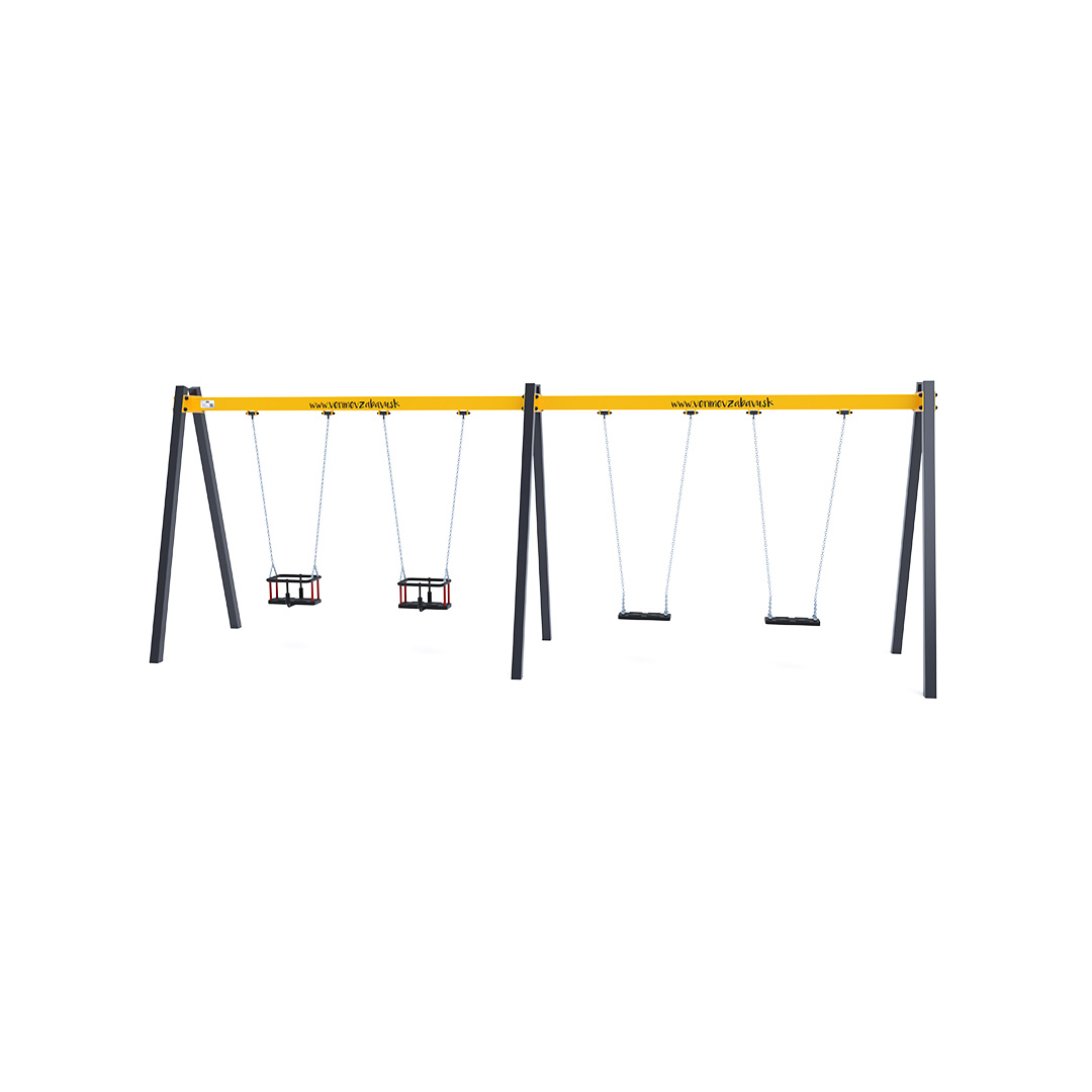 The hanging quadruple swing with seats in the configuration of 2x classic and 2x baby seats is made of hot-dip galvanized steel, which is coated with powder-coated baked paint. The connecting materials are stainless steel and covered with plastic caps to increase durability and safety. The VVZ-VH010 swing is certified according to the STN EN 1176 standard. It is recommended to use a grass mat as the impact surface.