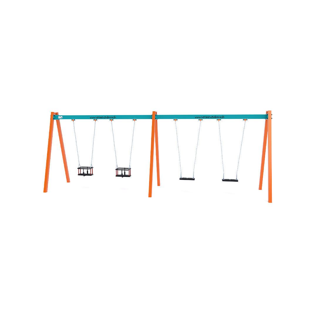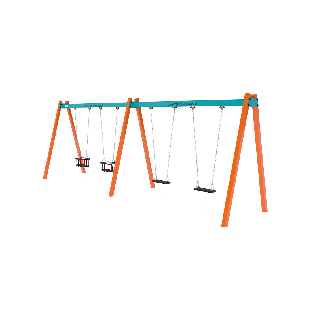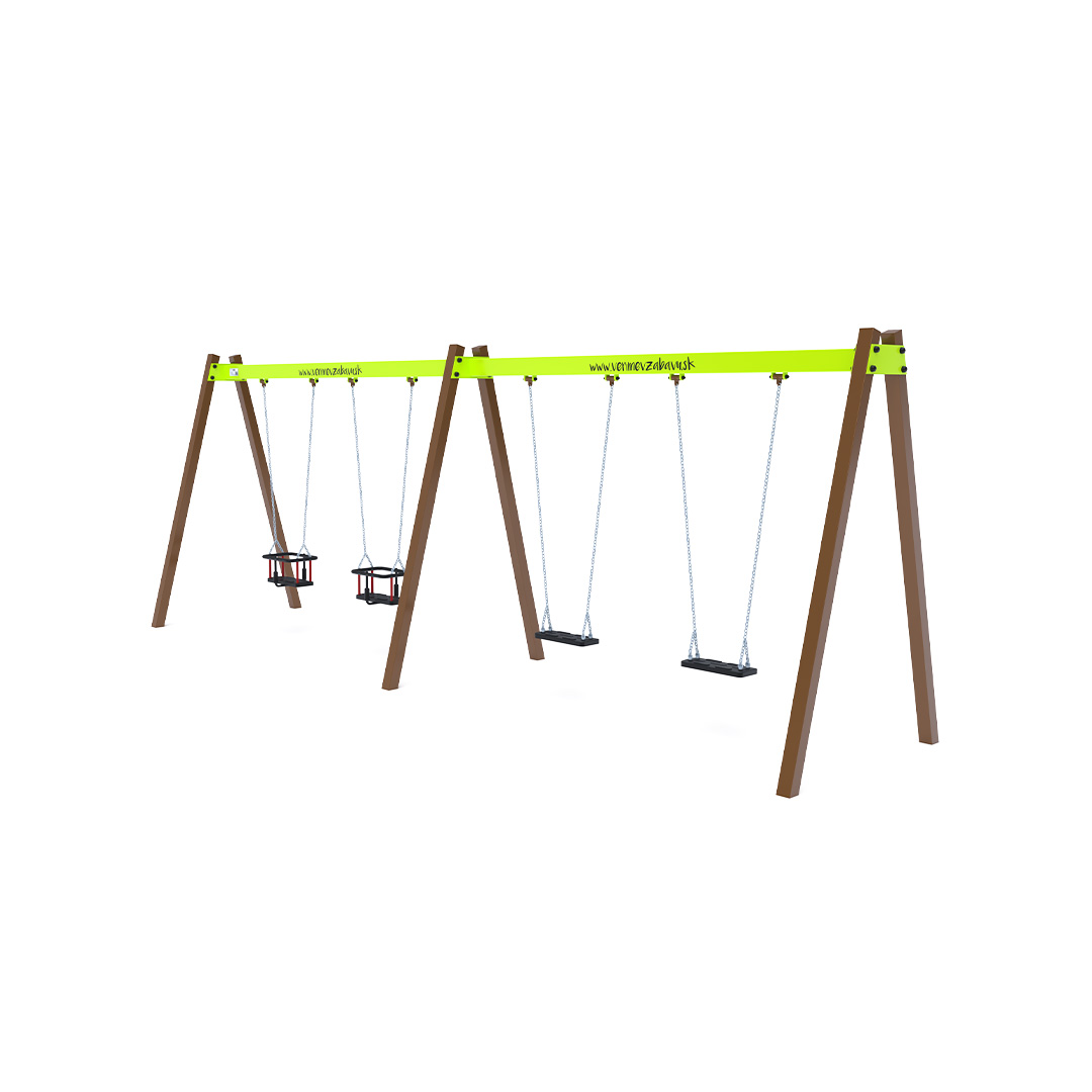 The hanging quadruple swing with seats in the configuration of 2x classic and 2x baby seats is made of hot-dip galvanized steel, which is coated with powder-coated baked paint. The connecting materials are stainless steel and covered with plastic caps to increase durability and safety. The VVZ-VH010 swing is certified according to the STN EN 1176 standard. It is recommended to use a grass mat as the impact surface.