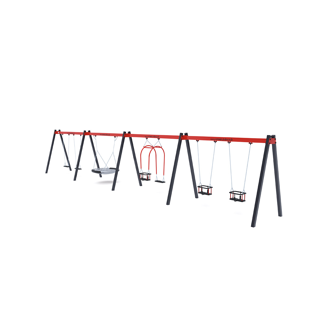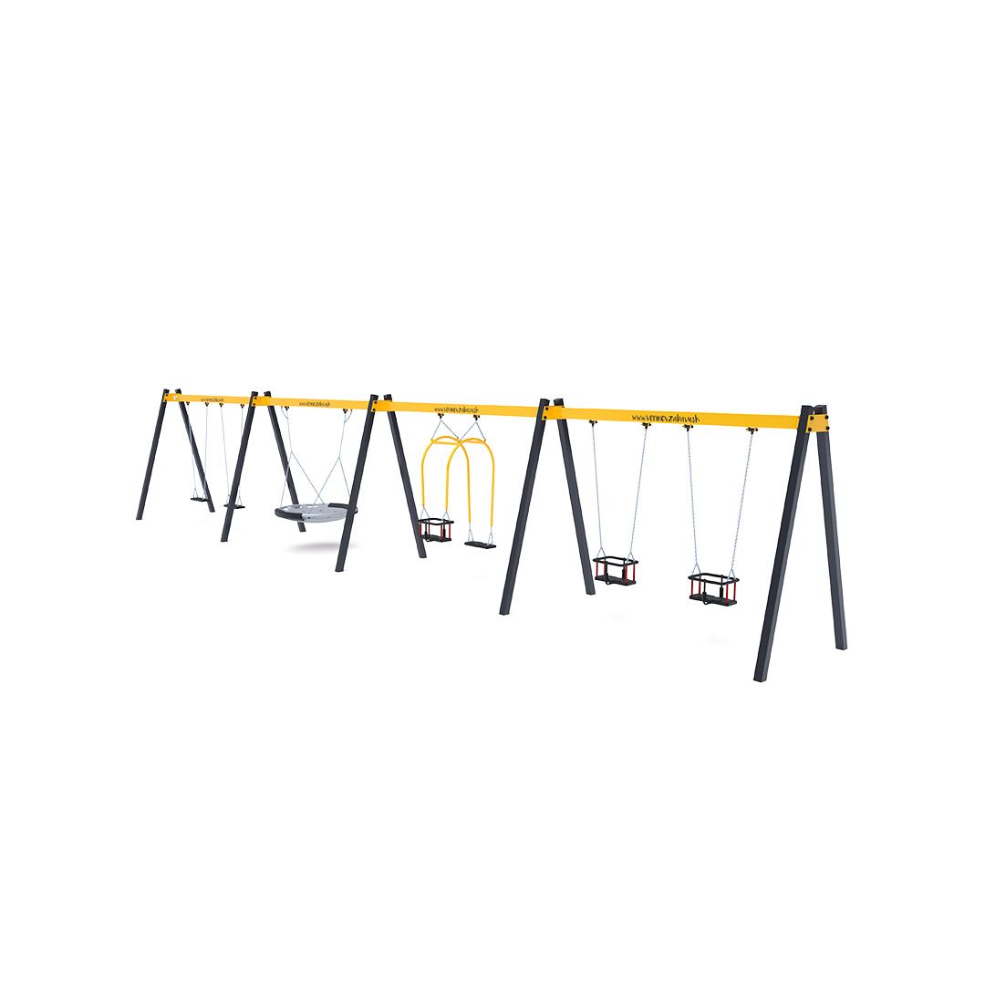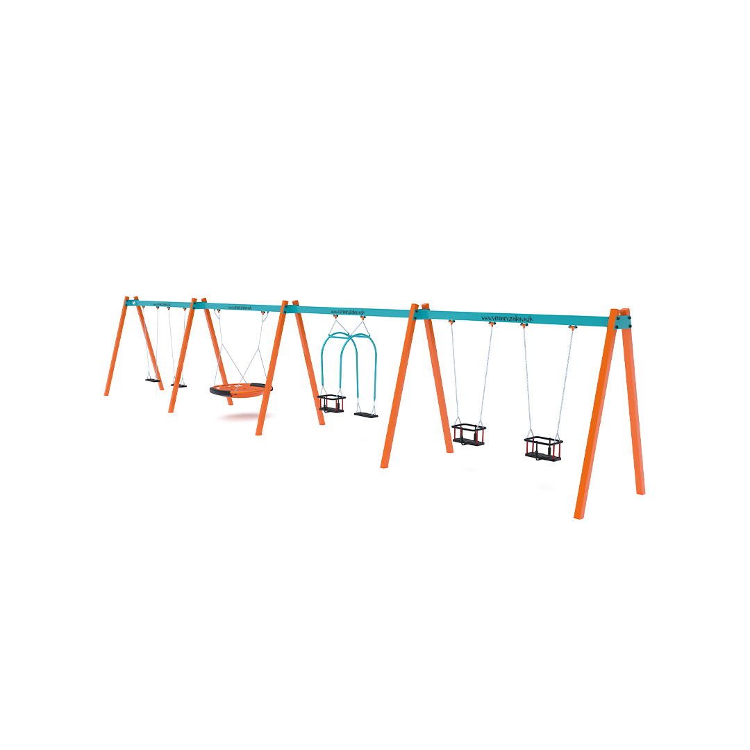 The hanging swing with all types of seats - 2x classic, 2x baby seats, and a nest seat - is complemented by a special construction for swinging mother and child. It is made of hot-dip galvanized steel, which is coated with powder-coated baked paint. The connecting materials are stainless steel and covered with plastic caps to increase durability and safety.