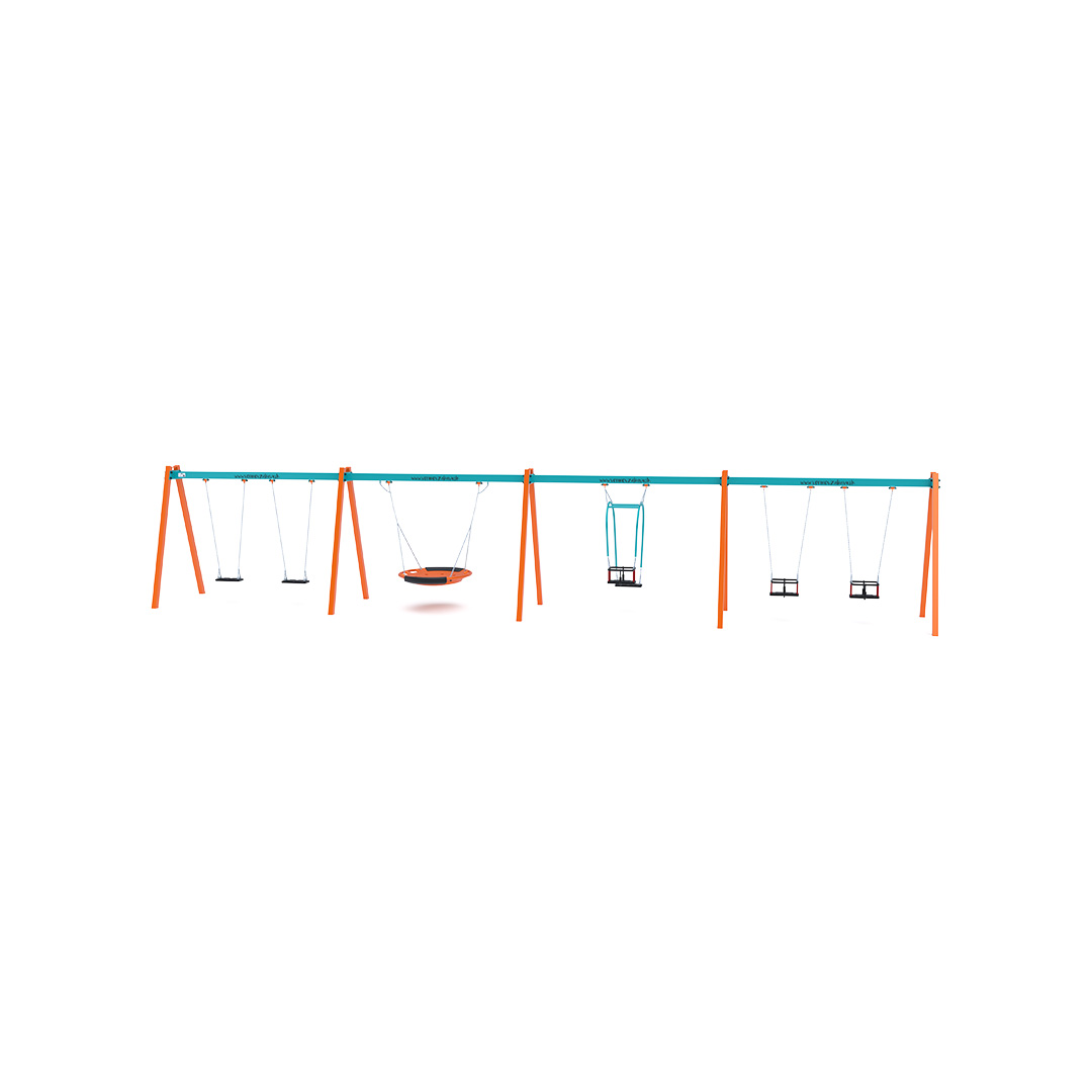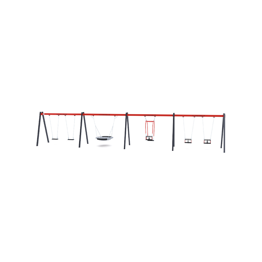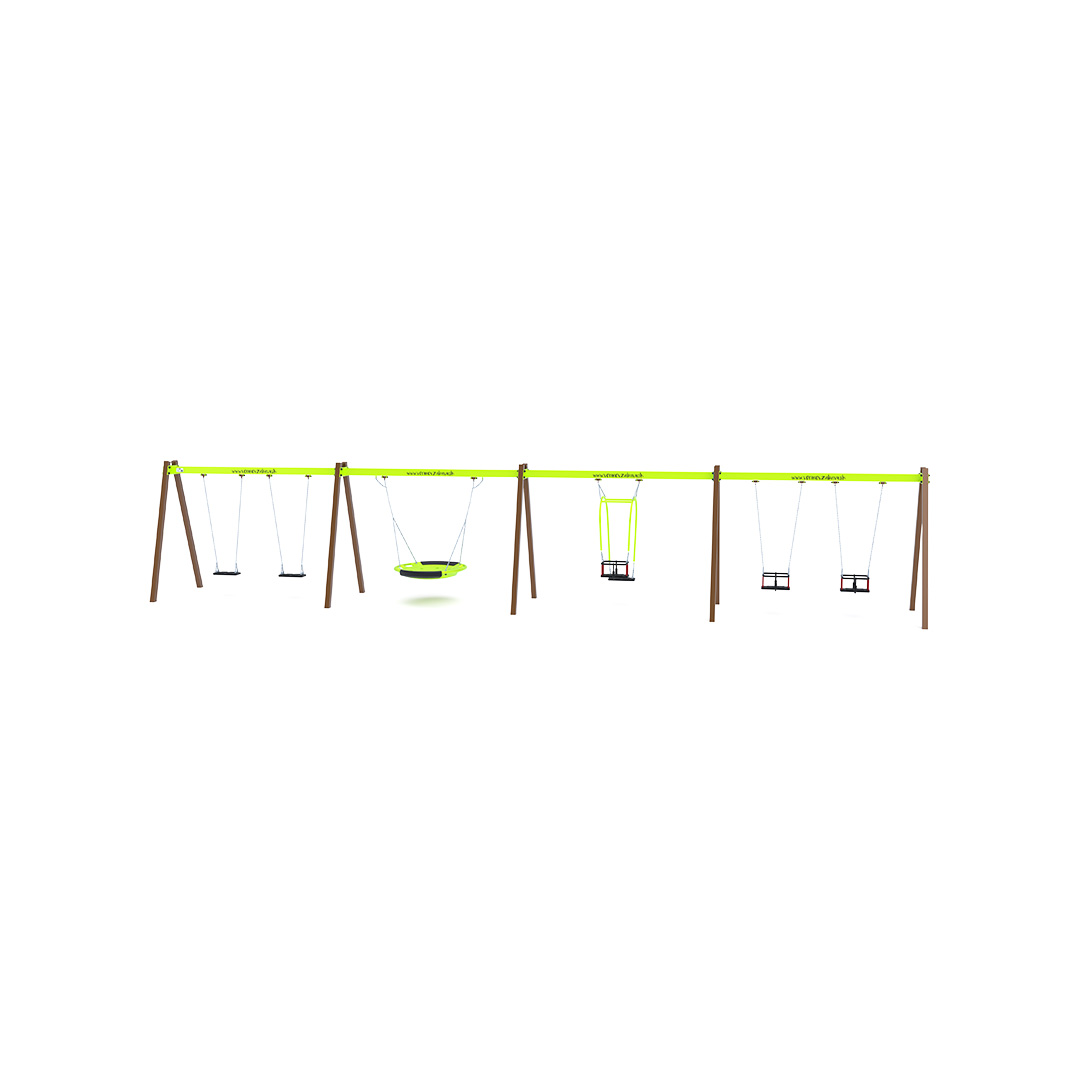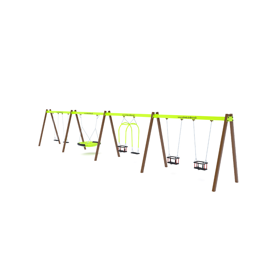 The hanging swing with all types of seats - 2x classic, 2x baby seats, and a nest seat - is complemented by a special construction for swinging mother and child. It is made of hot-dip galvanized steel, which is coated with powder-coated baked paint. The connecting materials are stainless steel and covered with plastic caps to increase durability and safety.