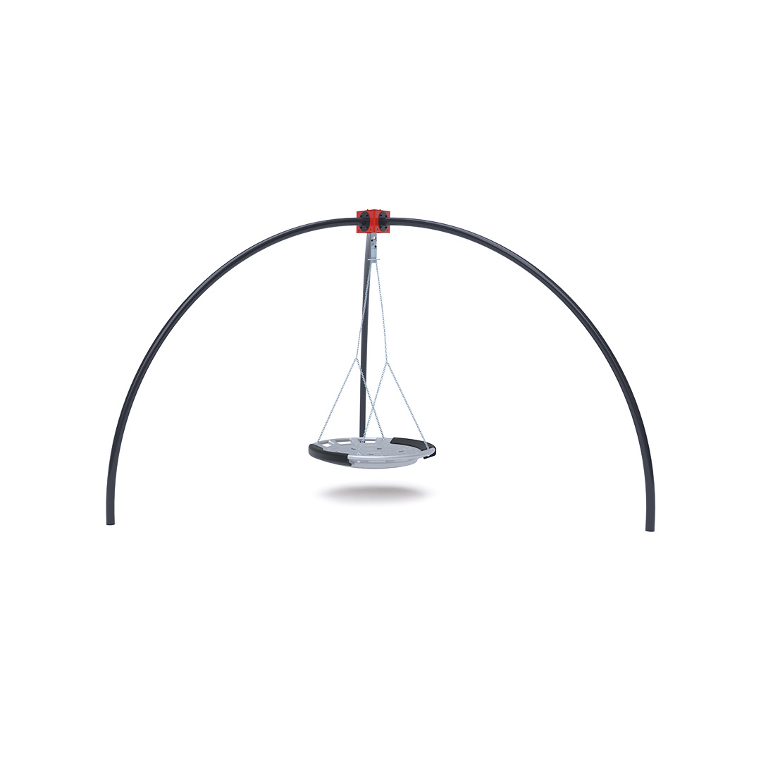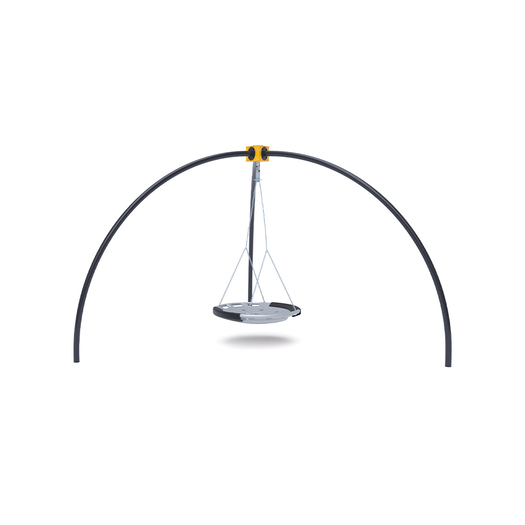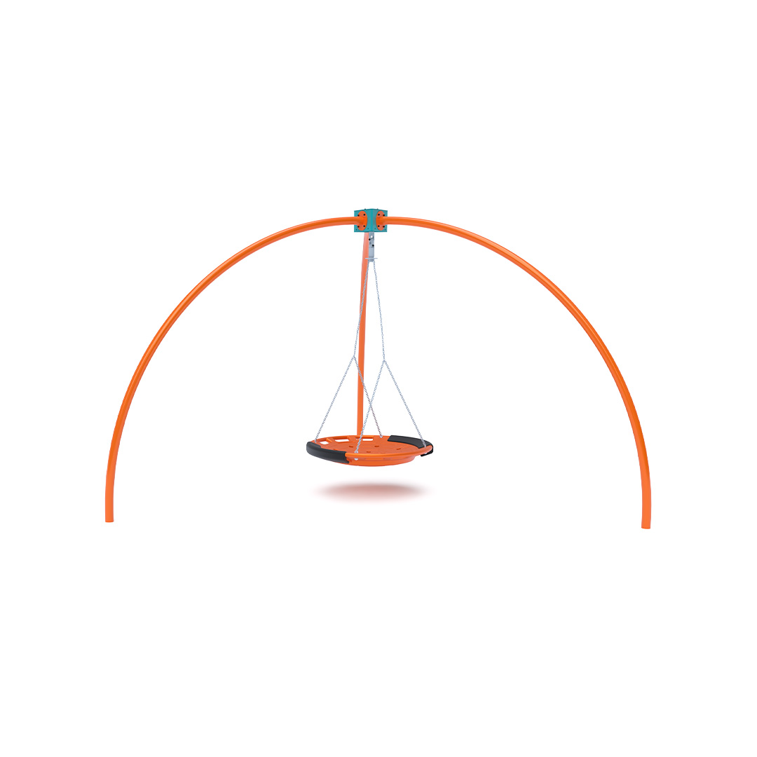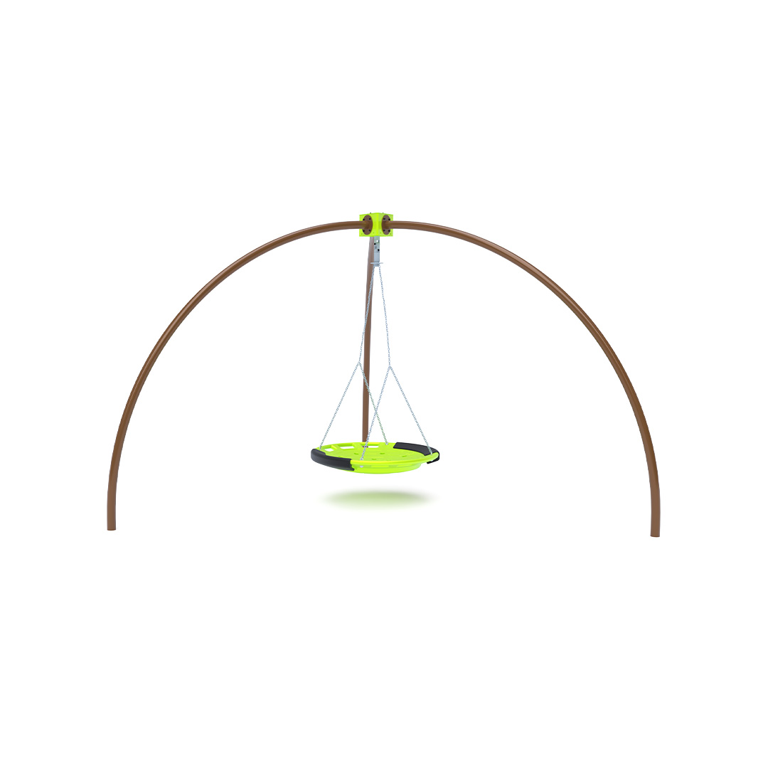 A three-legged swing set with a nest swing. It is made of hot-dip galvanized steel, which is coated with powder-coated baked paint. The connecting materials are stainless steel and covered with plastic caps to increase durability and safety.