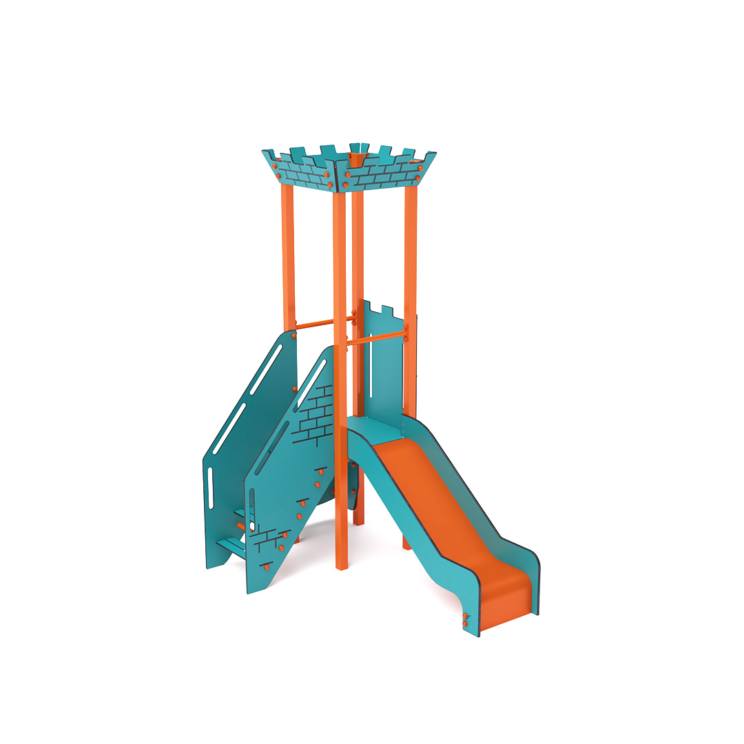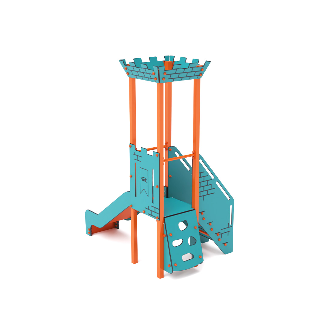 Single-tower combined mini playset – a tower with battlements that children can climb using the stairway and slide down via the slide. The turquoise-orange design invites play even from a distance. The steel structure is weather-resistant thanks to hot-dip galvanizing and a durable powder-coated finish. The HPL material used is chemically resistant, UV-stable – colorfast, non-toxic, recyclable, and unbreakable. This eliminates the risk of injury from sharp edges or fragments. All joints are made of stainless steel and covered with plastic caps to enhance durability and safety.